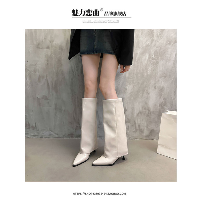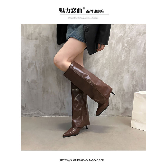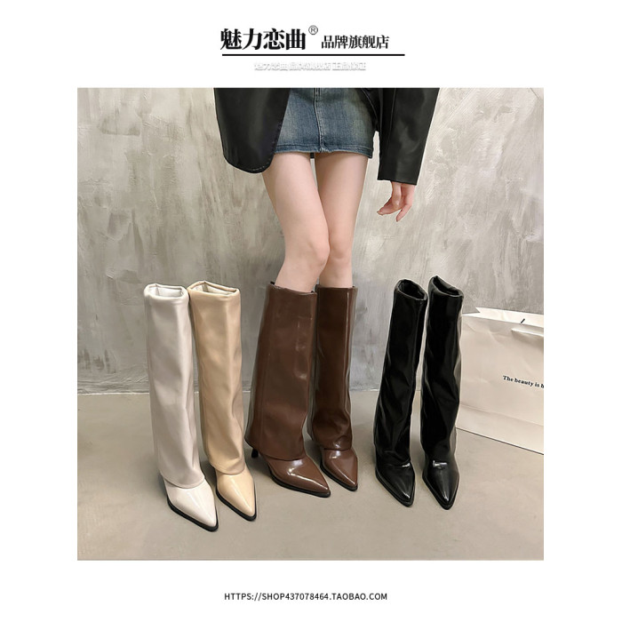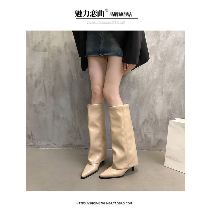 漆皮褲琯靴尖頭高筒細跟高跟長筒靴不過膝長靴子女秋冬辣妹騎士靴