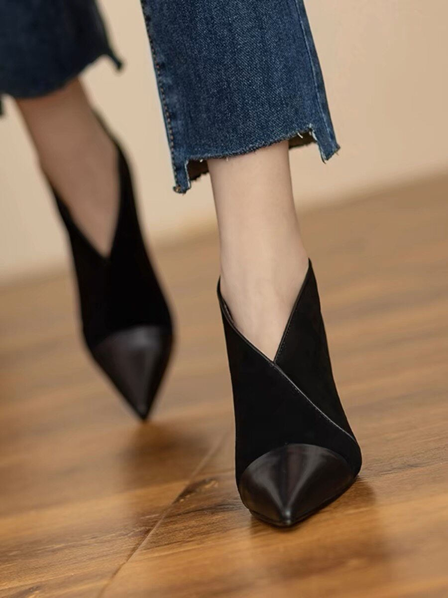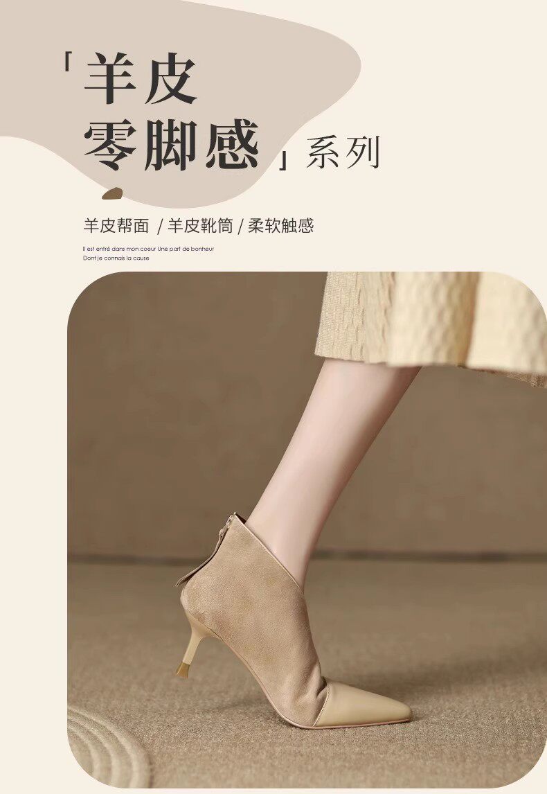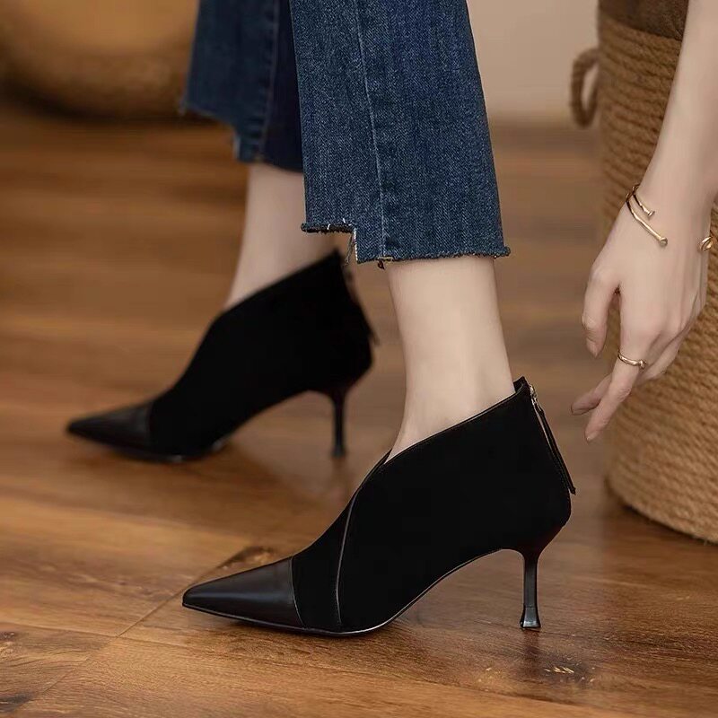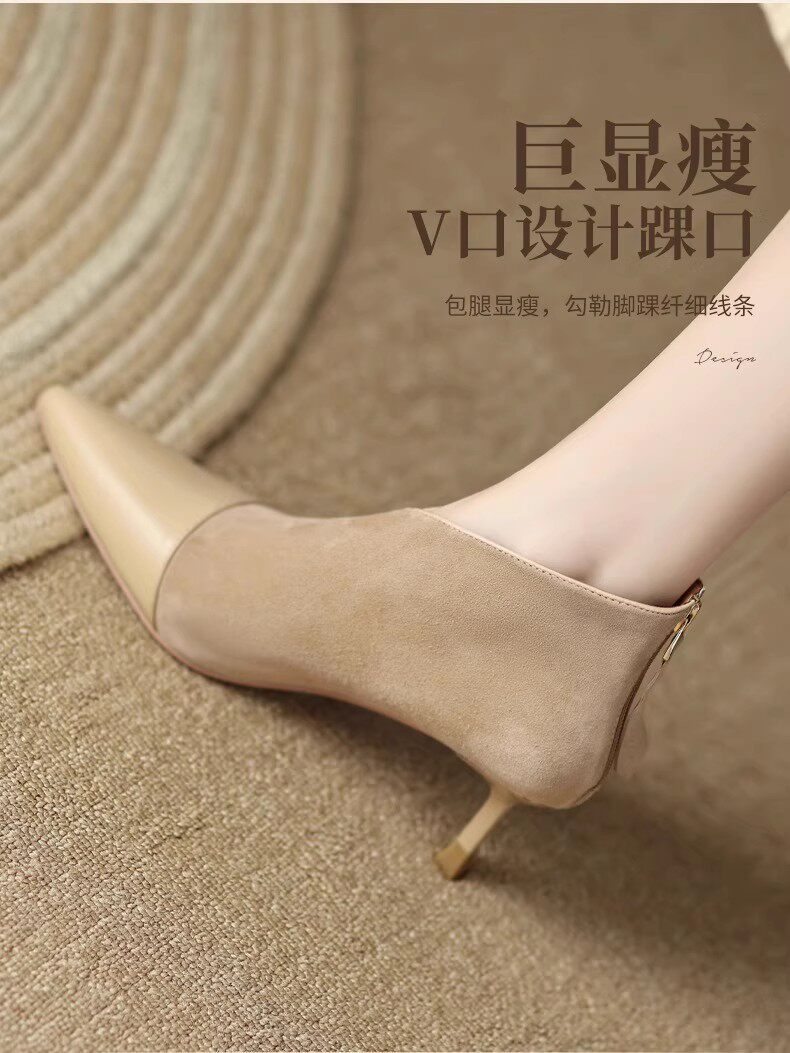 高級感法式小踝靴高跟小衆短靴女2025V口磨砂尖頭細跟裸靴高跟鞋