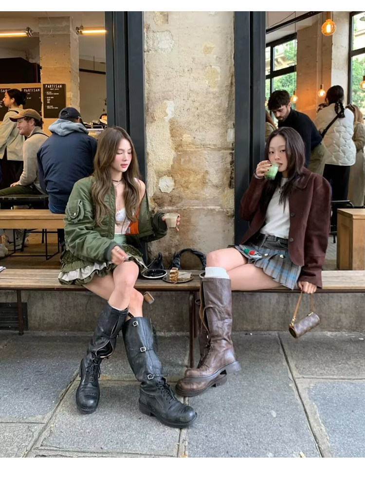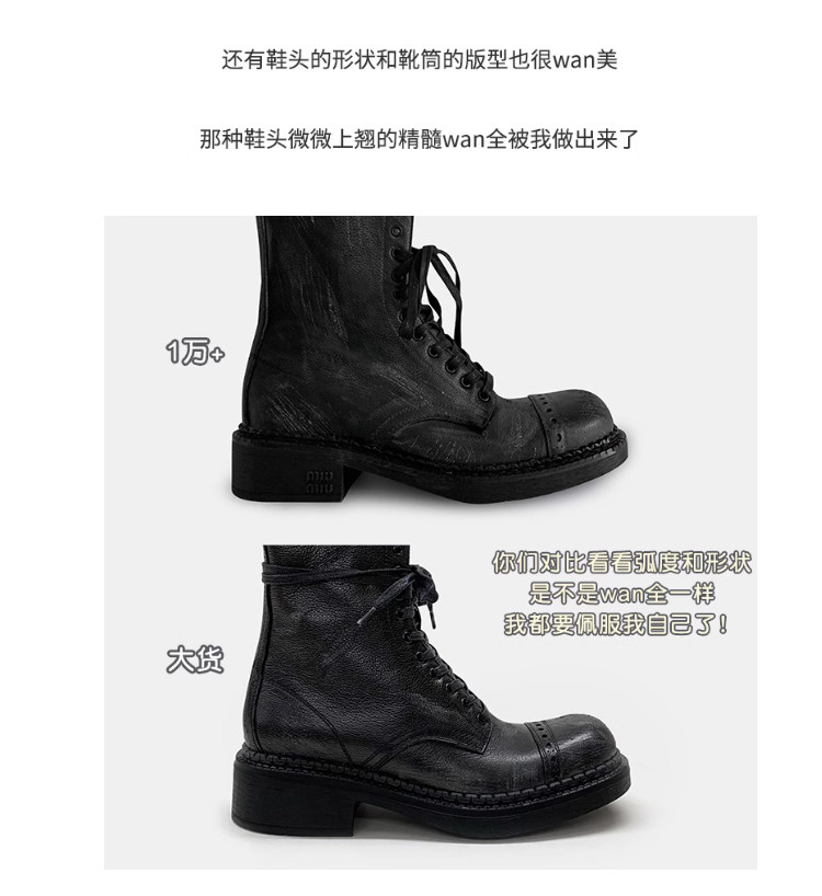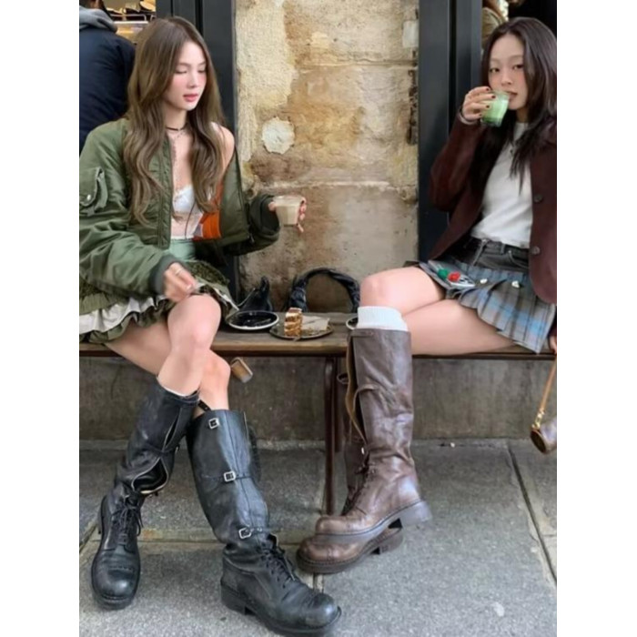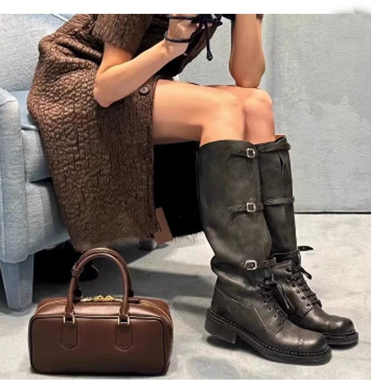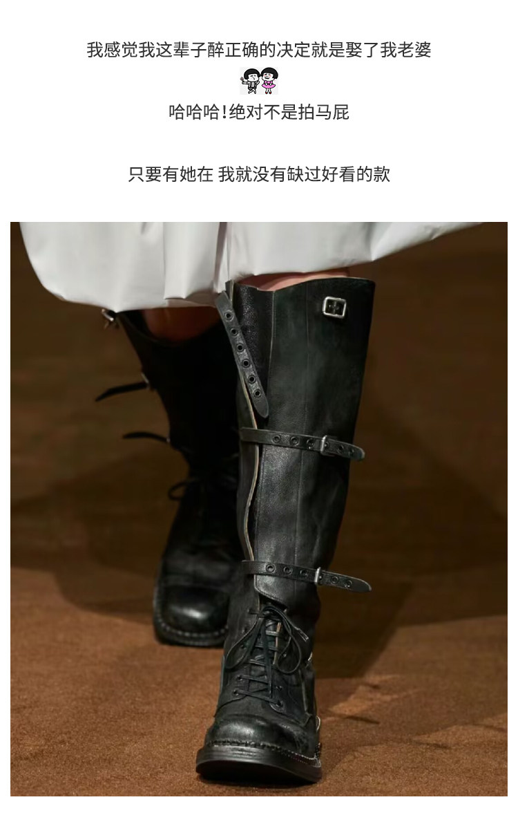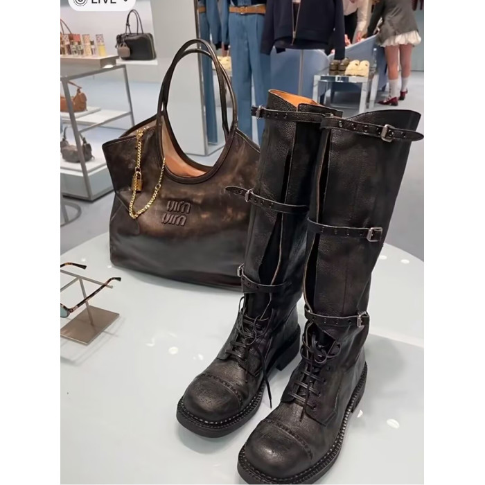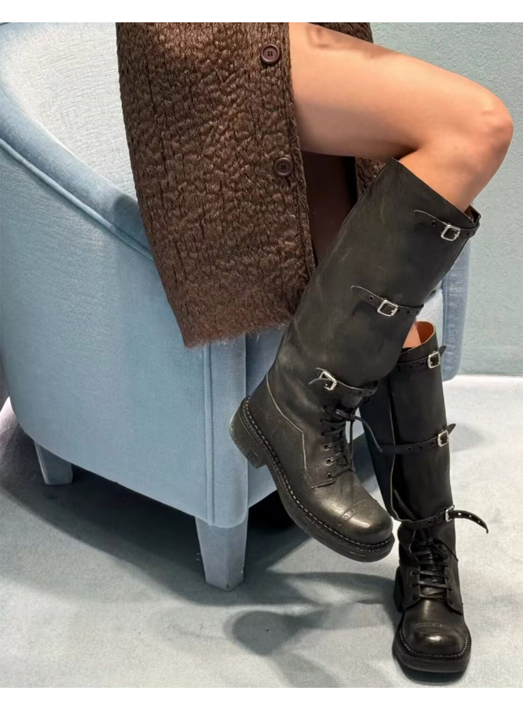 miu騎士靴黑色不過膝機車長靴女真皮綁帶復古加絨大碼西部牛仔靴