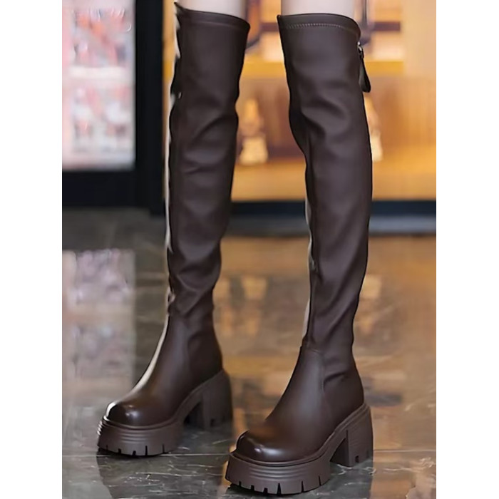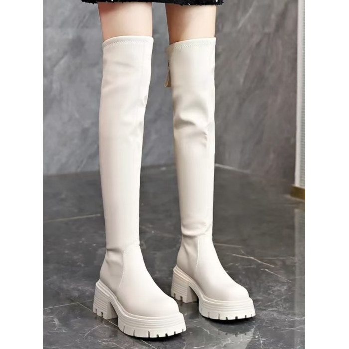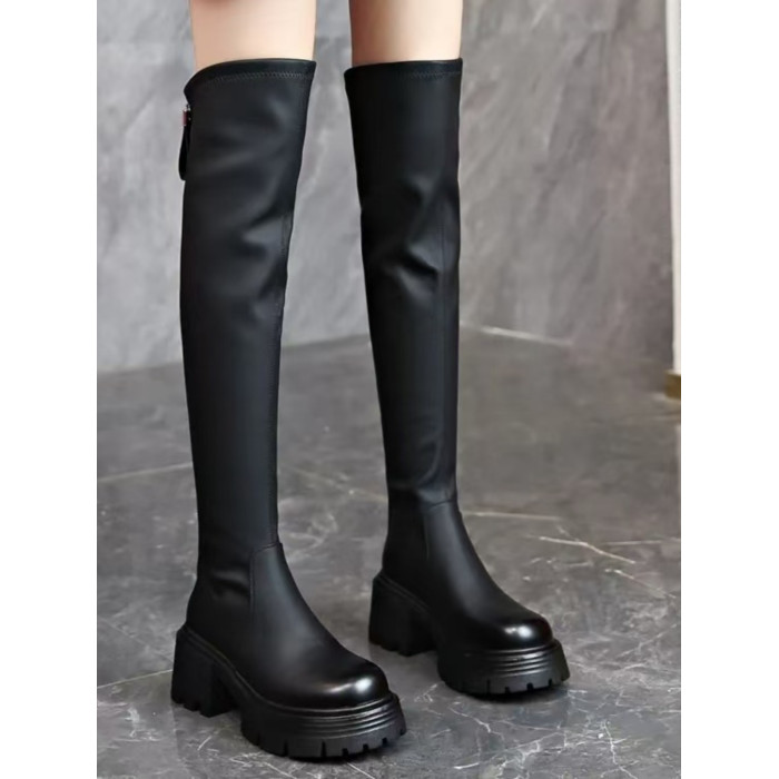 厚底高跟過膝長靴女小個子2024秋冬新款圓頭高筒靴粗跟百搭瘦瘦靴