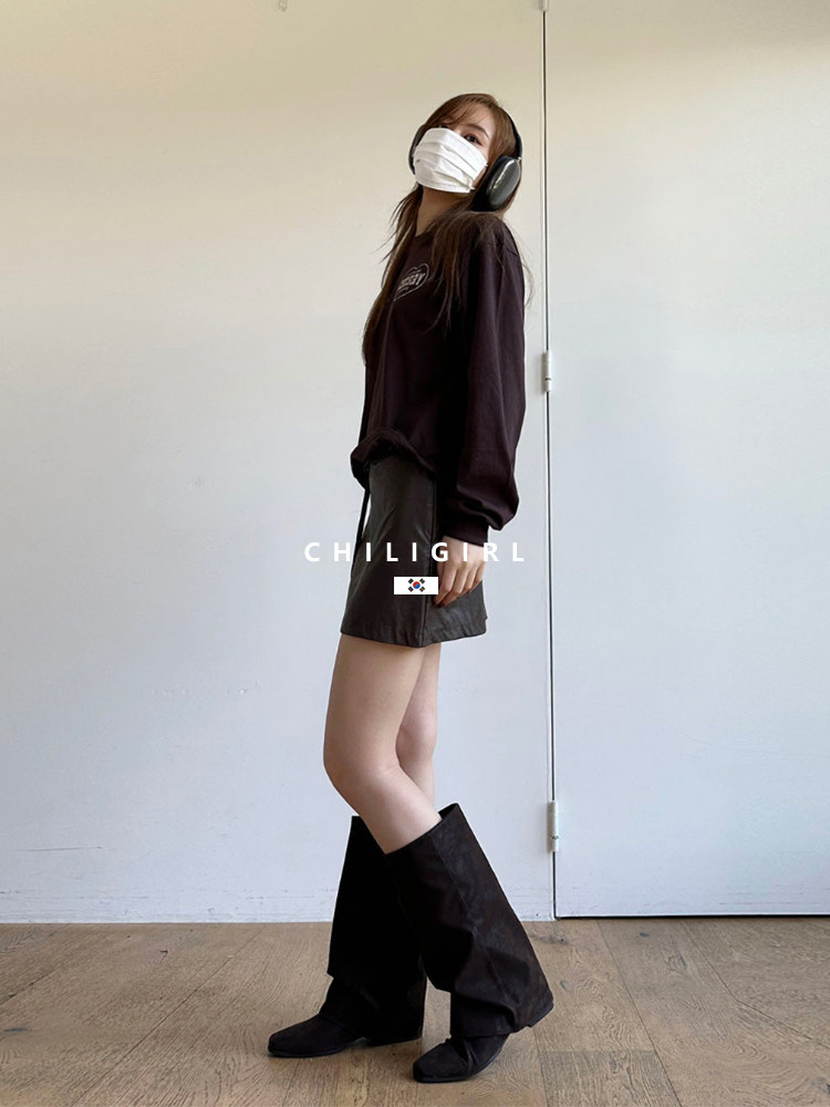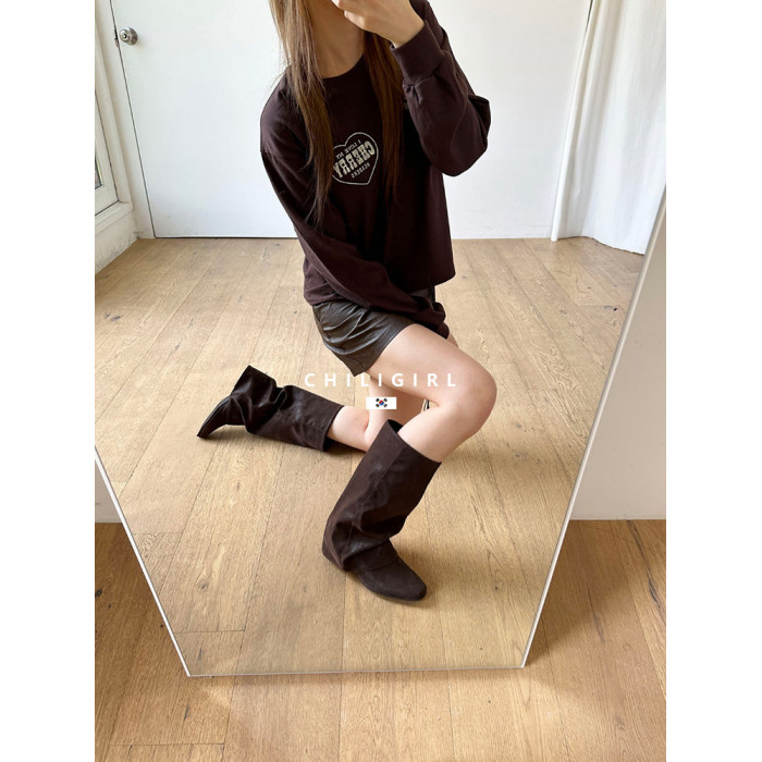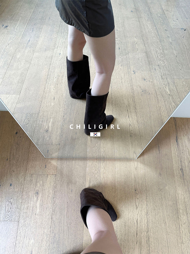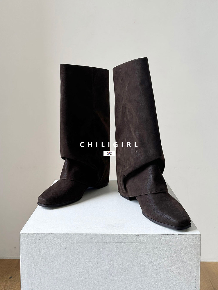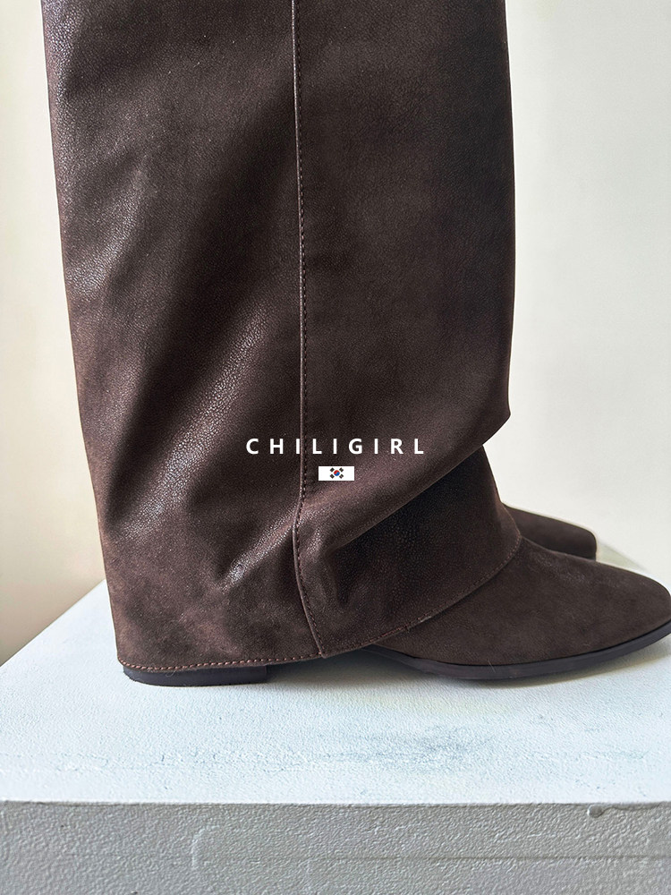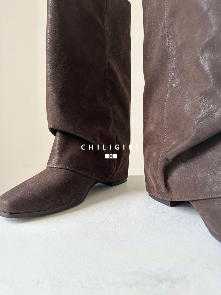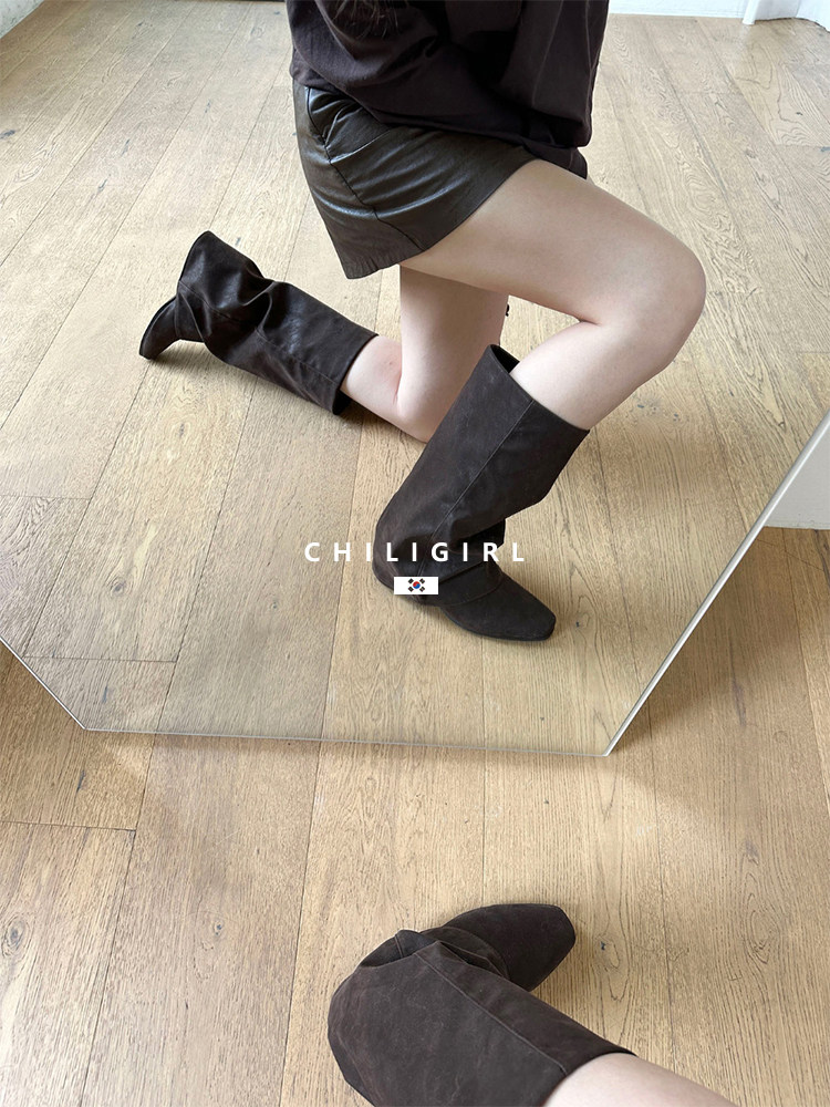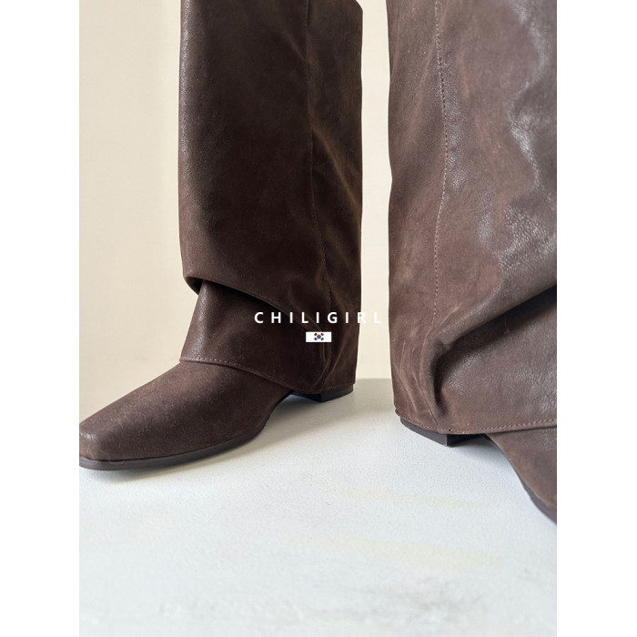 CHILIGIRL褶皺褲琯靴韓國女靴美拉德棕色套筒直腿辣妹不過膝長靴