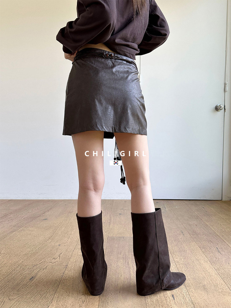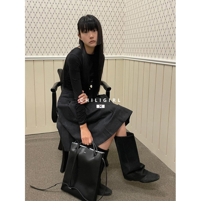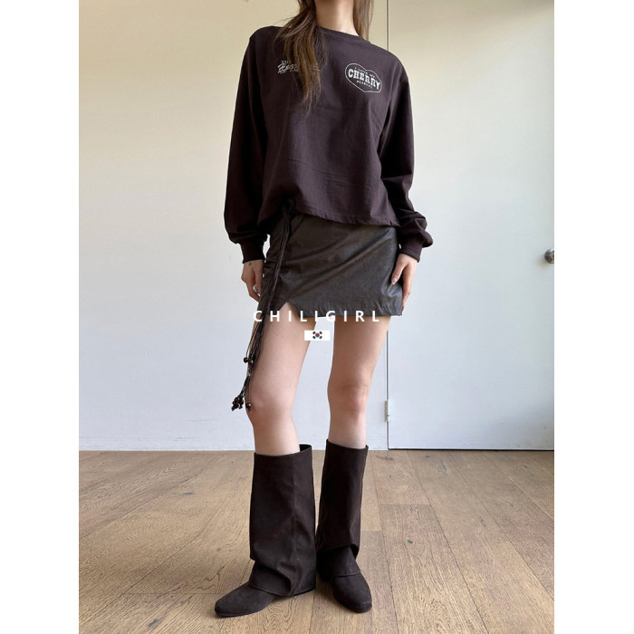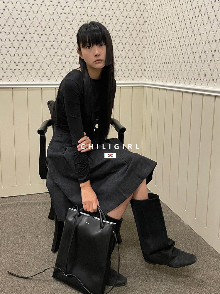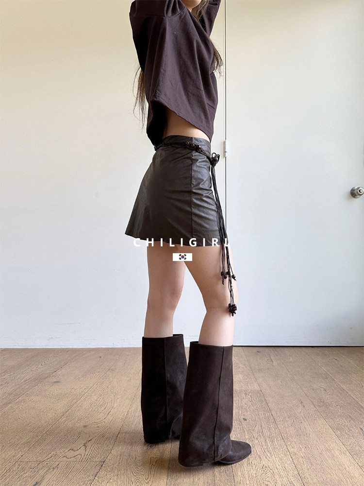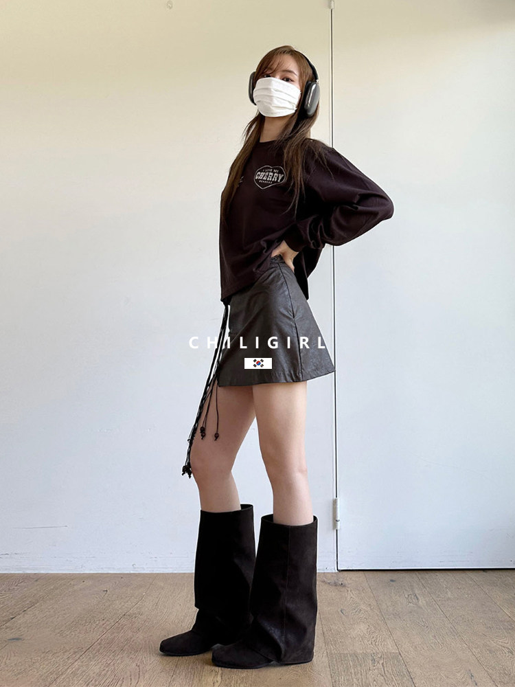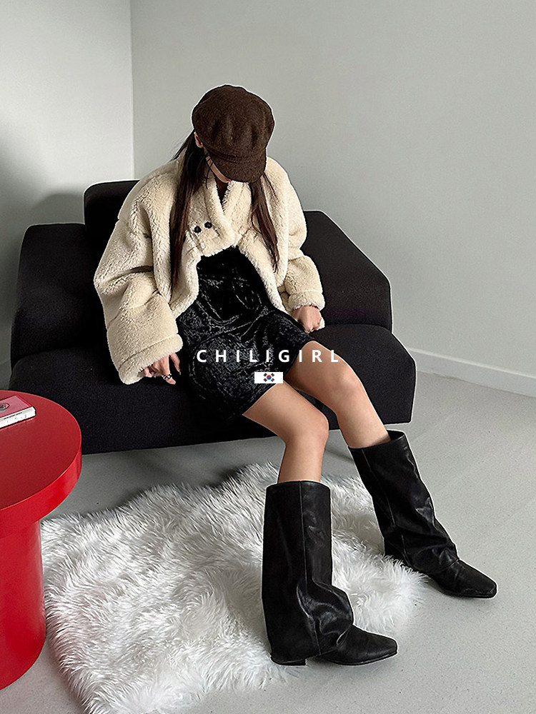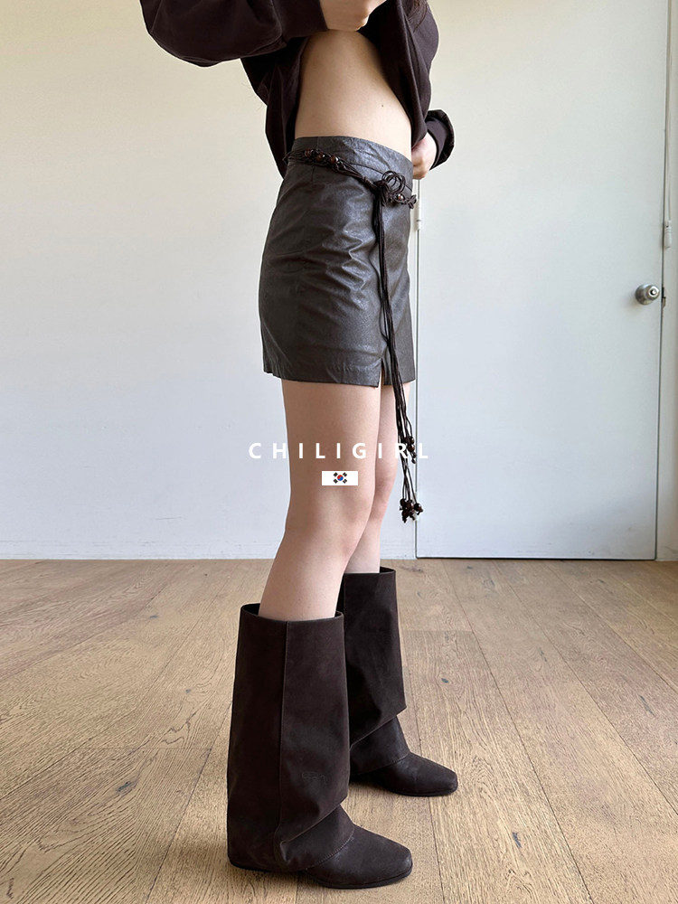 CHILIGIRL褶皺褲琯靴韓國女靴美拉德棕色套筒直腿辣妹不過膝長靴