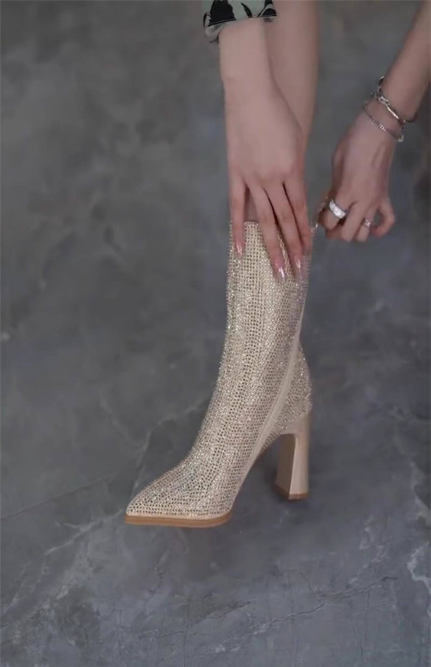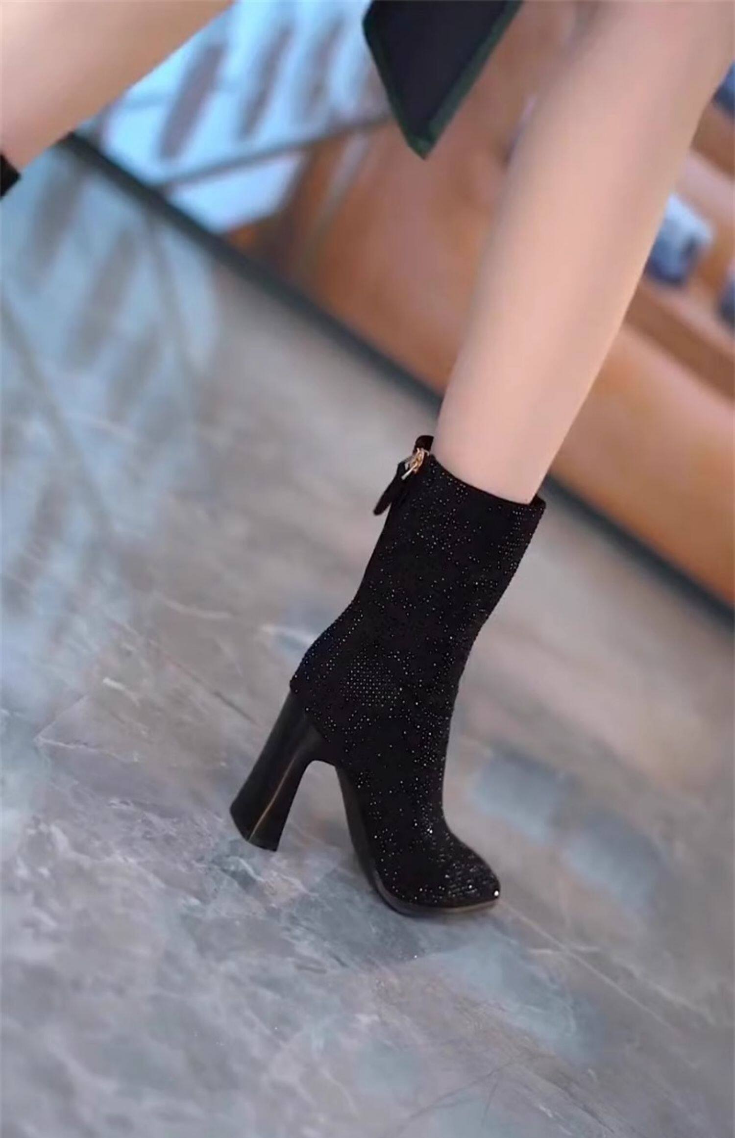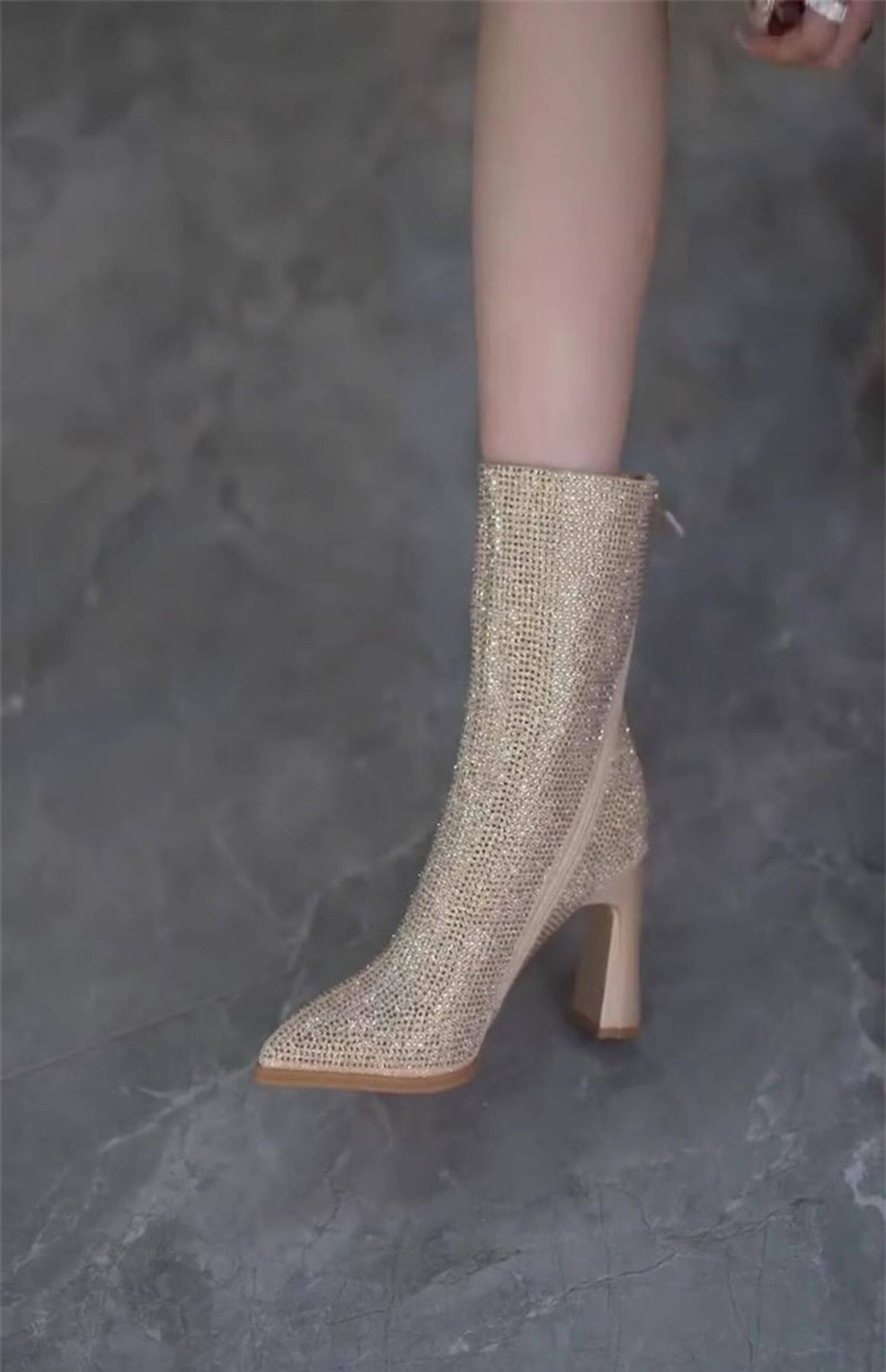 歐美水鑽中筒瘦瘦靴高跟百搭2025秋冬款加絨尖頭斜拉鍊粗跟短靴女