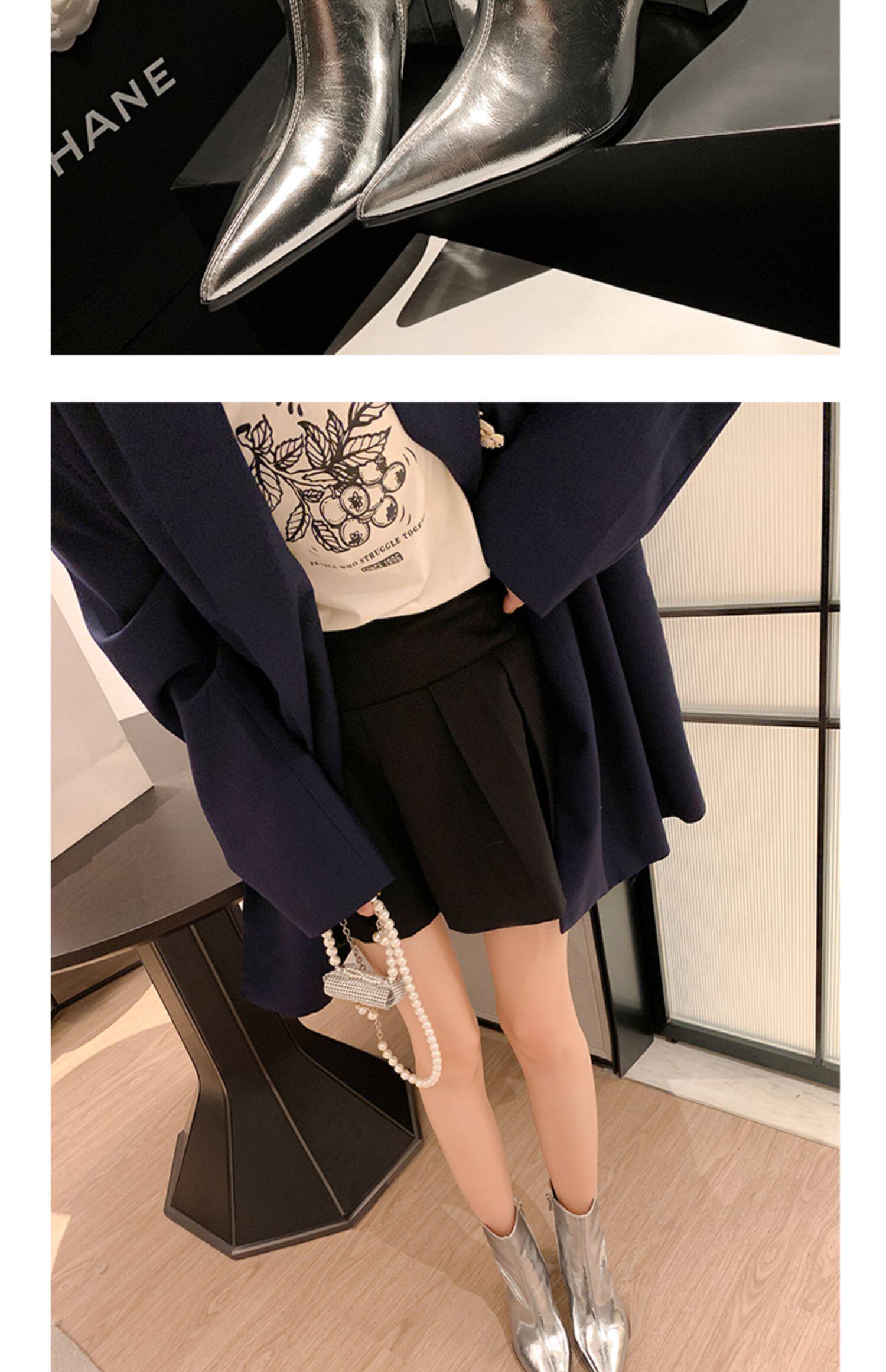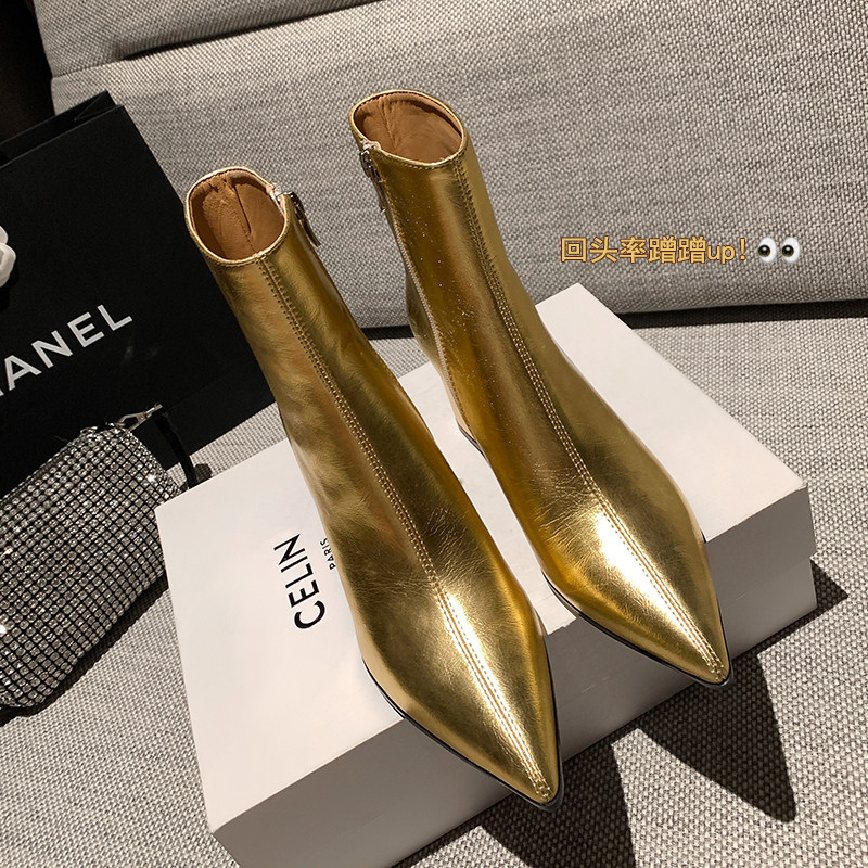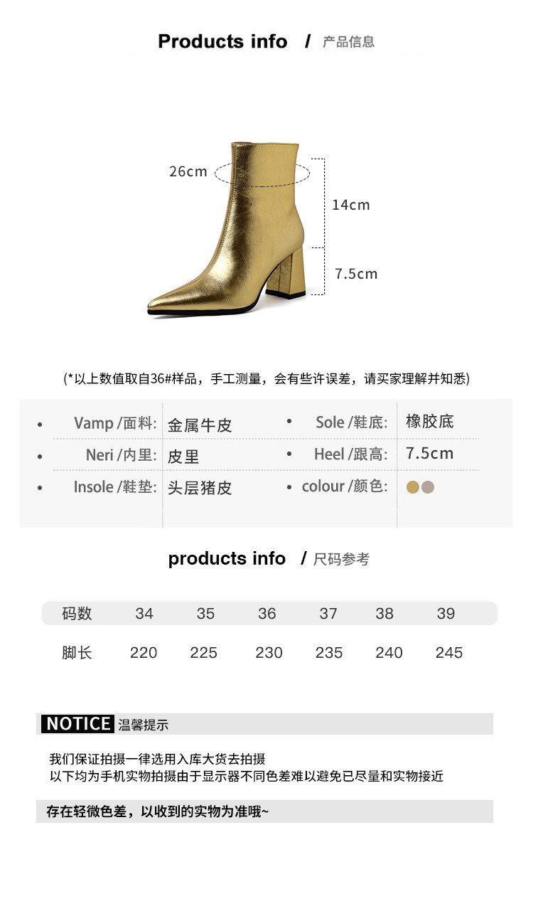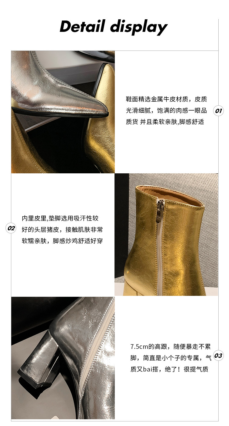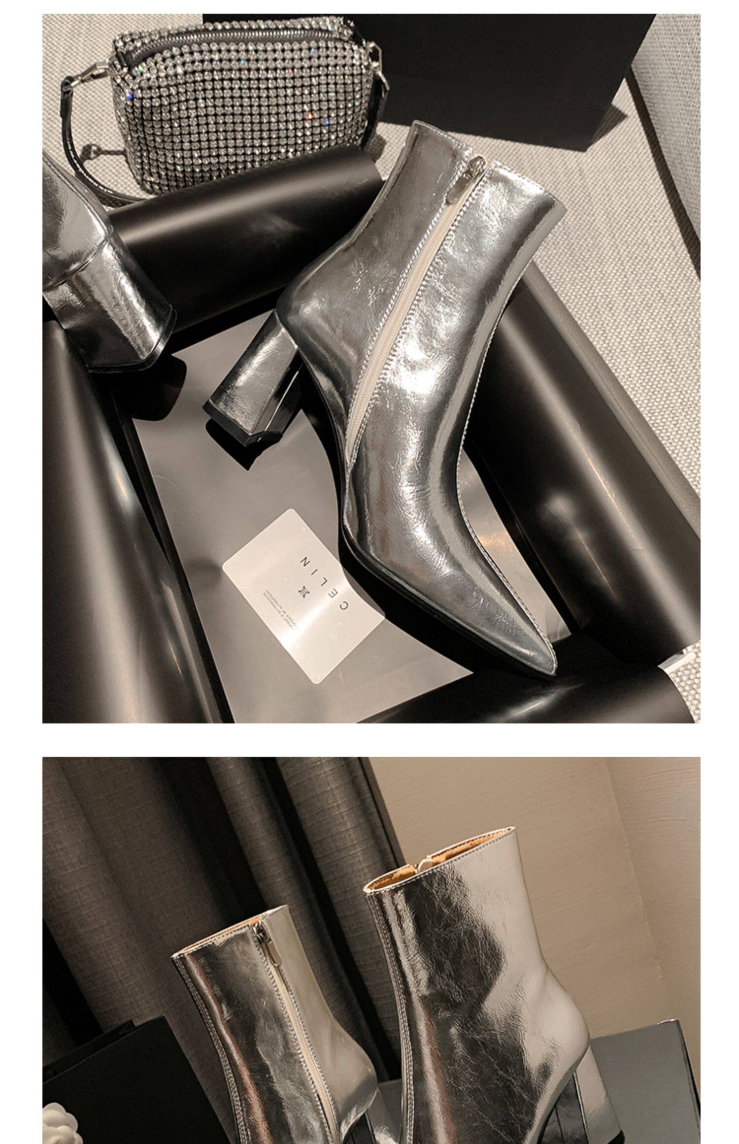 真皮銀色短靴女粗跟2026冬季新款尖頭側拉鍊中筒女靴設計感時裝靴