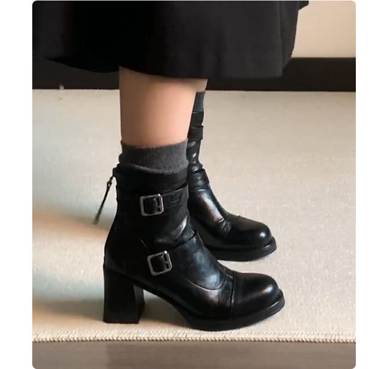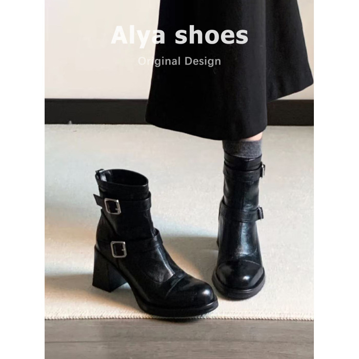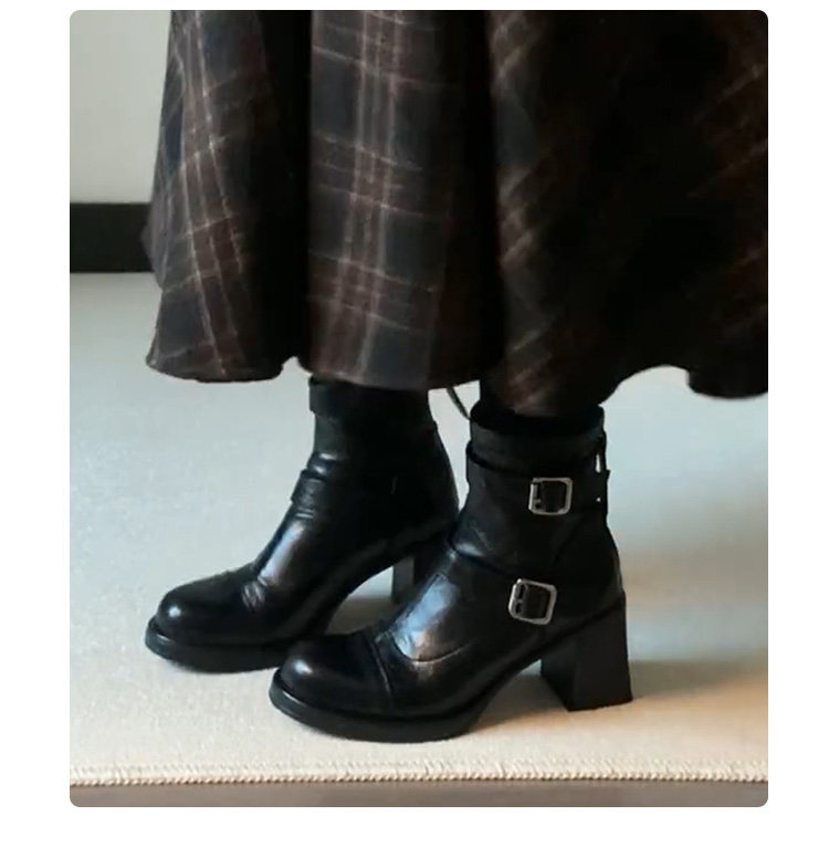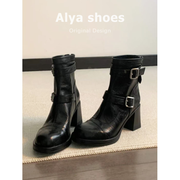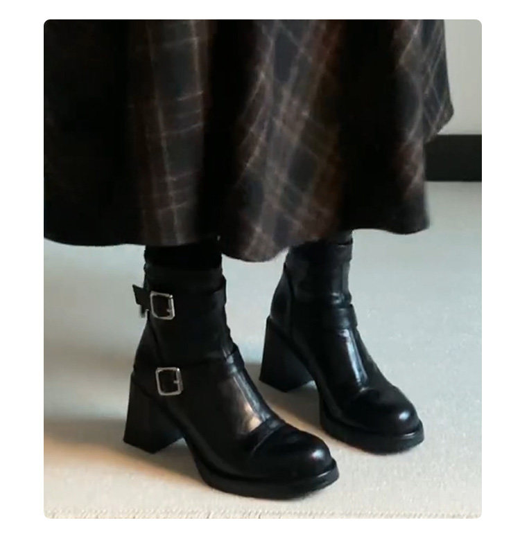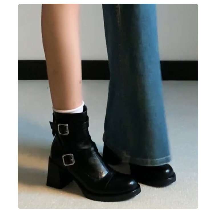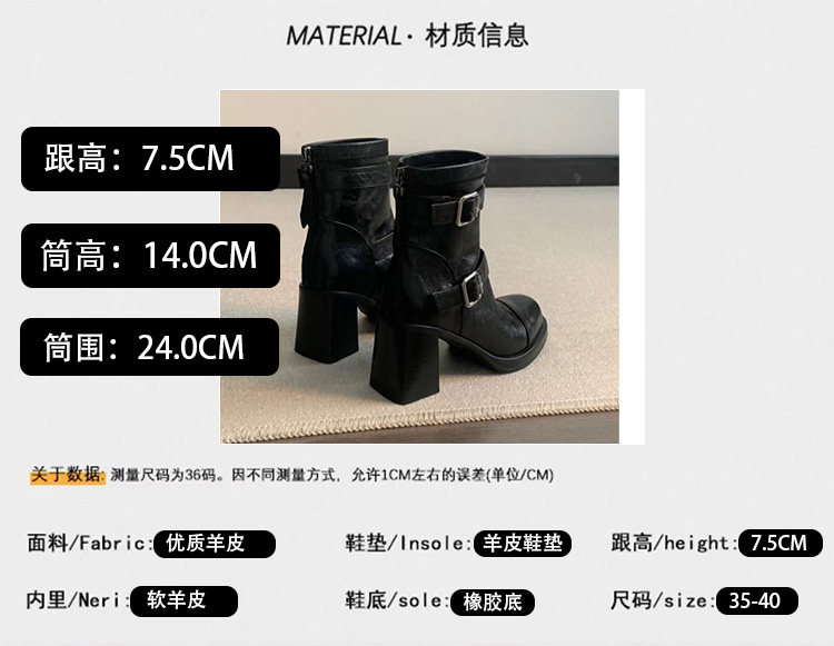 羊皮~高跟厚底短靴女英倫風秋冬新款馬丁靴粗跟皮帶釦加絨瘦瘦靴