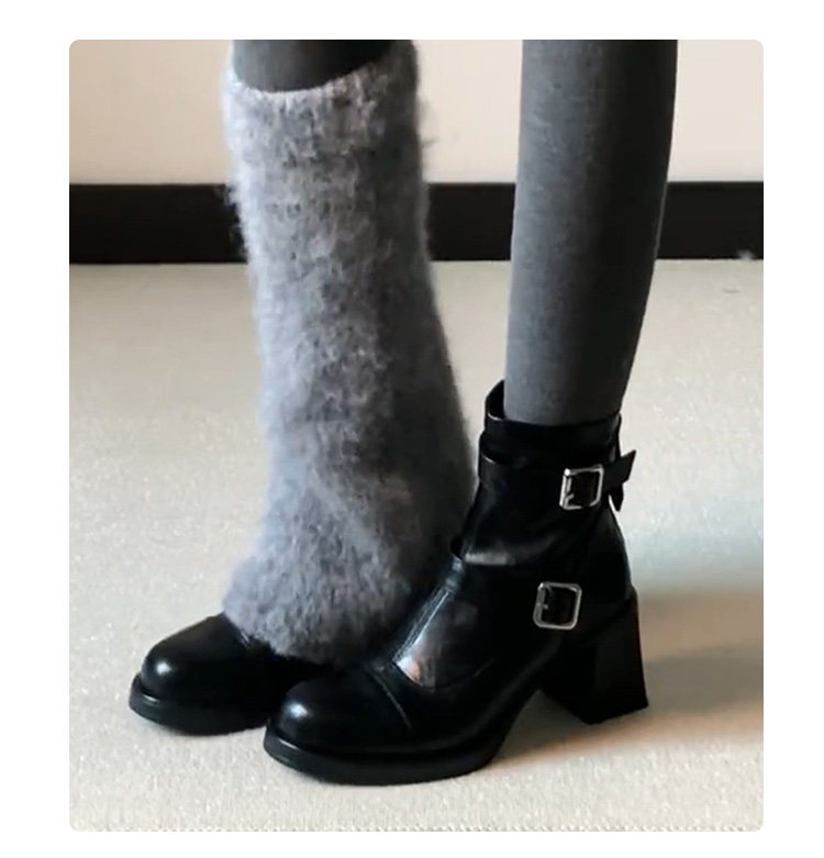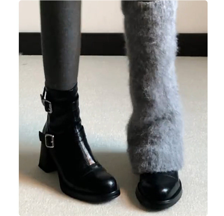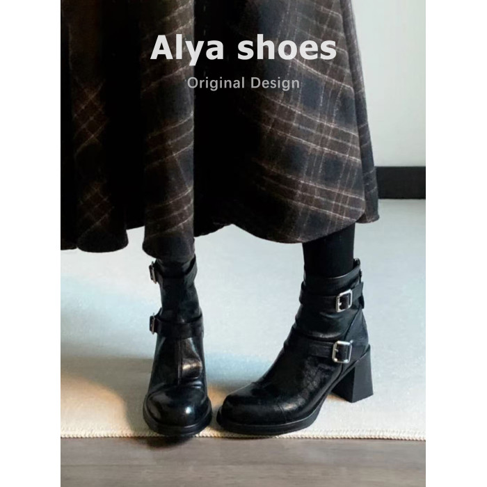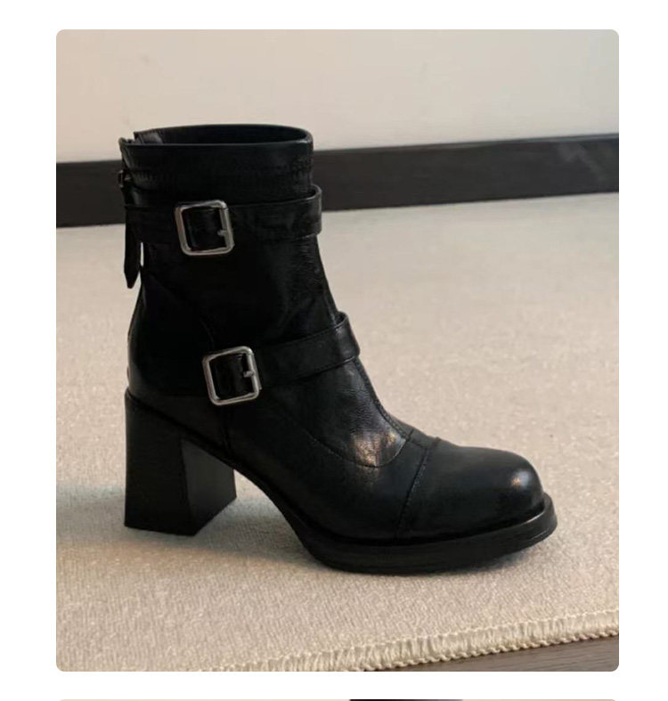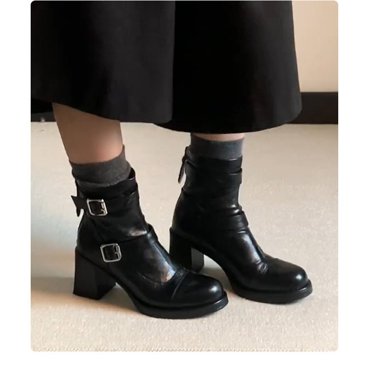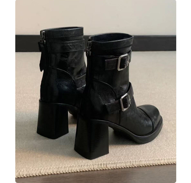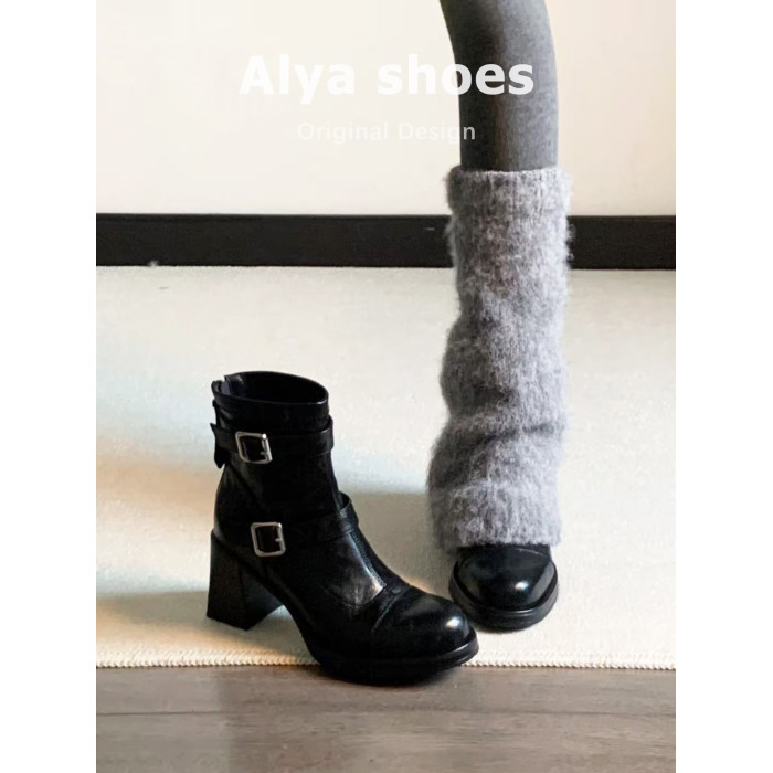 羊皮~高跟厚底短靴女英倫風秋冬新款馬丁靴粗跟皮帶釦加絨瘦瘦靴