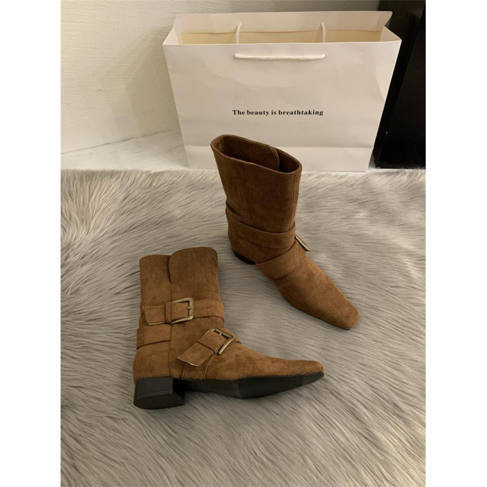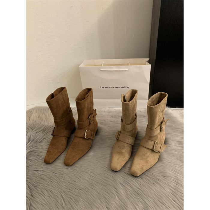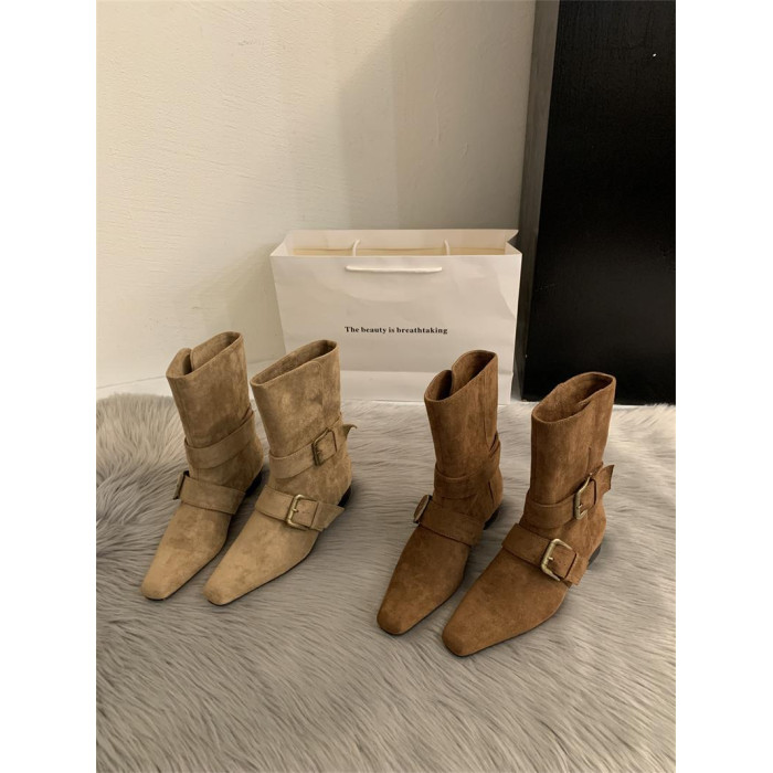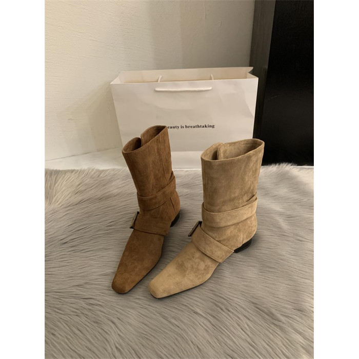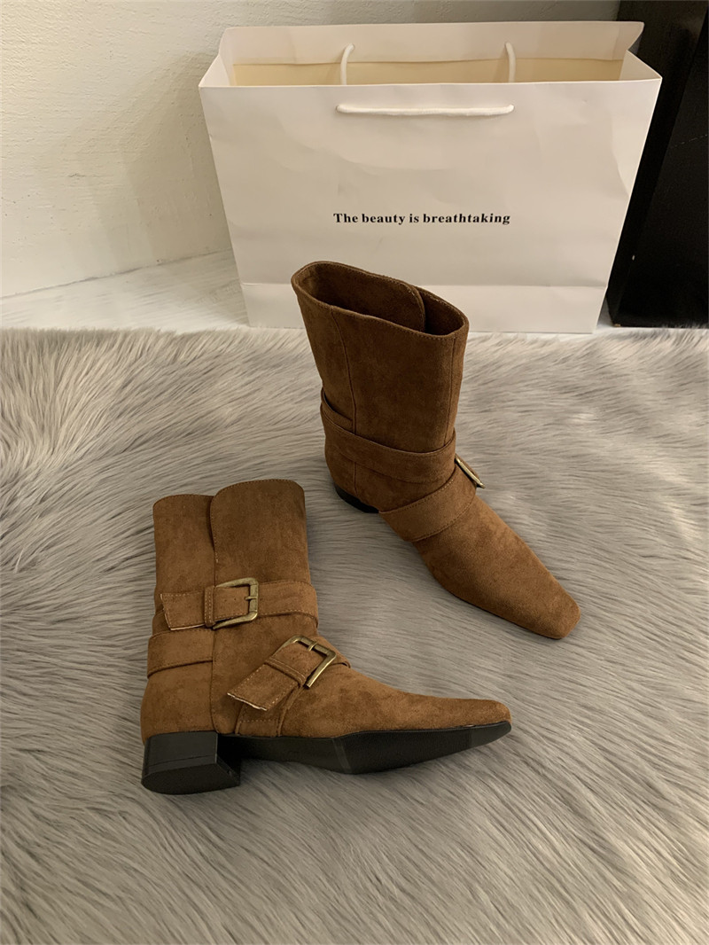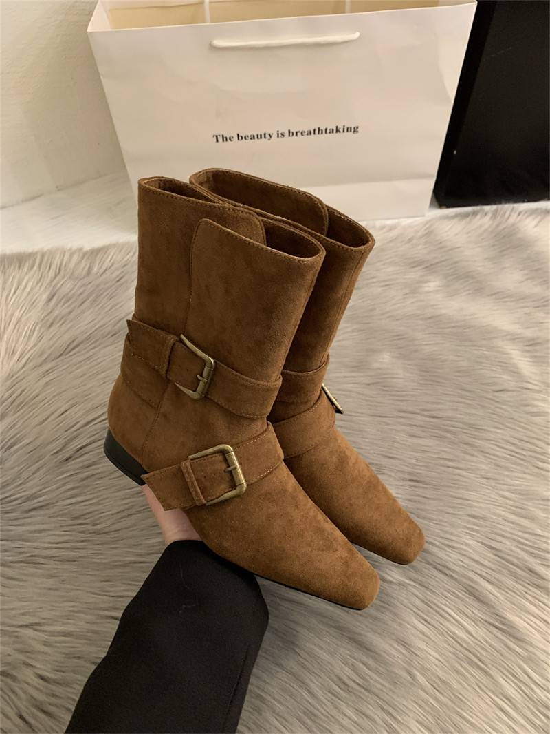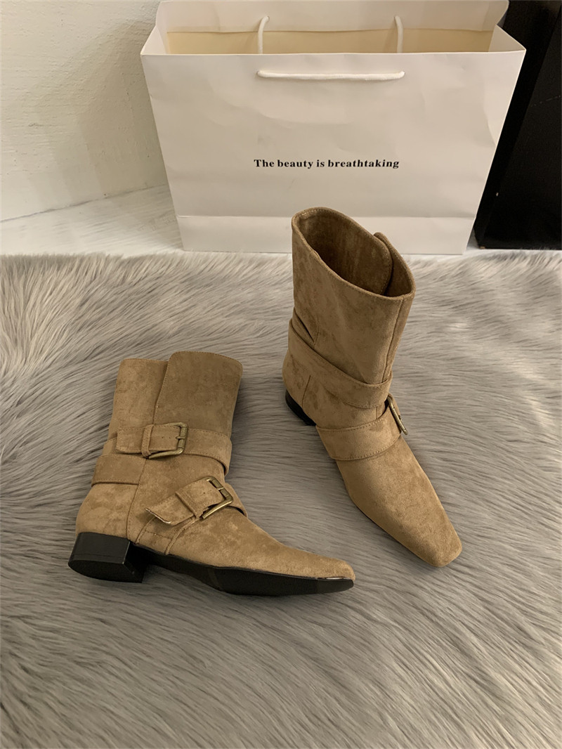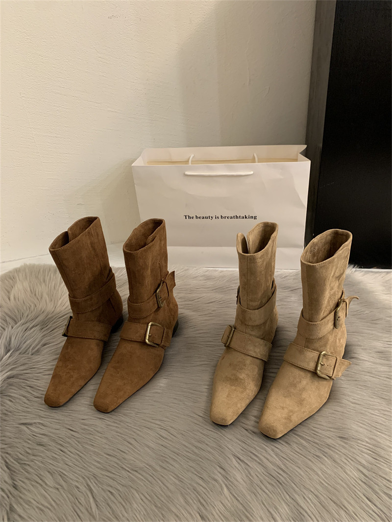 2025韓版新款小衆設計復古法式短靴小方頭西部靴麂皮中筒靴女靴子