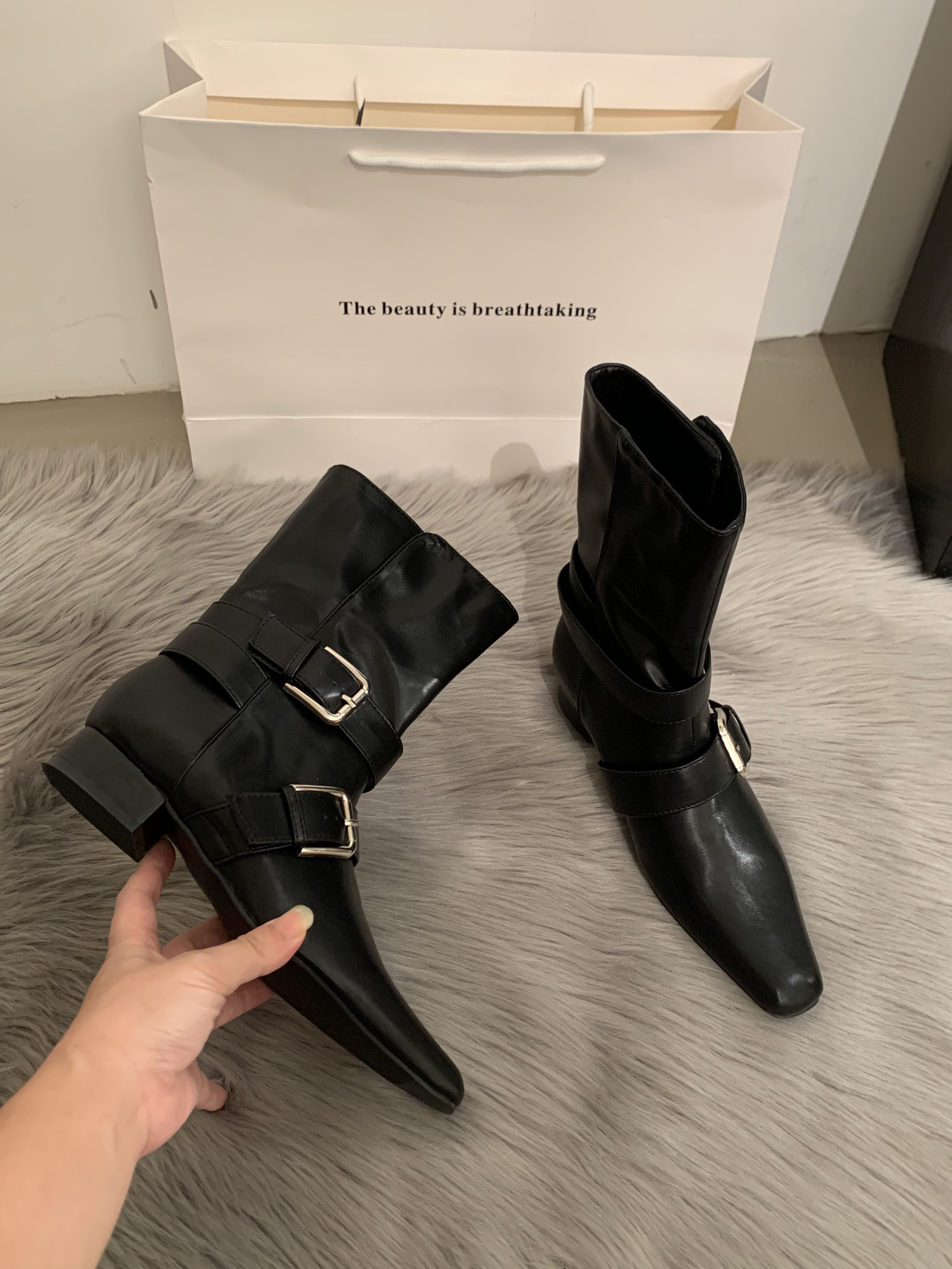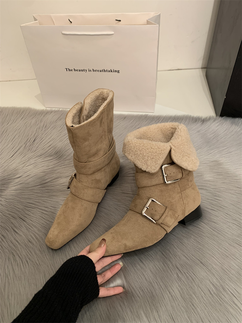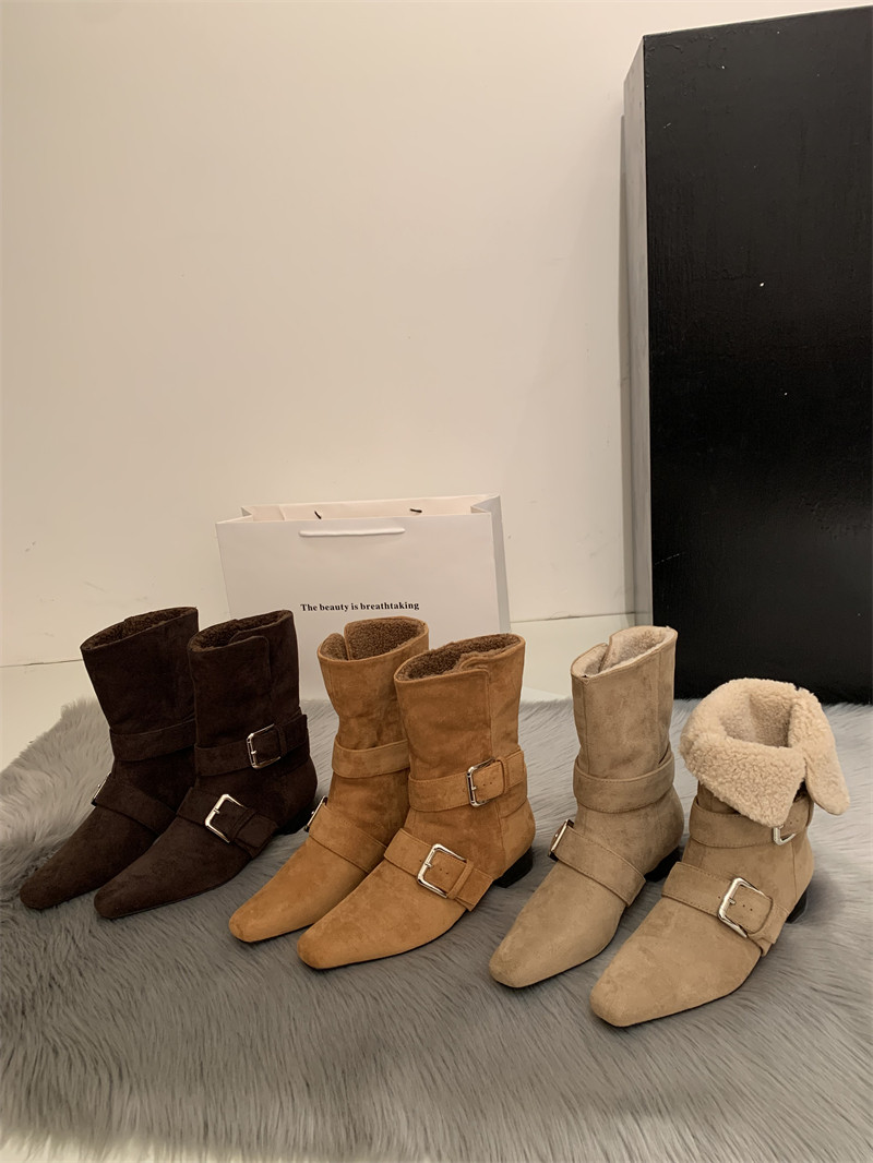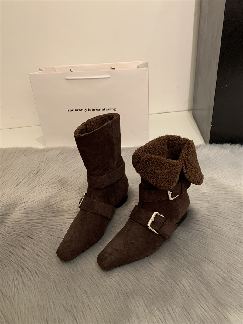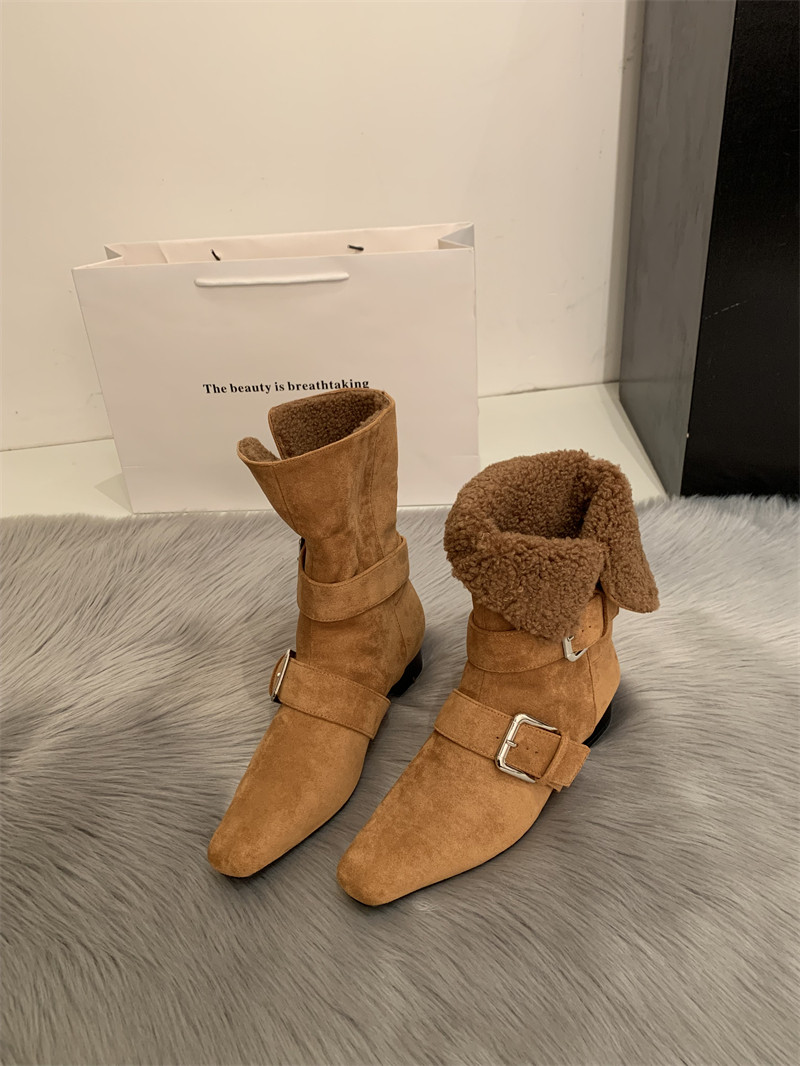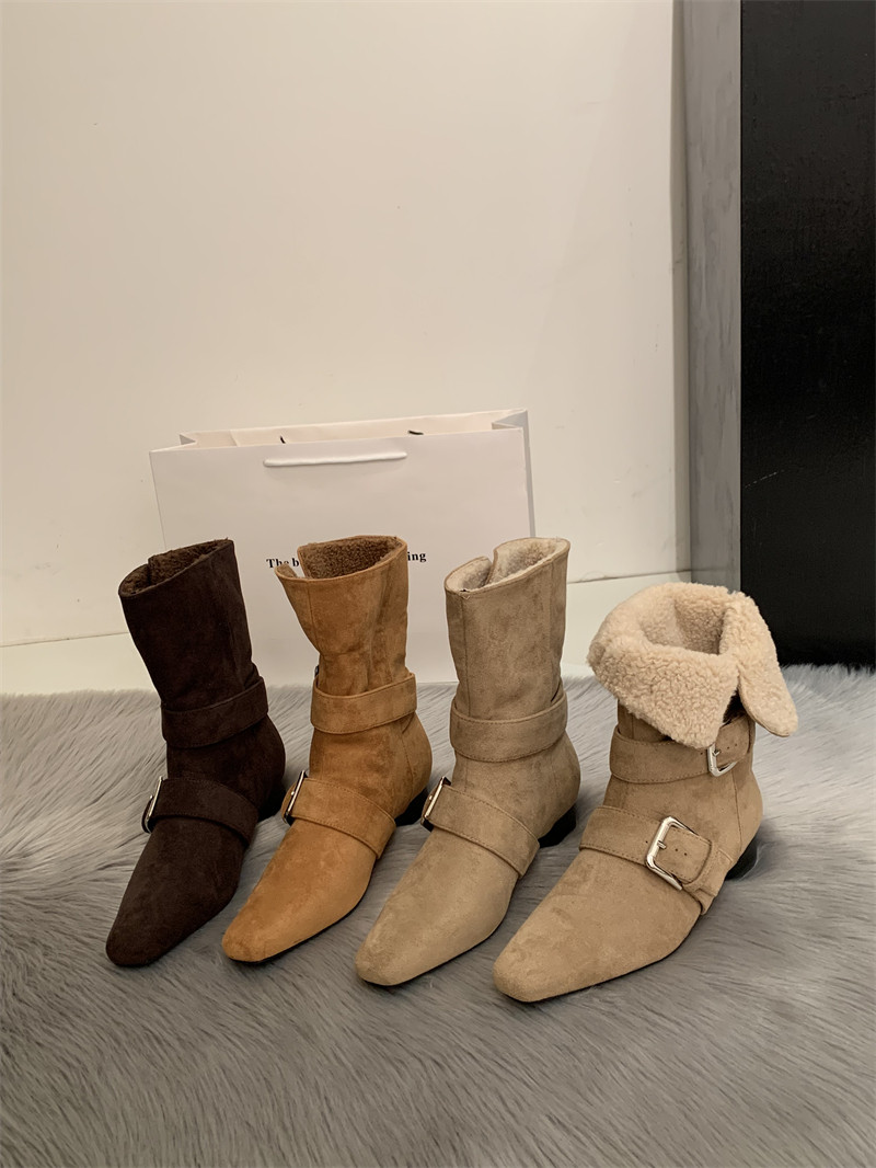 2025韓版新款小衆設計復古法式短靴小方頭西部靴麂皮中筒靴女靴子
