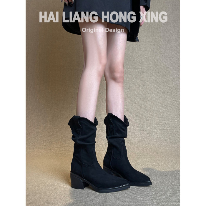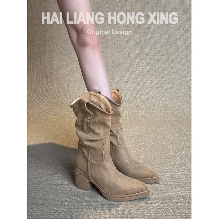 羊皮版~復古尖頭高跟短靴女厚底粗跟褶皺堆堆靴西部騎士靴馬丁靴
