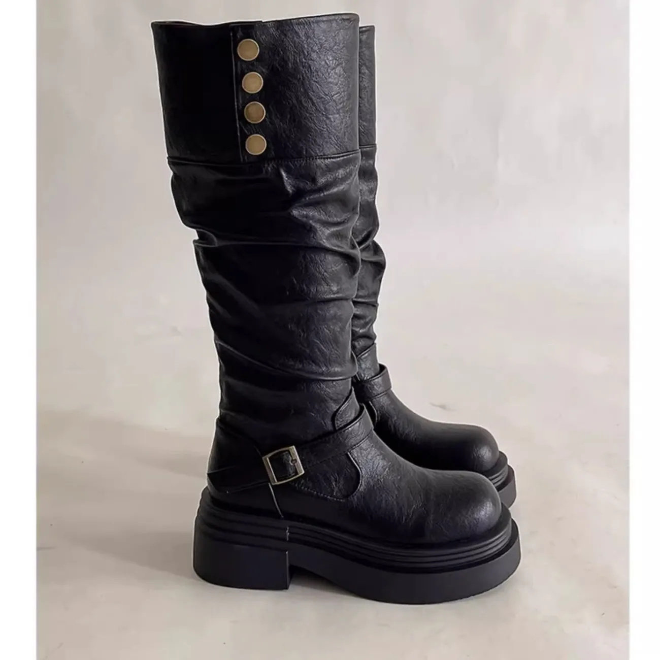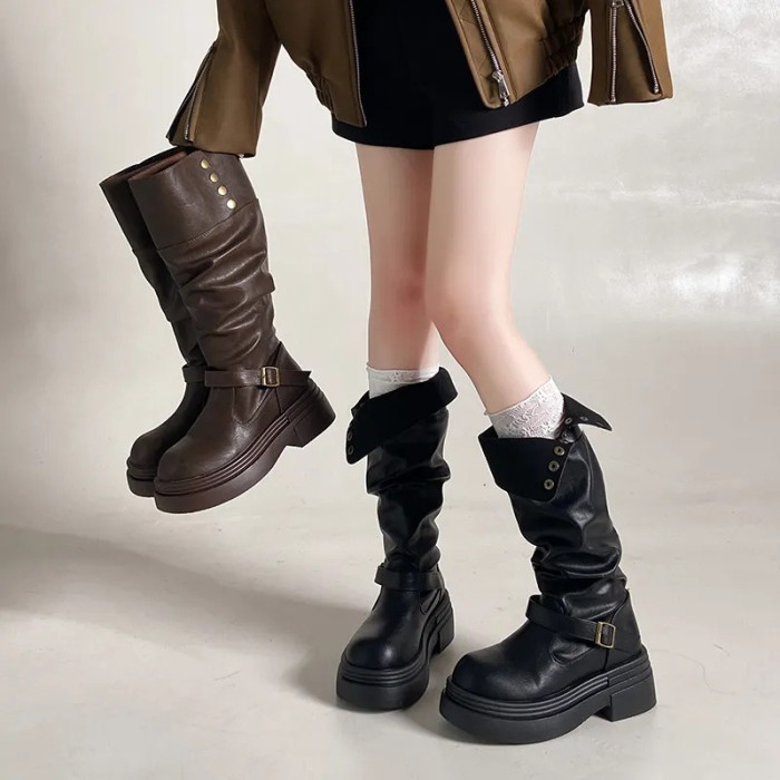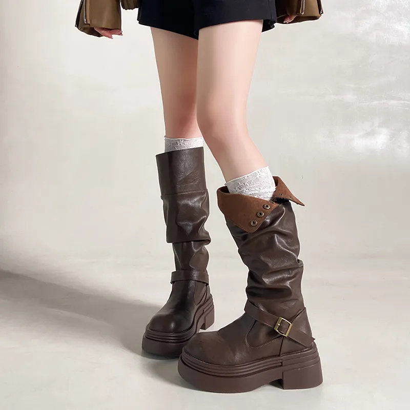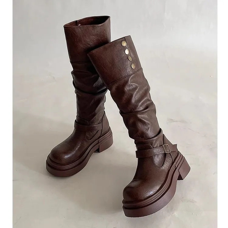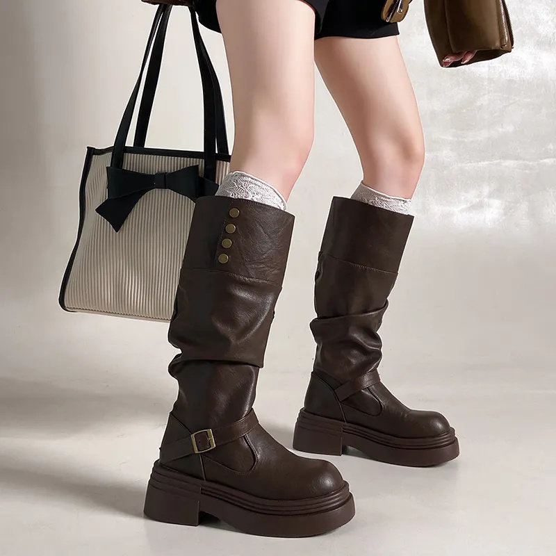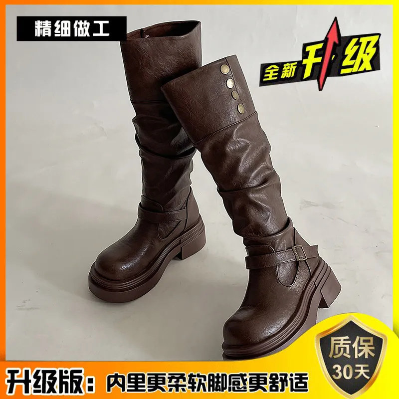 棕色復古英倫風粗跟厚底長筒靴女2025新款秋冬季顯瘦長靴騎士靴子