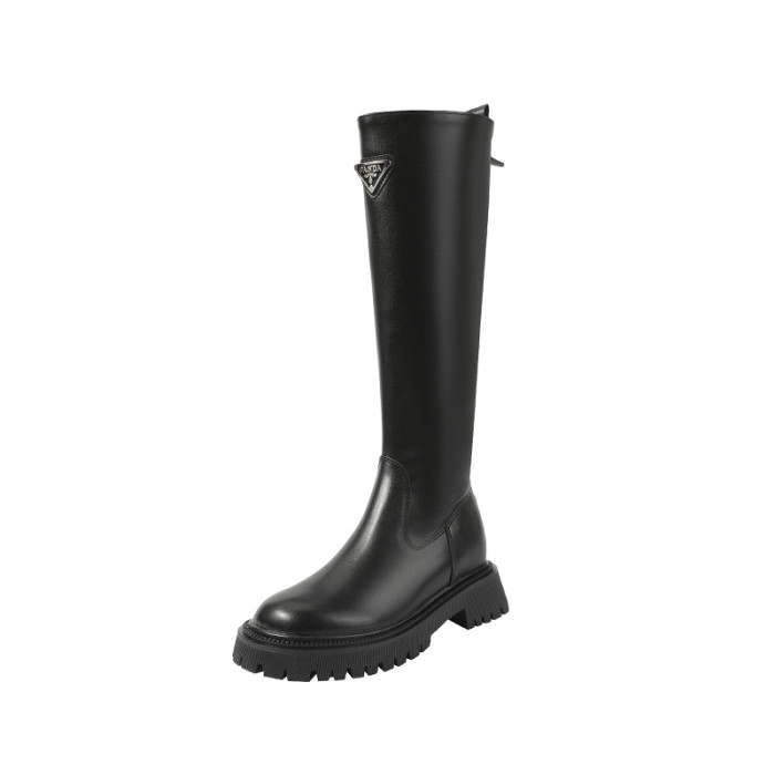 中筒高高長筒顯瘦騎士靴女三角標直筒圓頭厚底秋冬真皮內增高長靴