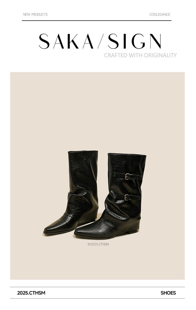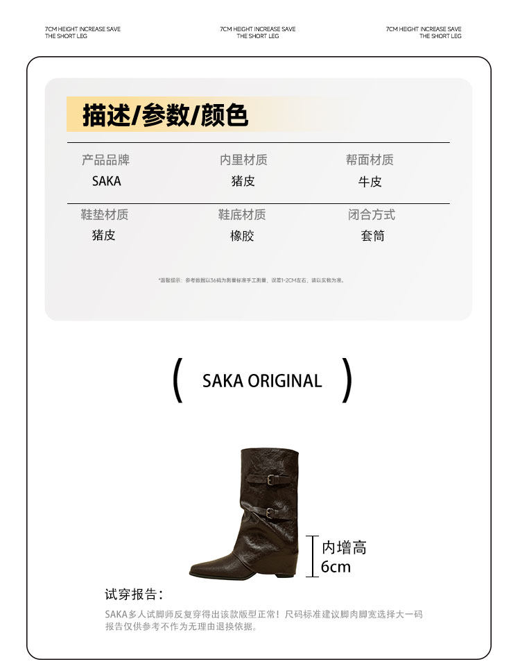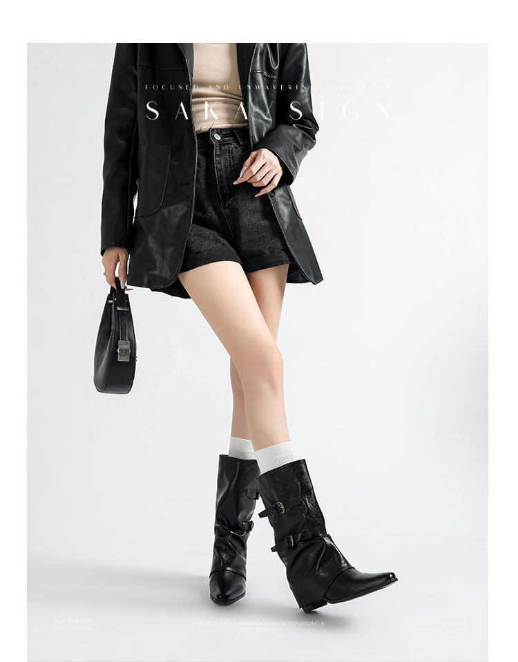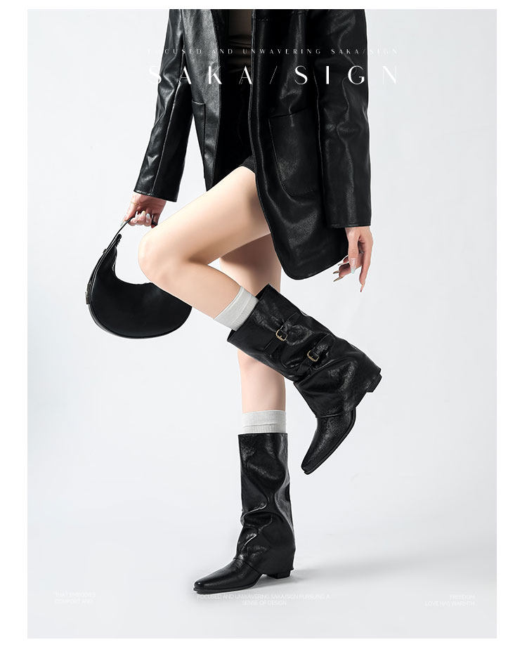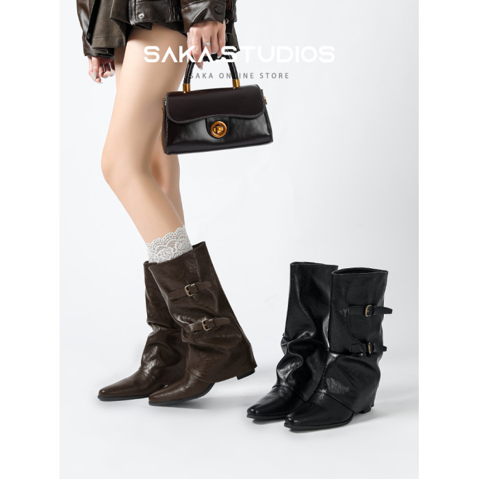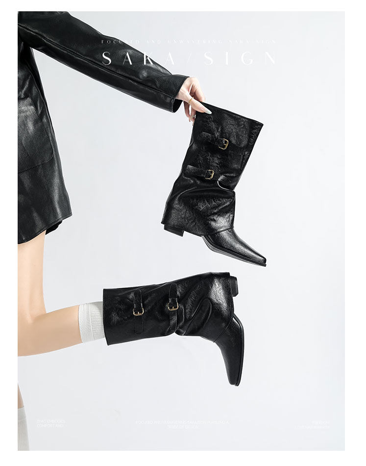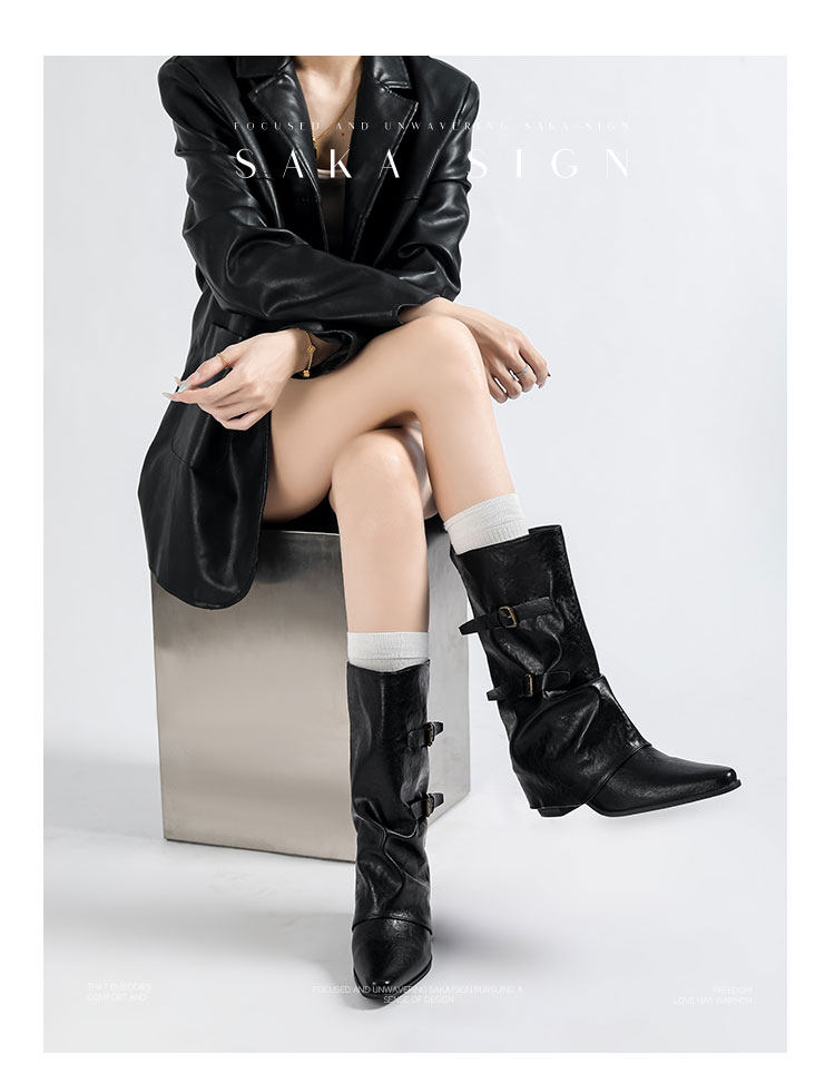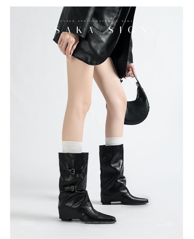 【saka】牛皮版~尖頭增高7cm皮帶釦褲琯靴女秋冬騎士靴顯瘦中筒靴