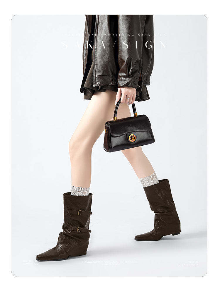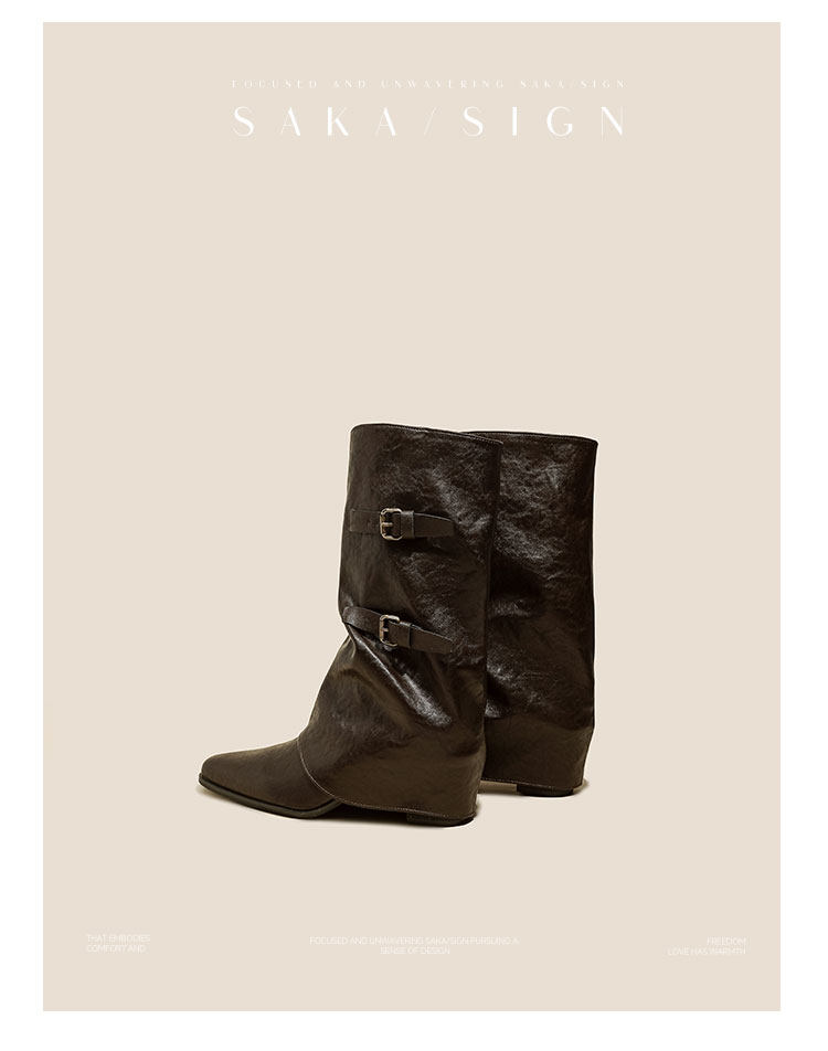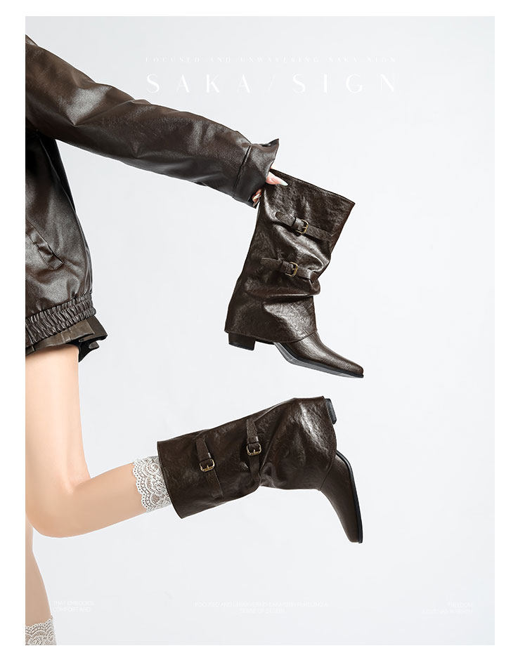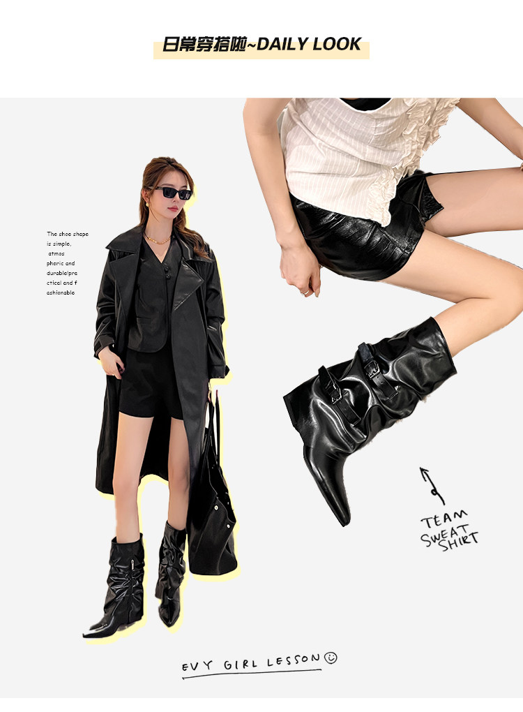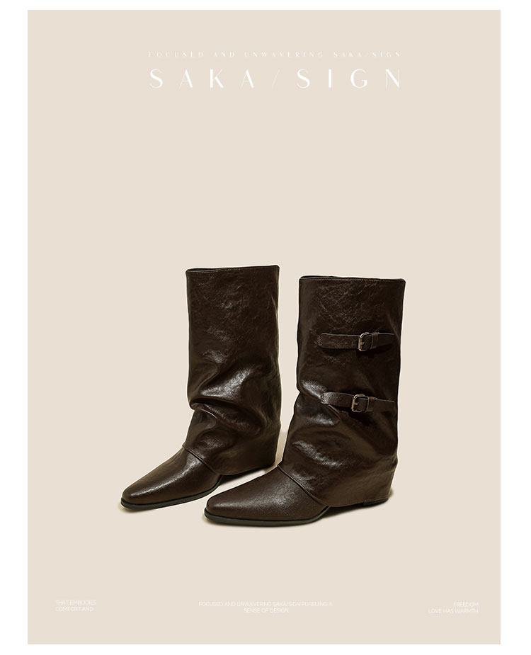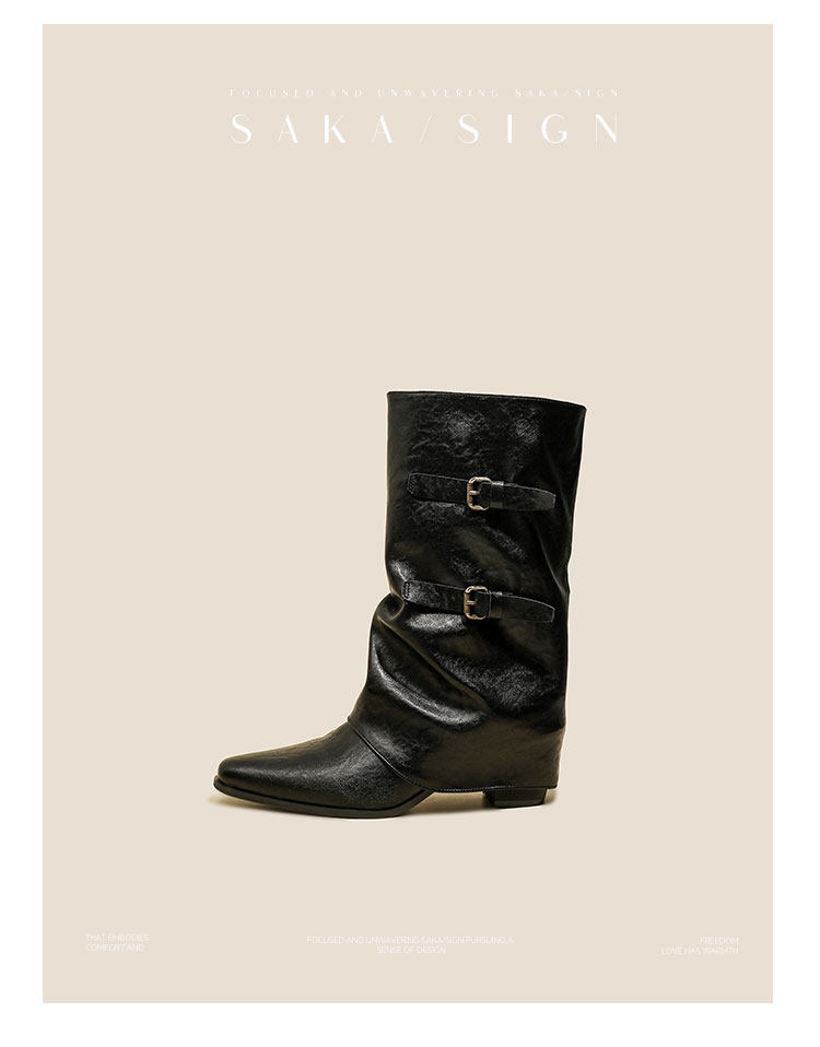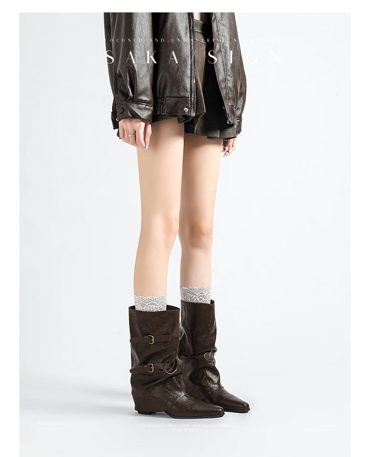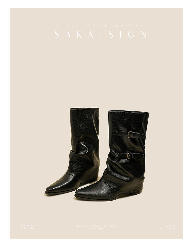【saka】牛皮版~尖頭增高7cm皮帶釦褲琯靴女秋冬騎士靴顯瘦中筒靴