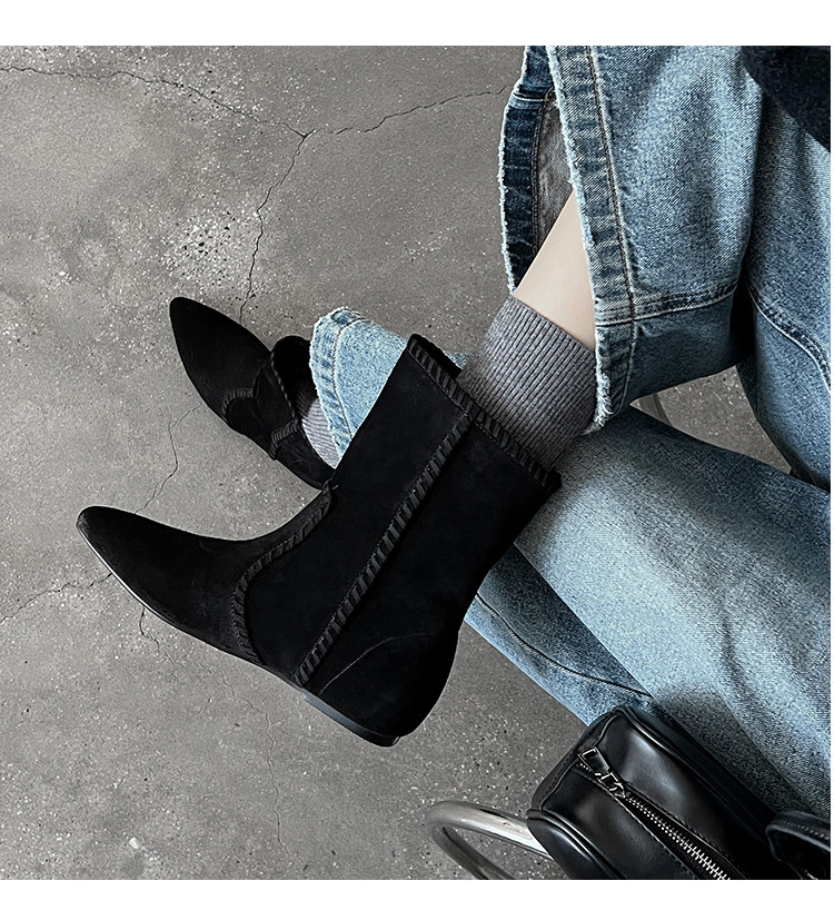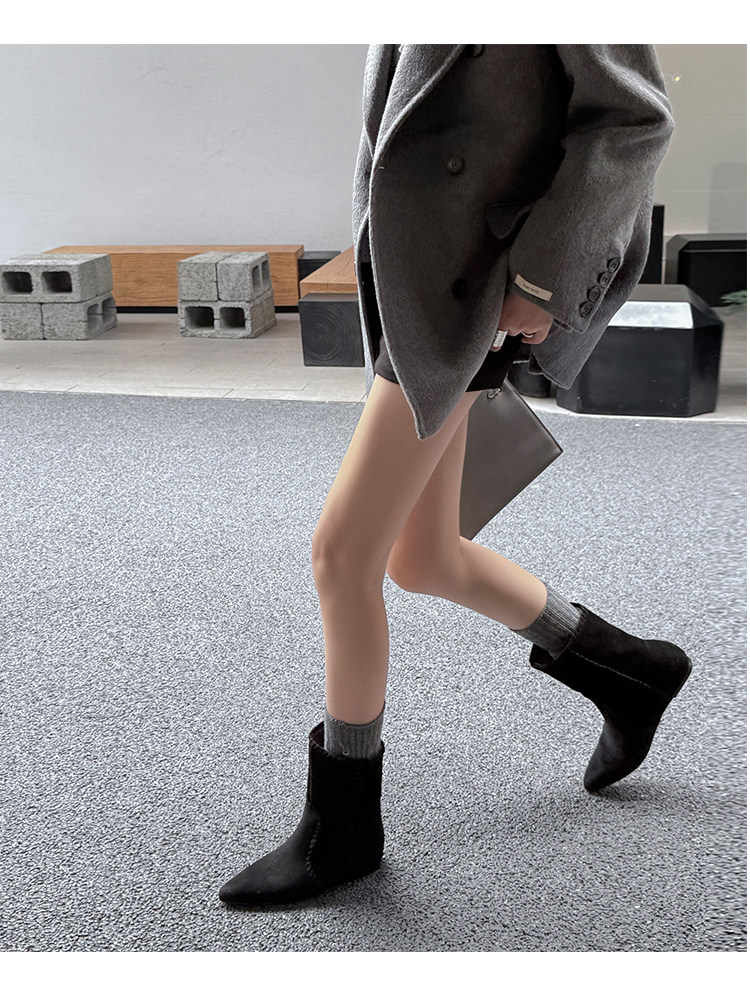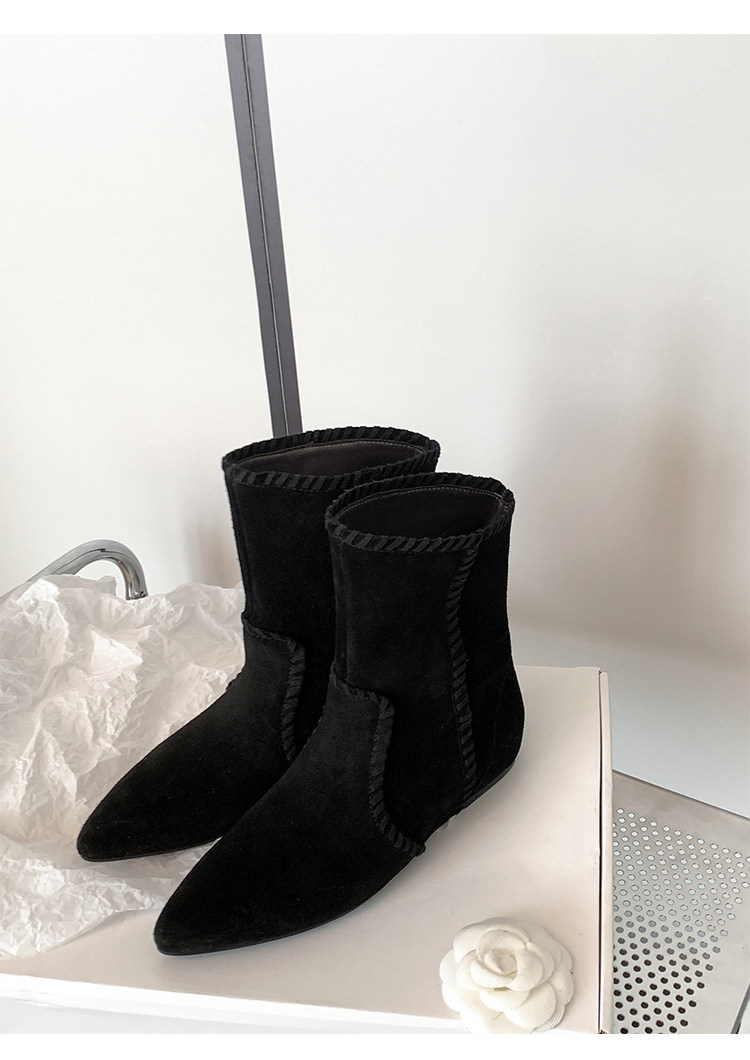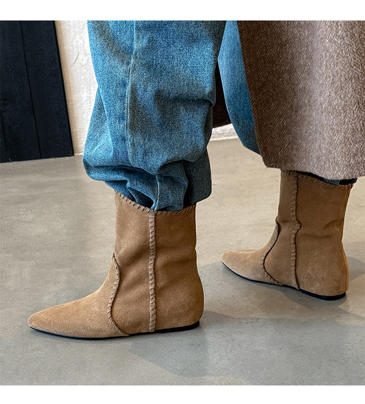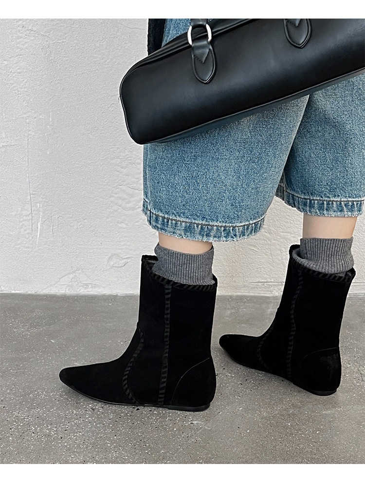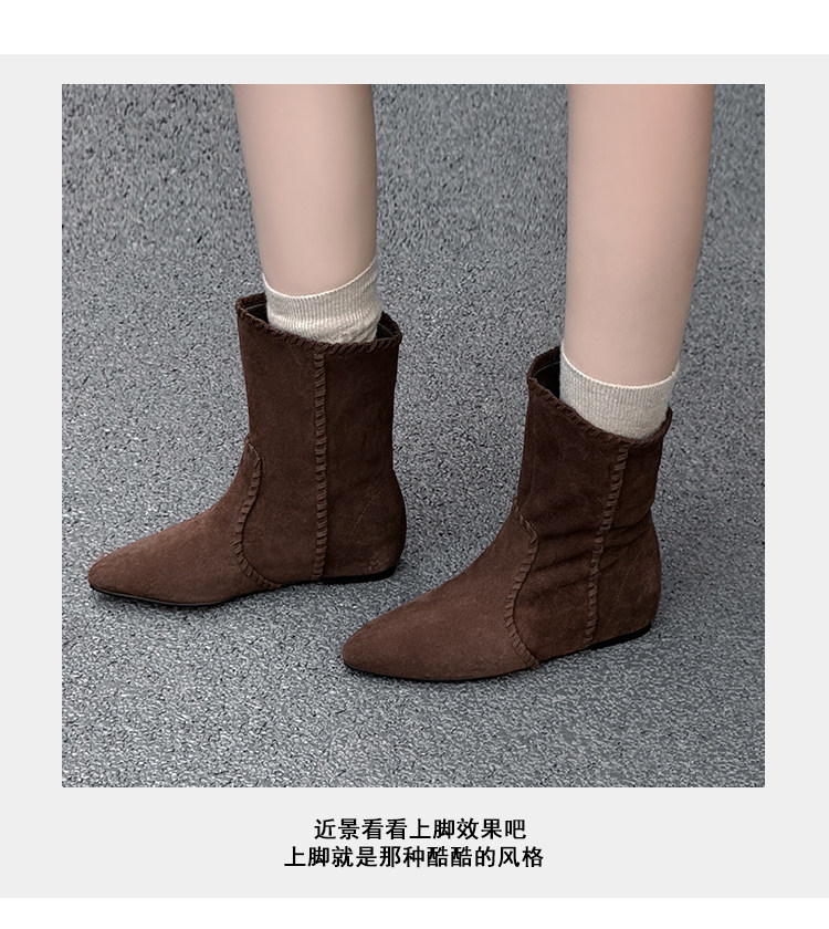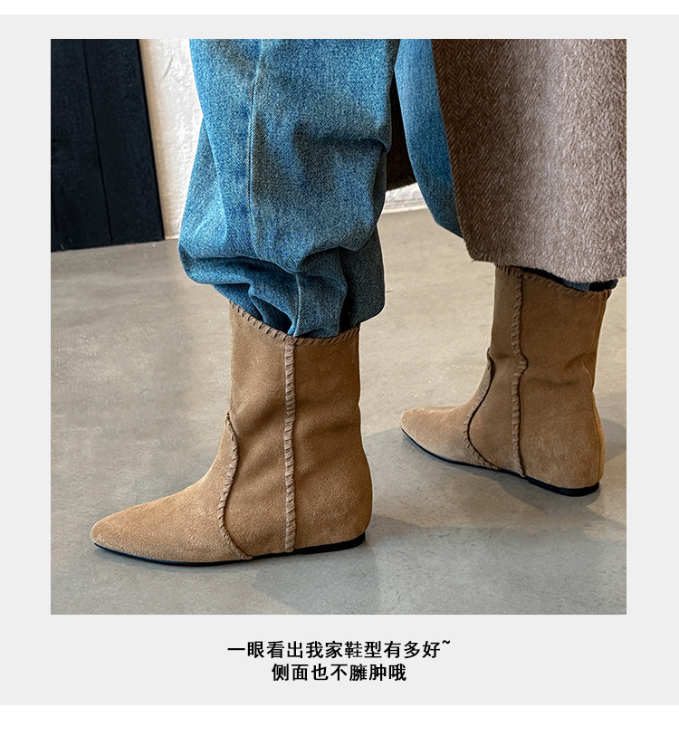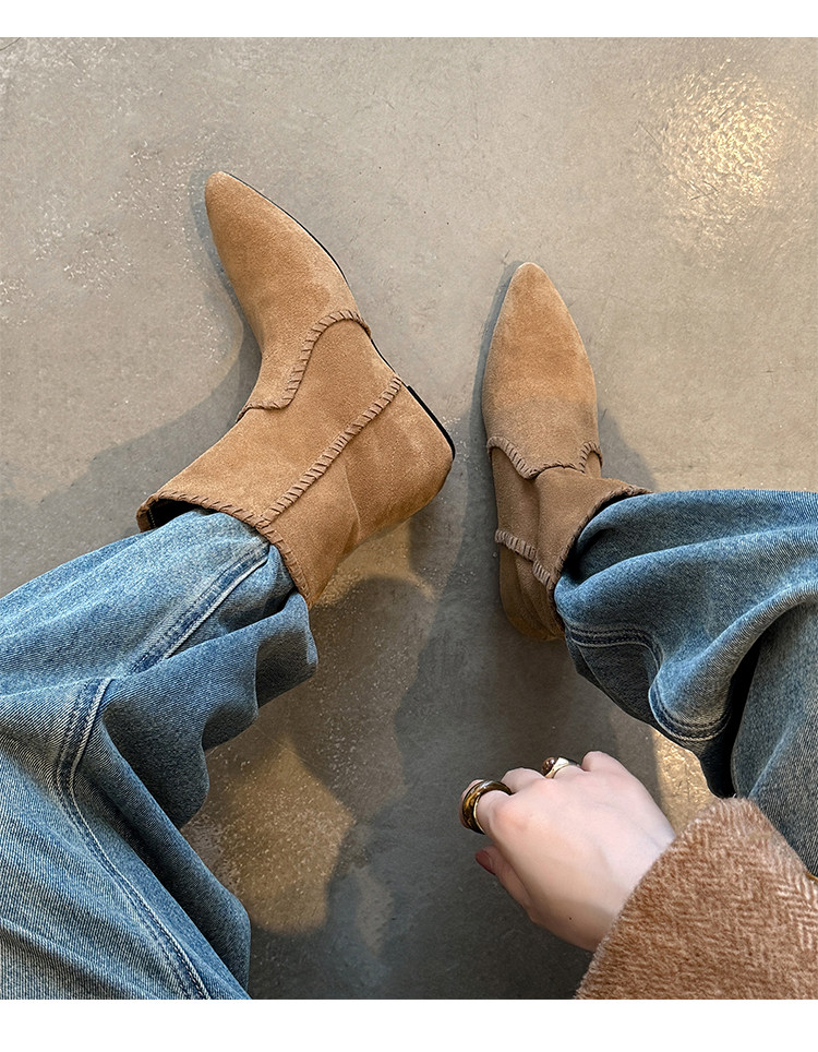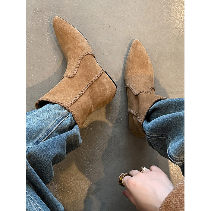 韓版英倫風磨砂絨面尖頭西部牛仔靴女一腳蹬寬筒平底短靴女內增高