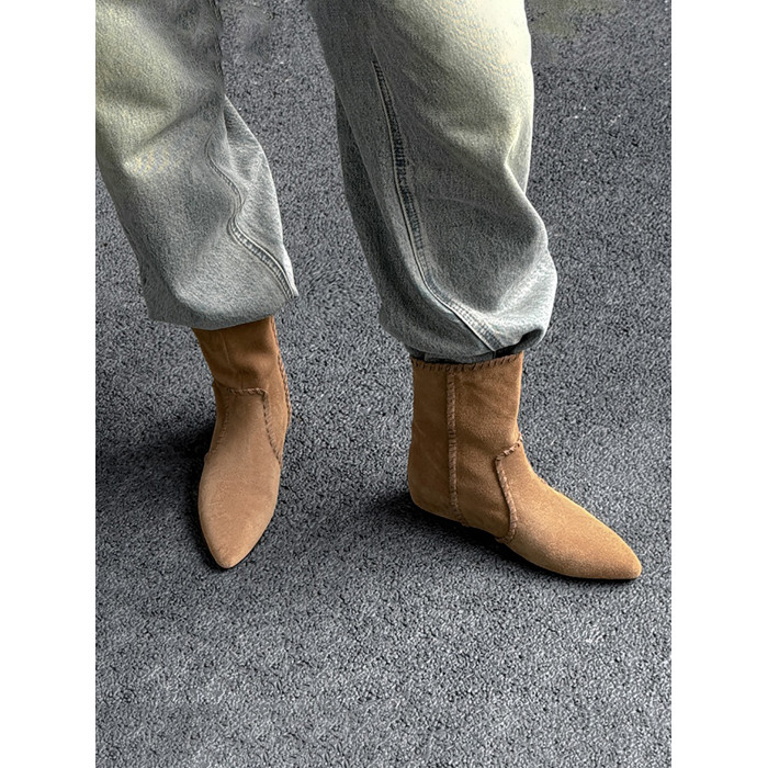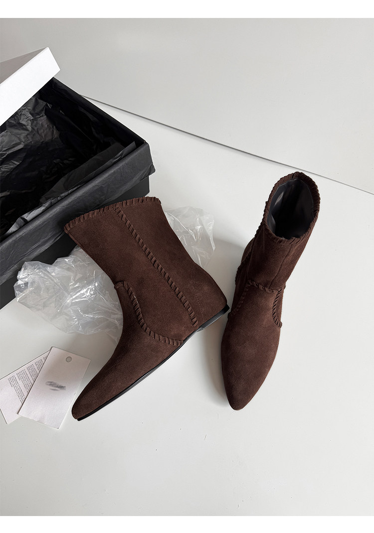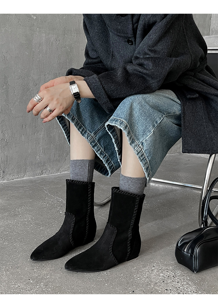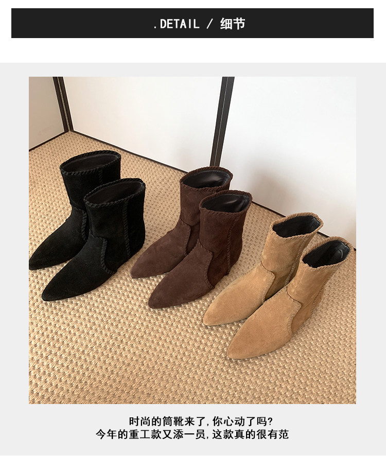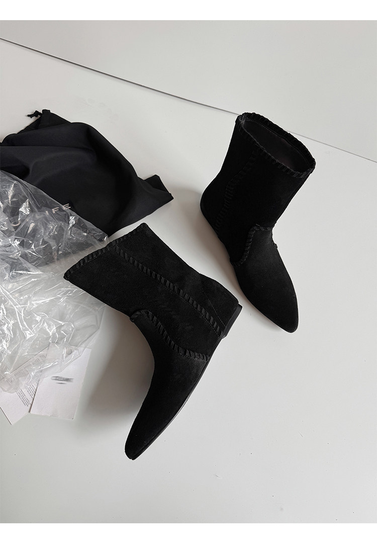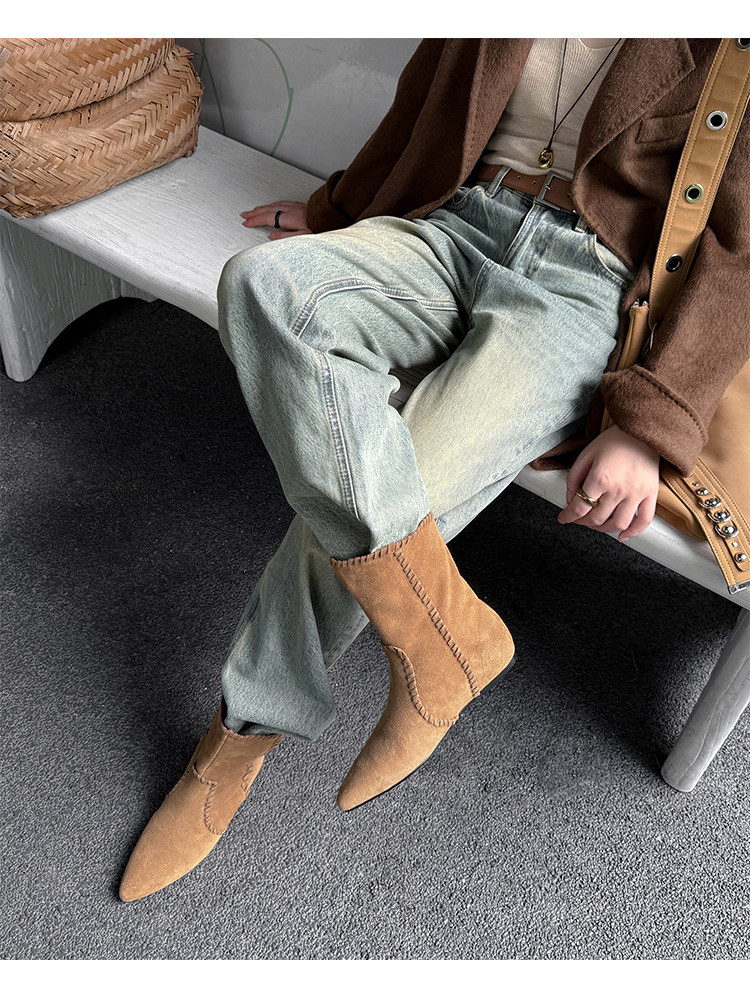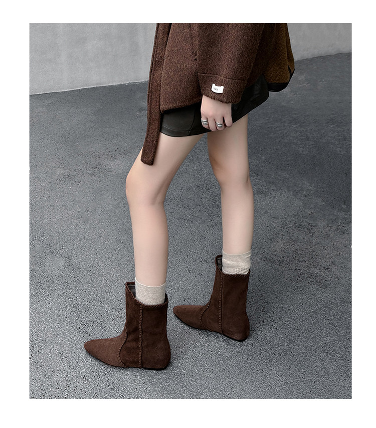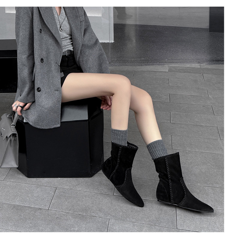 韓版英倫風磨砂絨面尖頭西部牛仔靴女一腳蹬寬筒平底短靴女內增高