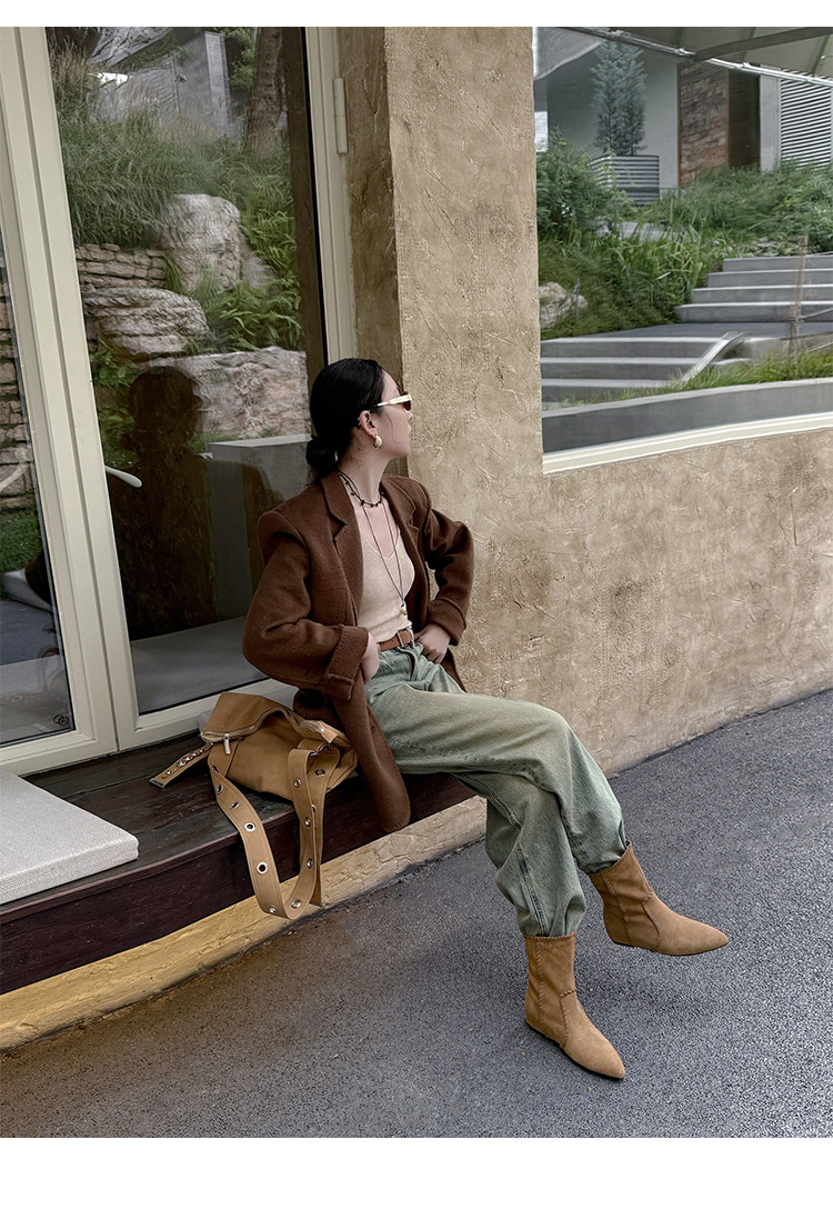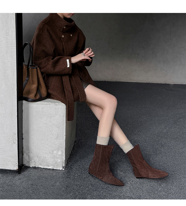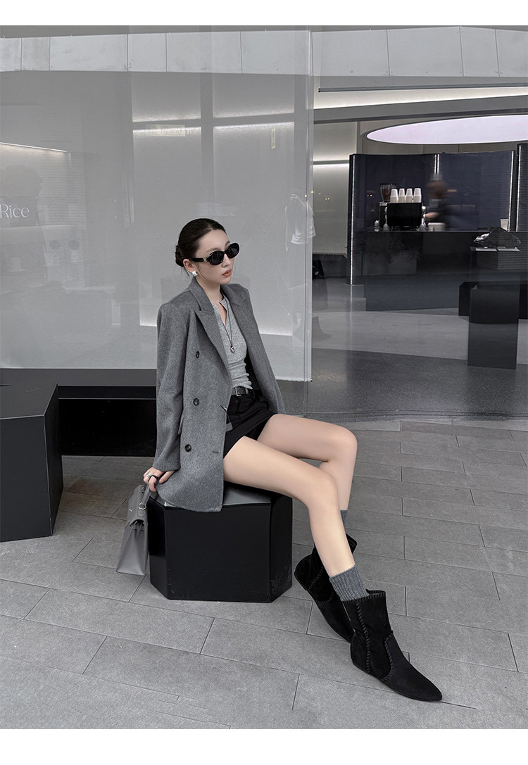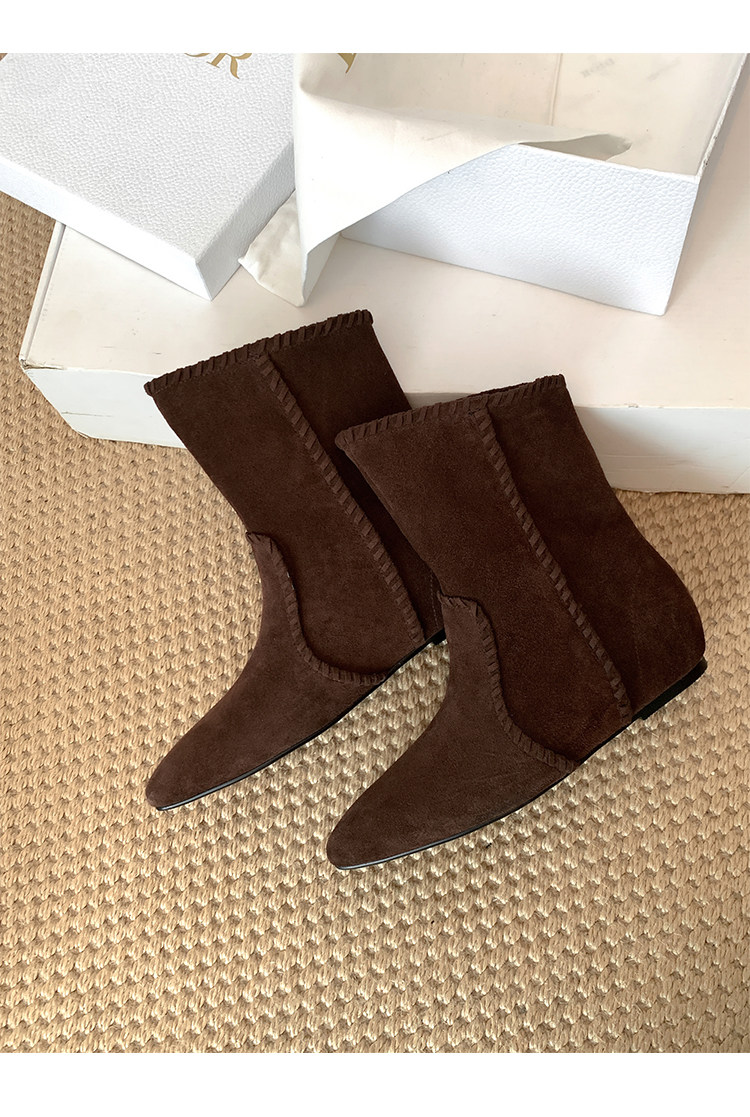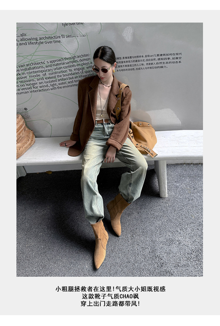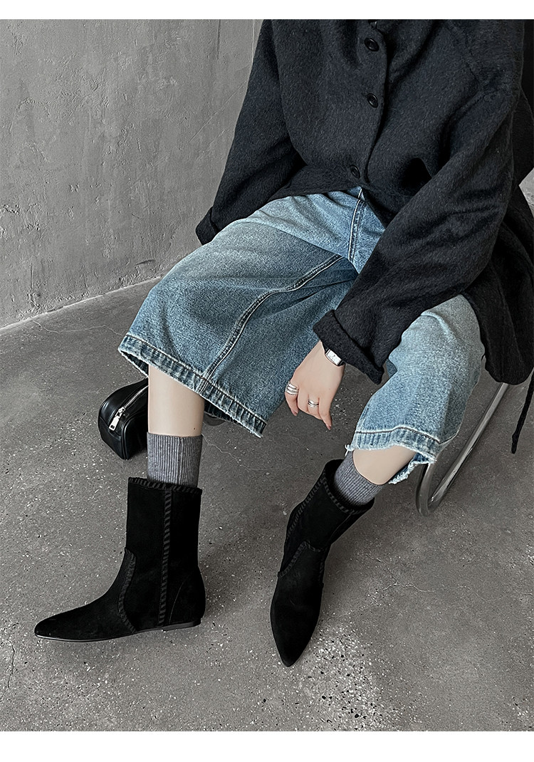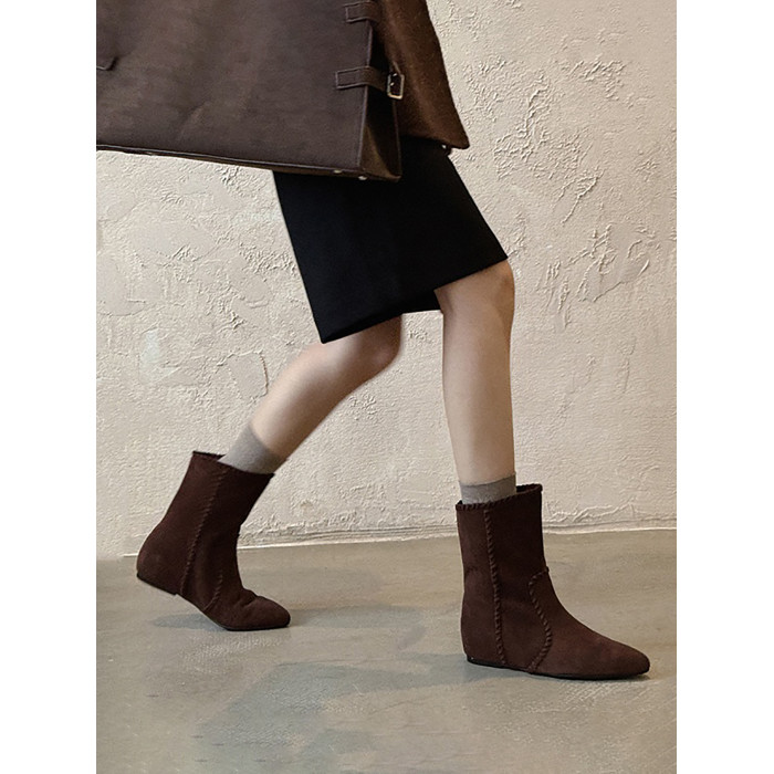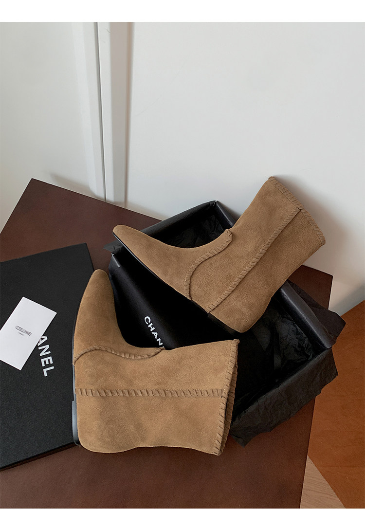 韓版英倫風磨砂絨面尖頭西部牛仔靴女一腳蹬寬筒平底短靴女內增高