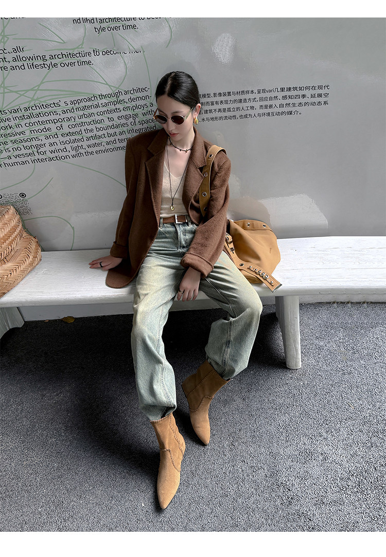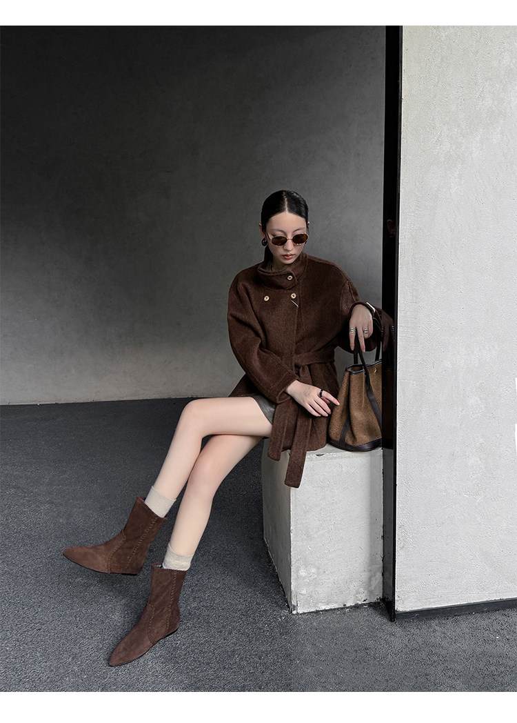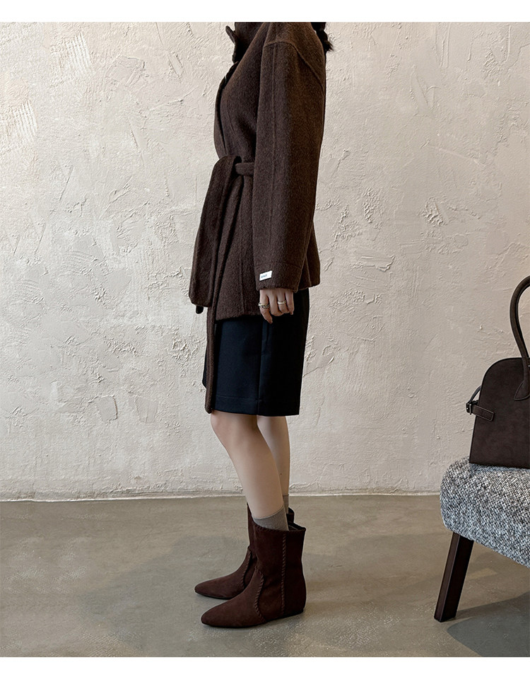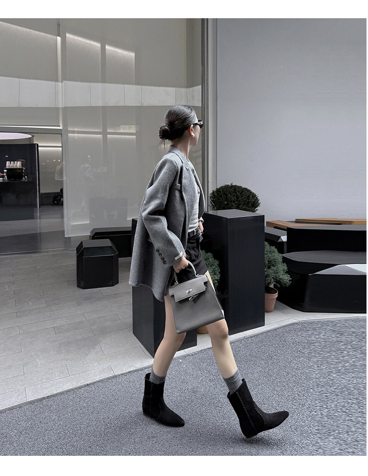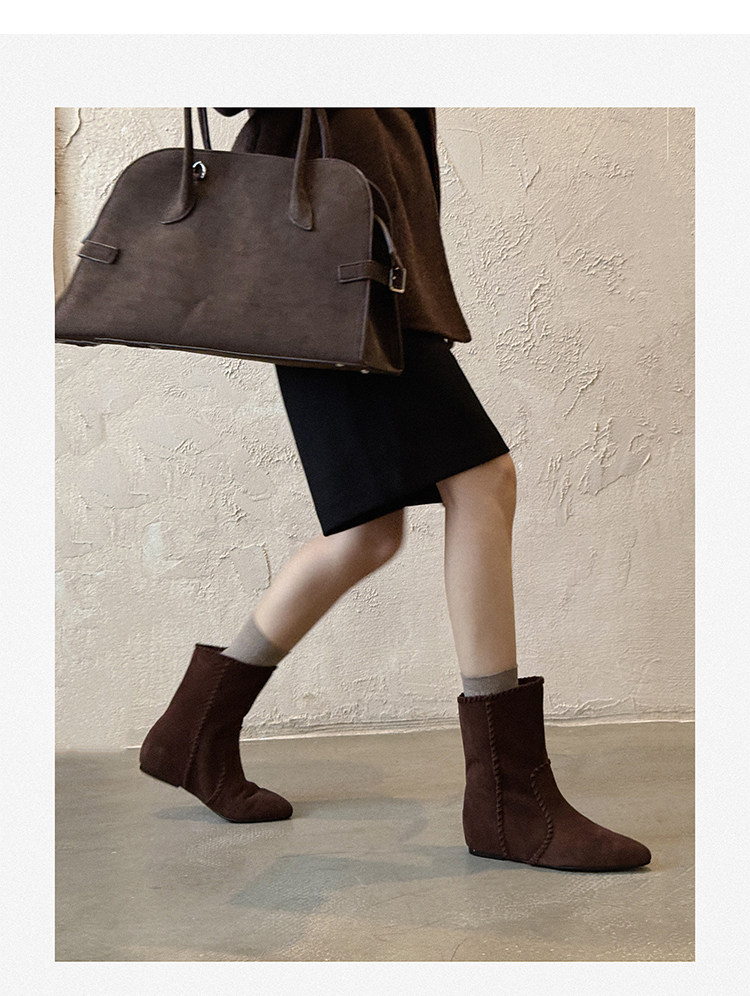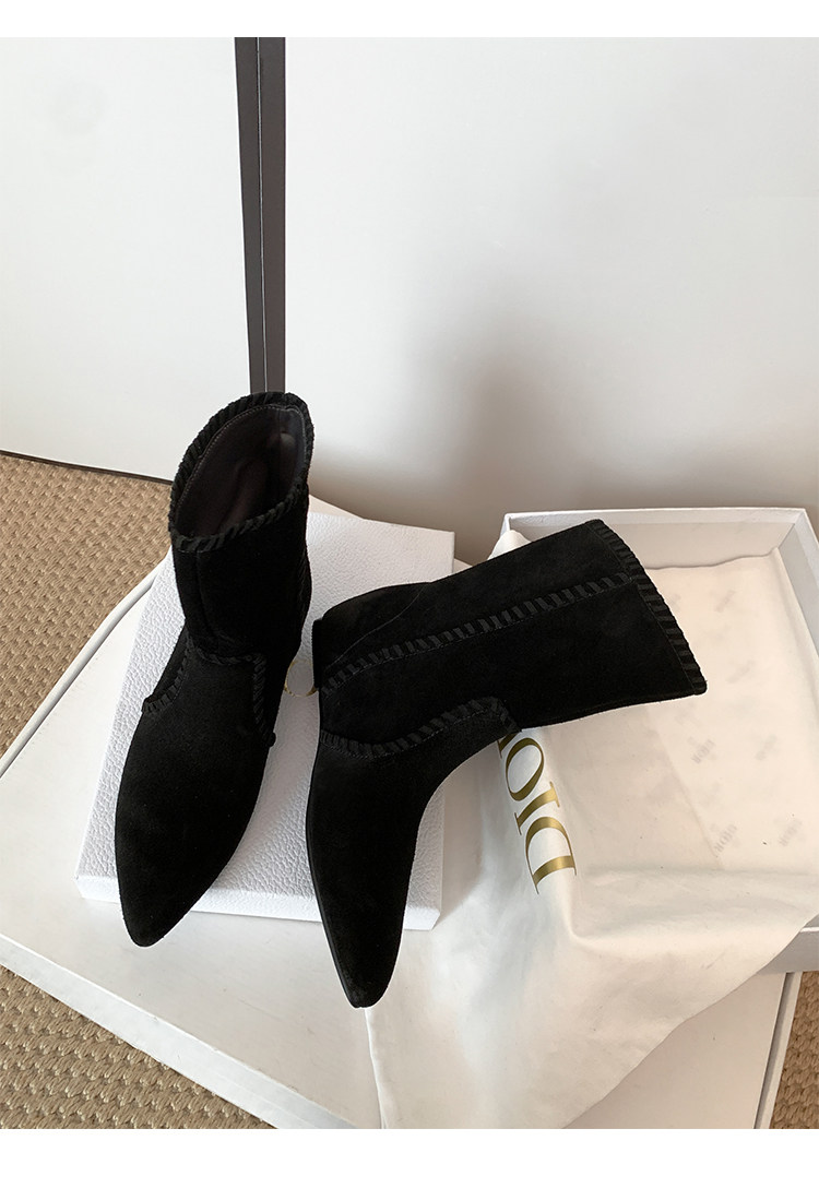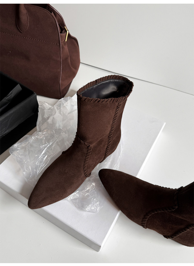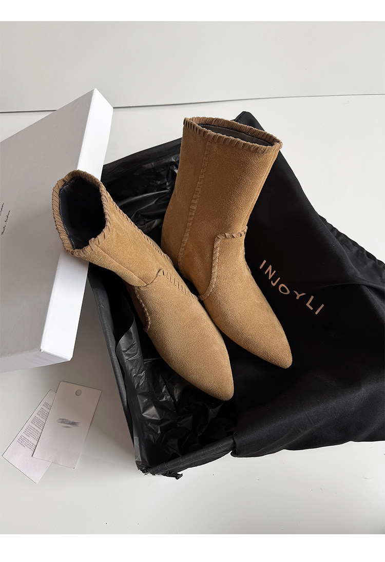 韓版英倫風磨砂絨面尖頭西部牛仔靴女一腳蹬寬筒平底短靴女內增高