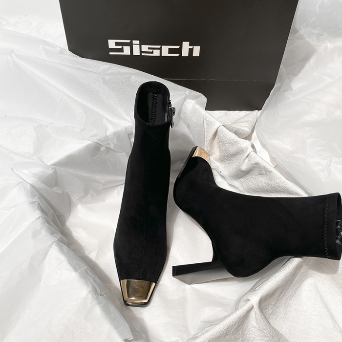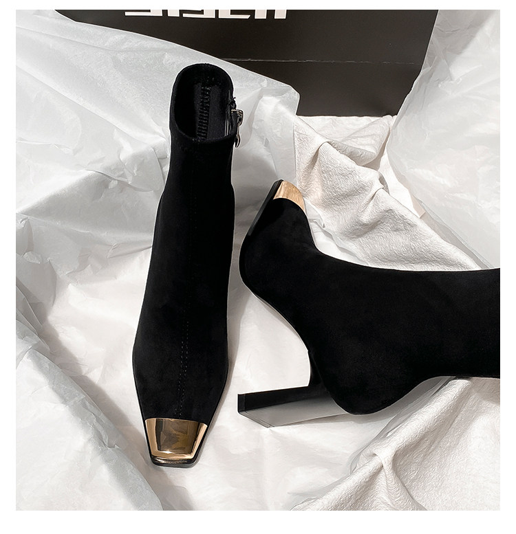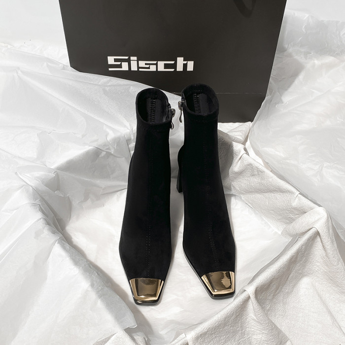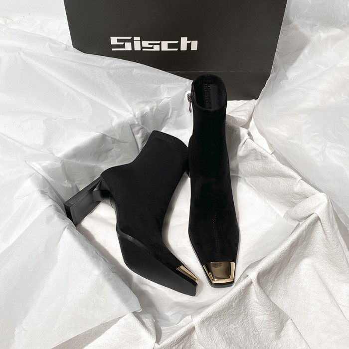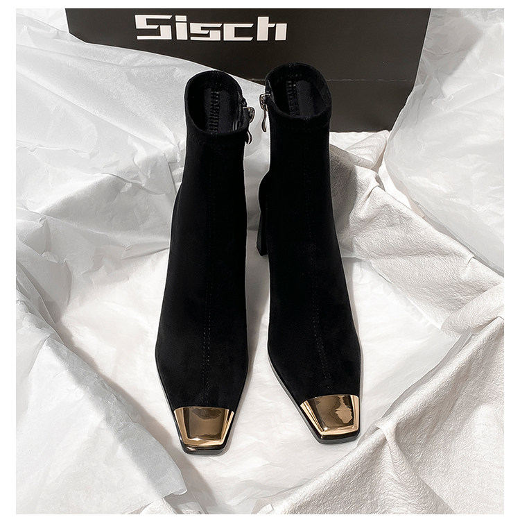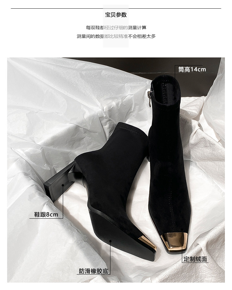 西施 金屬頭黑色絨面高跟短靴女2025年新款方頭粗跟瘦瘦靴子女