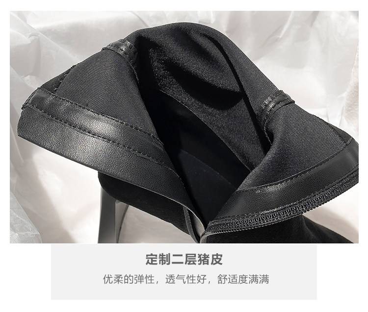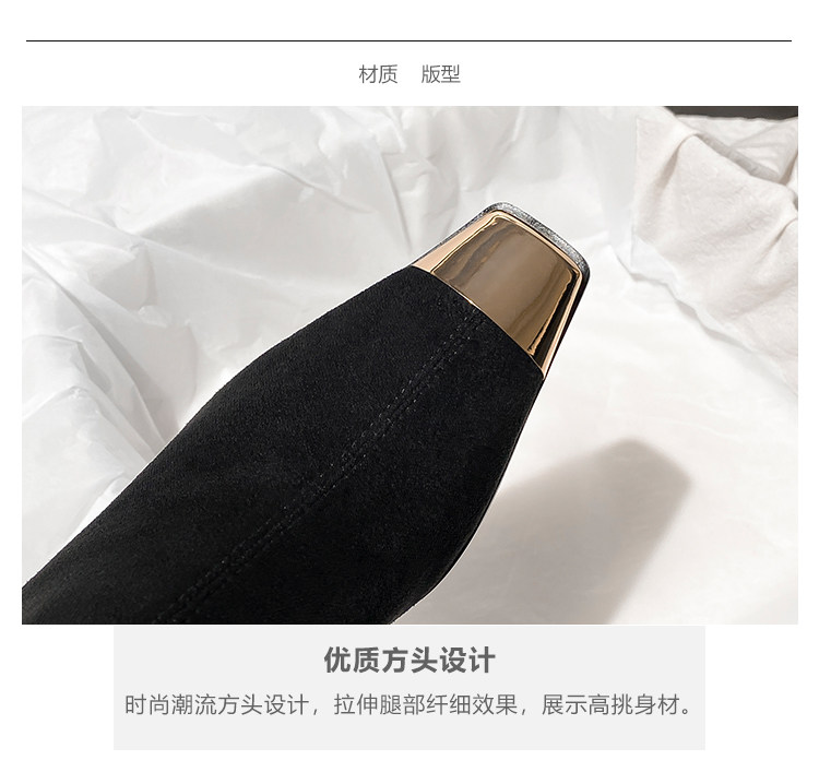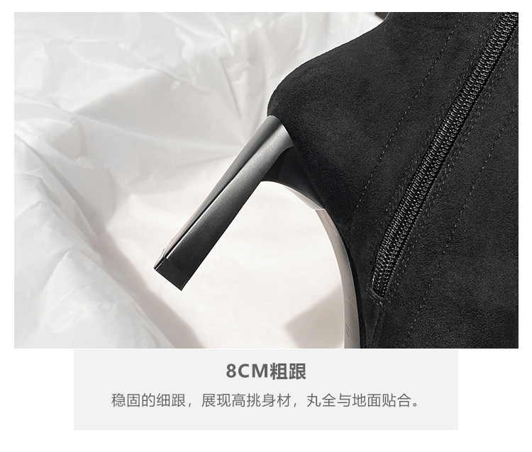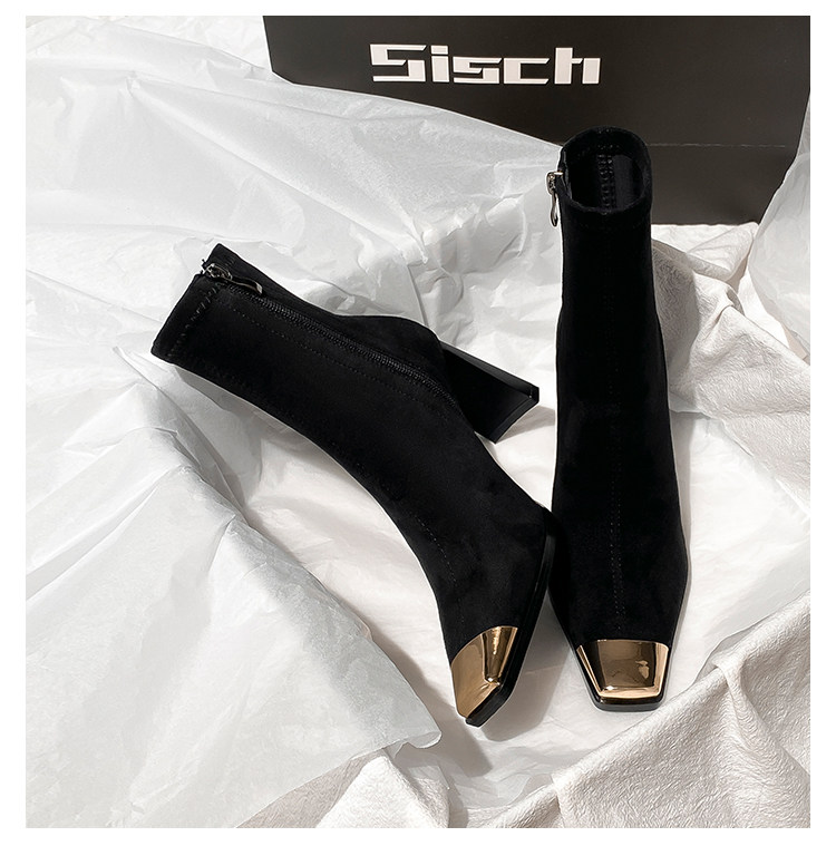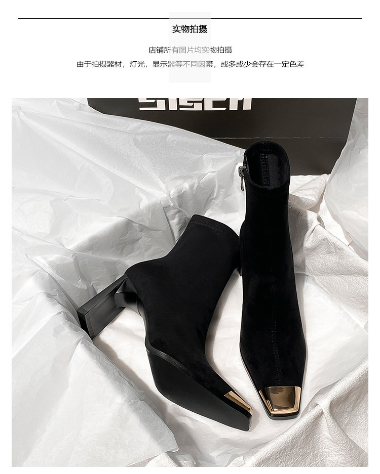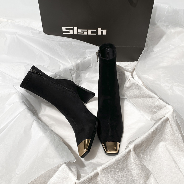 西施 金屬頭黑色絨面高跟短靴女2025年新款方頭粗跟瘦瘦靴子女