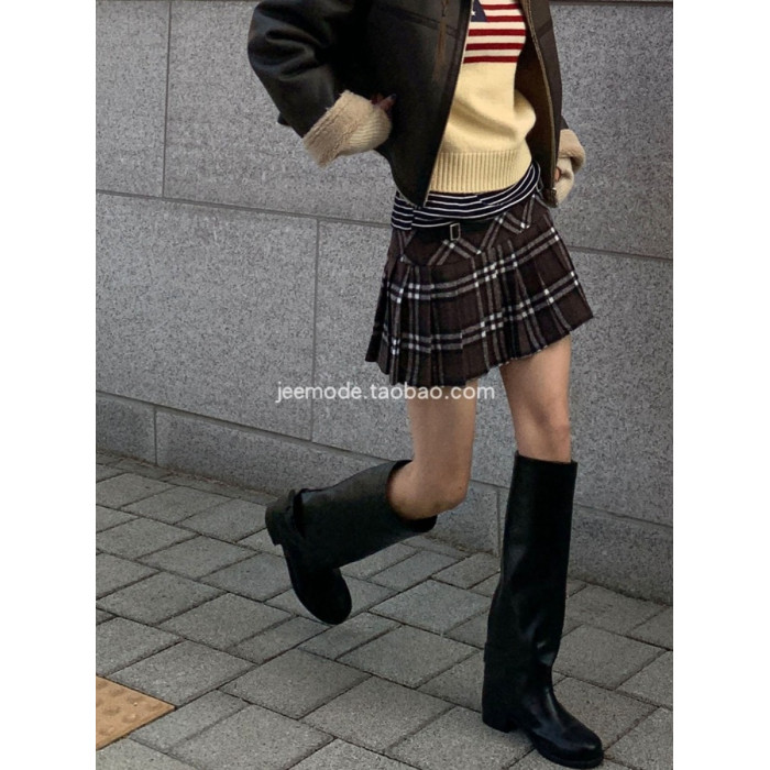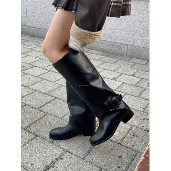 小池在首爾2025秋季新款圓頭方跟皮帶釦套筒寬鬆騎士復古長筒靴