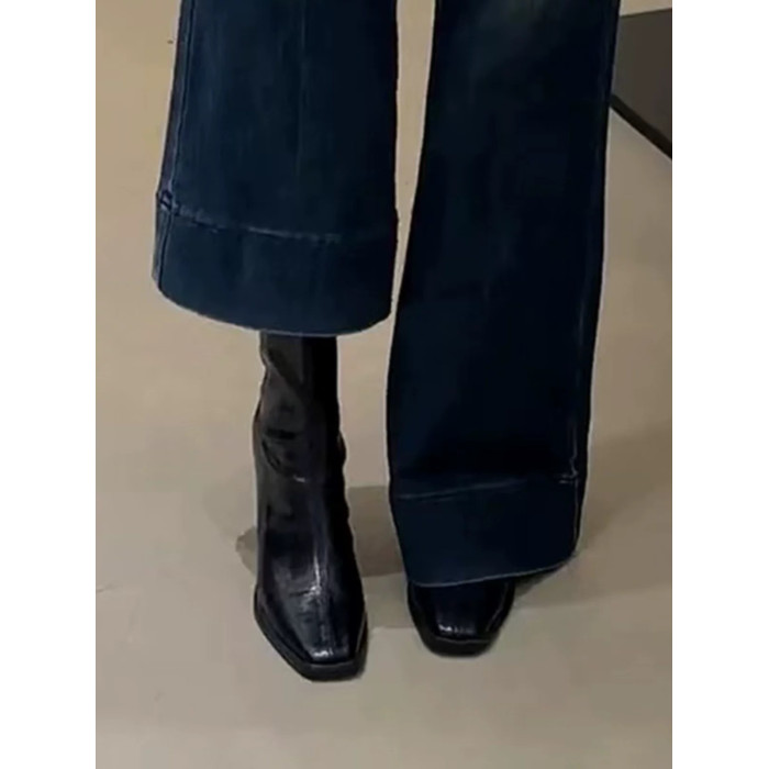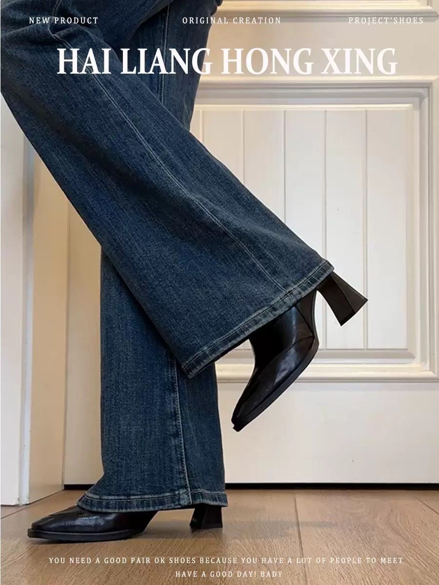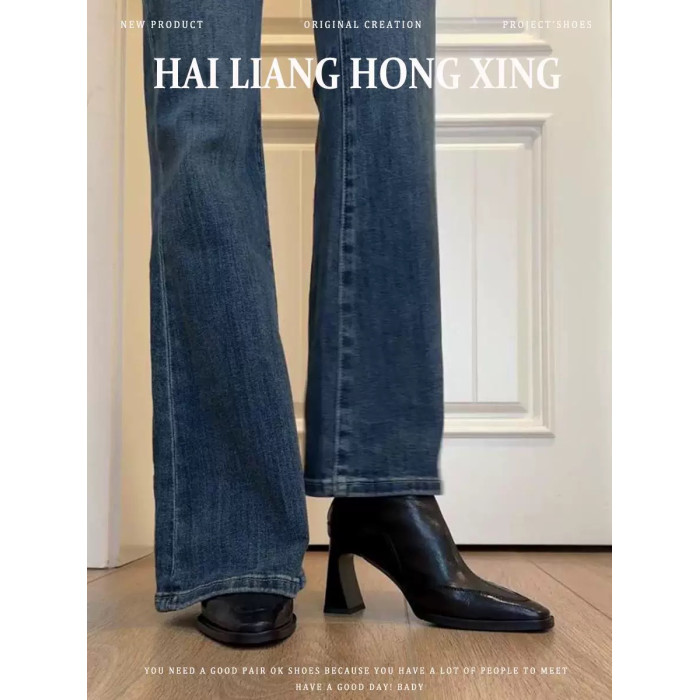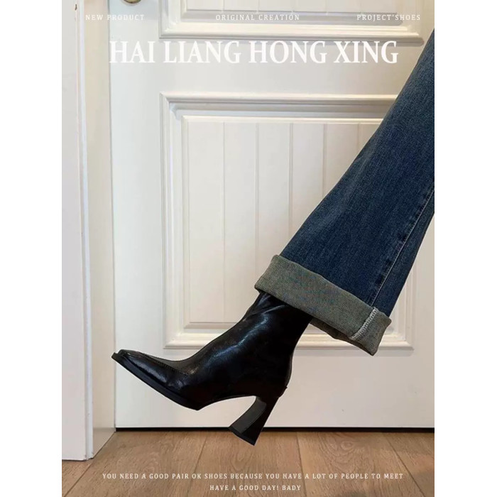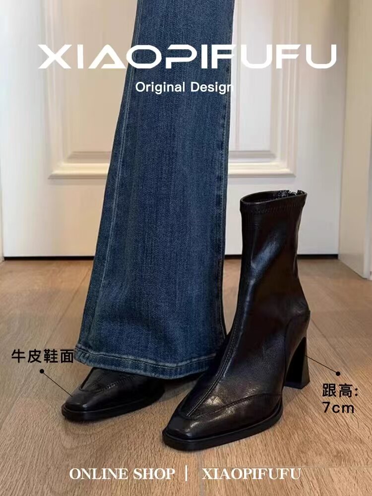 羊皮版~高跟短靴女2025秋冬新款方頭馬丁靴小個子法式粗跟瘦瘦靴