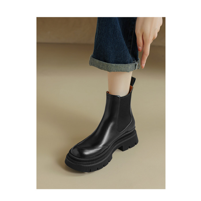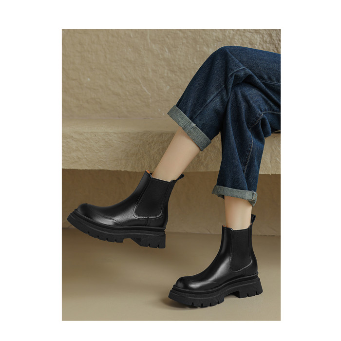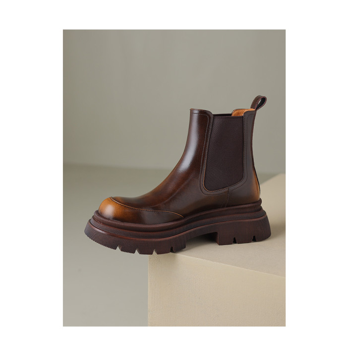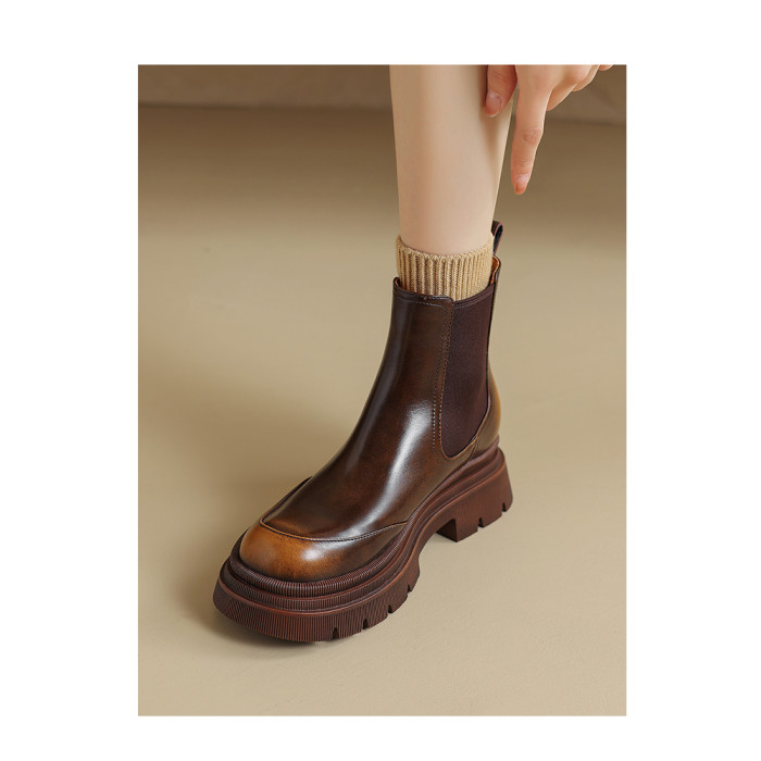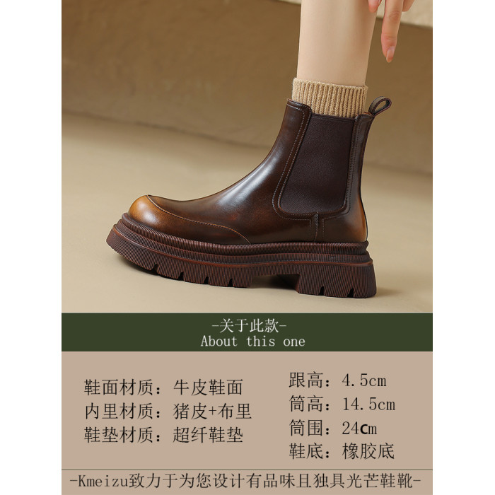 Kmeizu擦色厚底短靴女秋冬馬丁靴真皮菸筒靴真皮機車靴切爾西踝靴