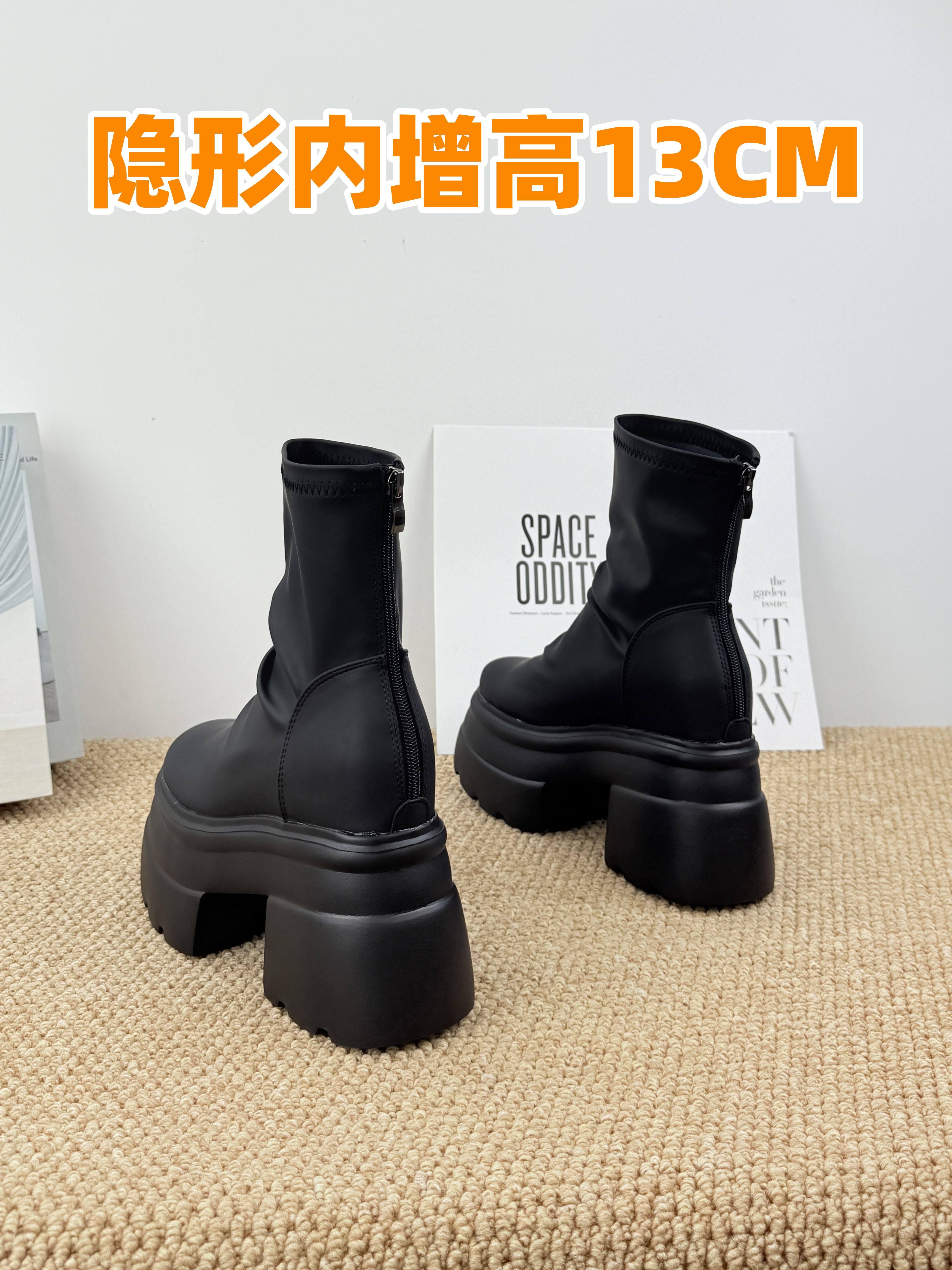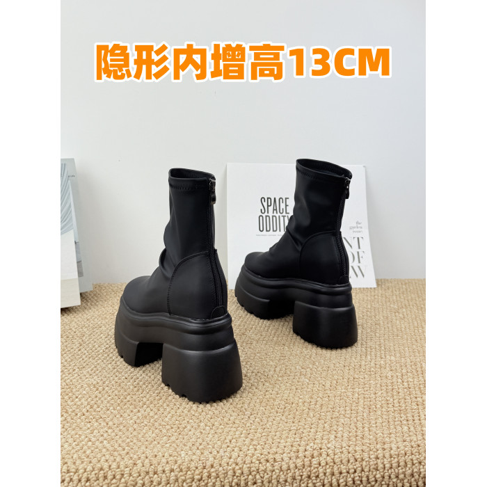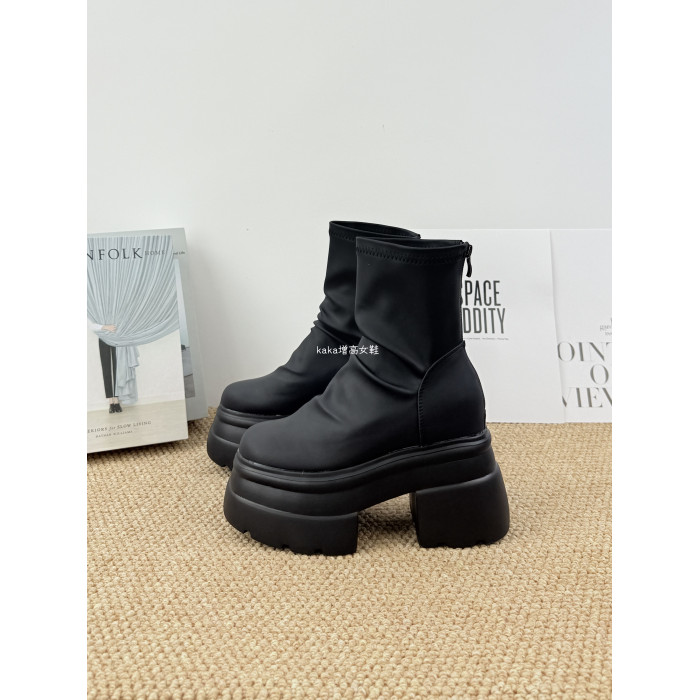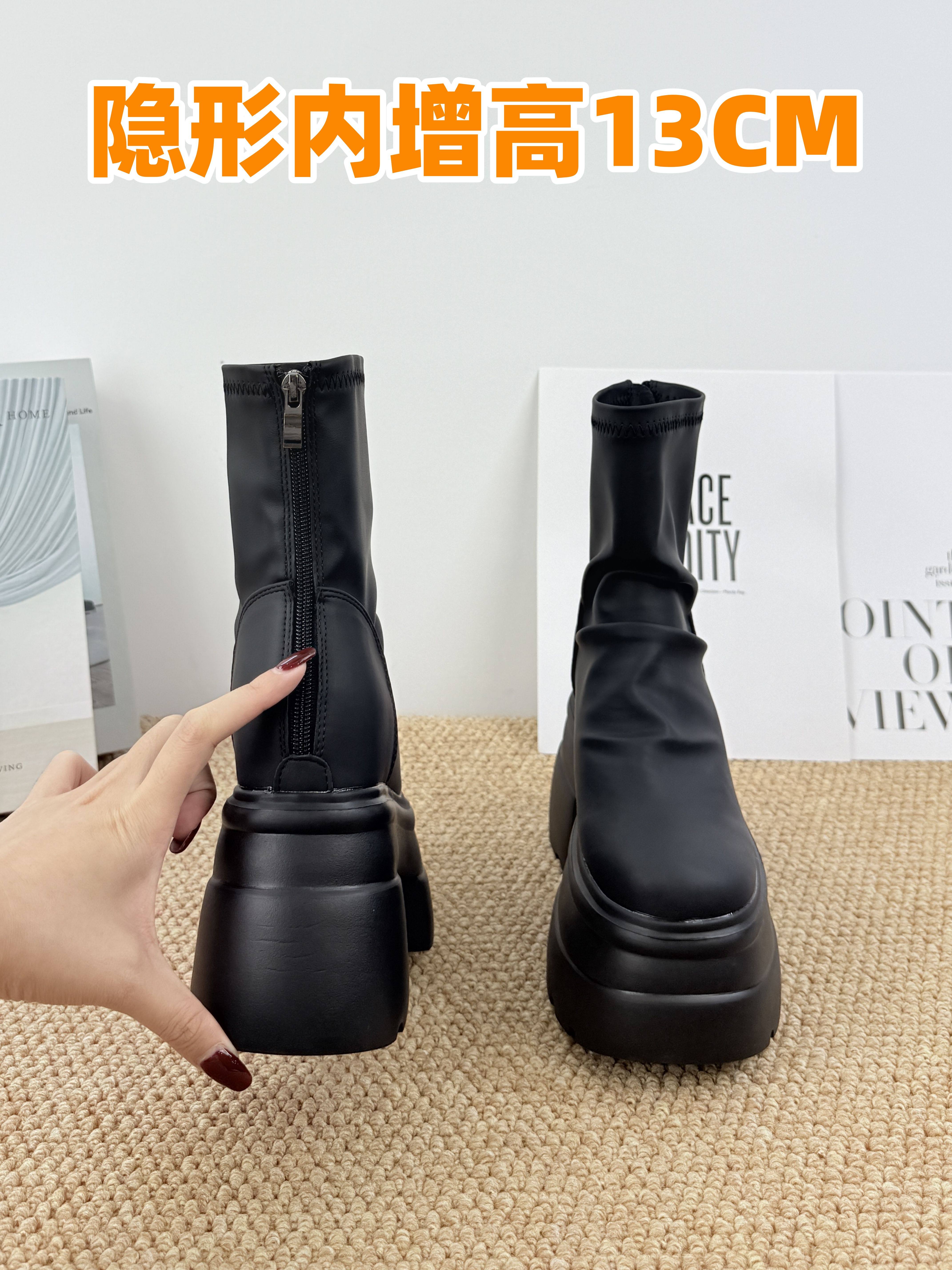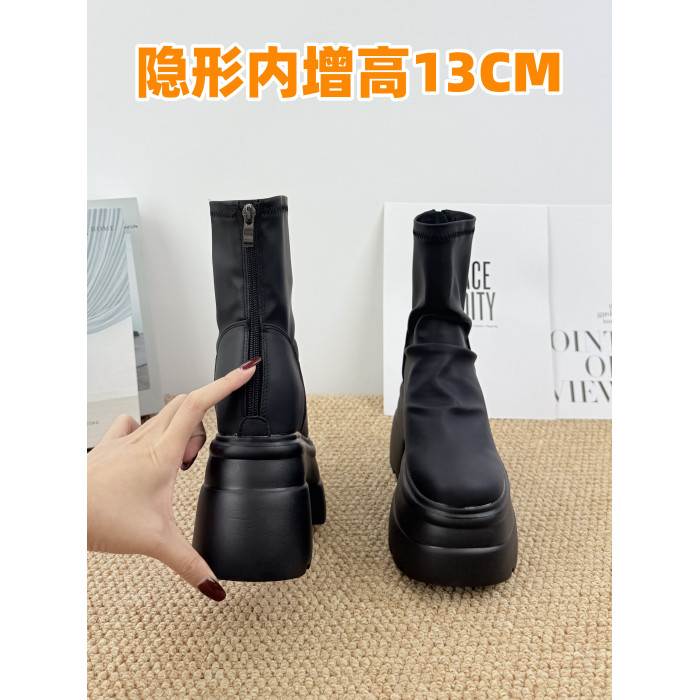 內增高13cm褶皺馬丁靴女黑色超厚底松糕菸筒靴英倫風彈力瘦瘦短靴