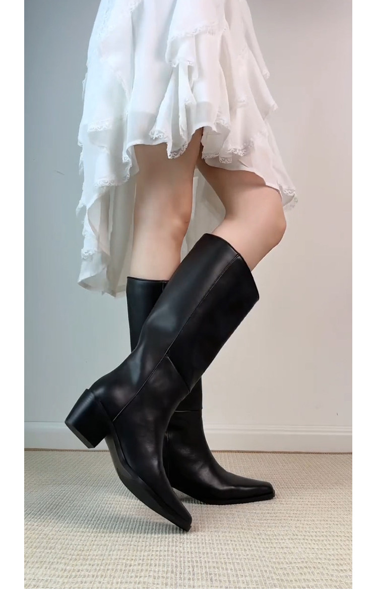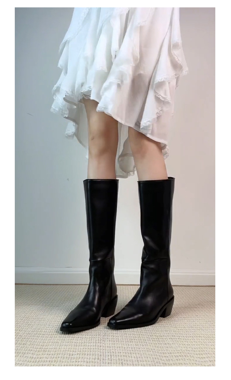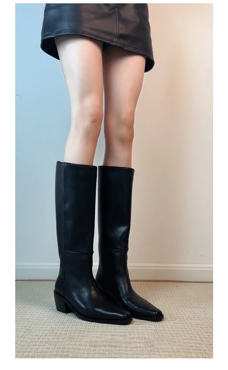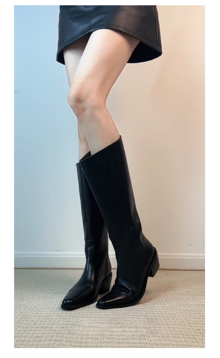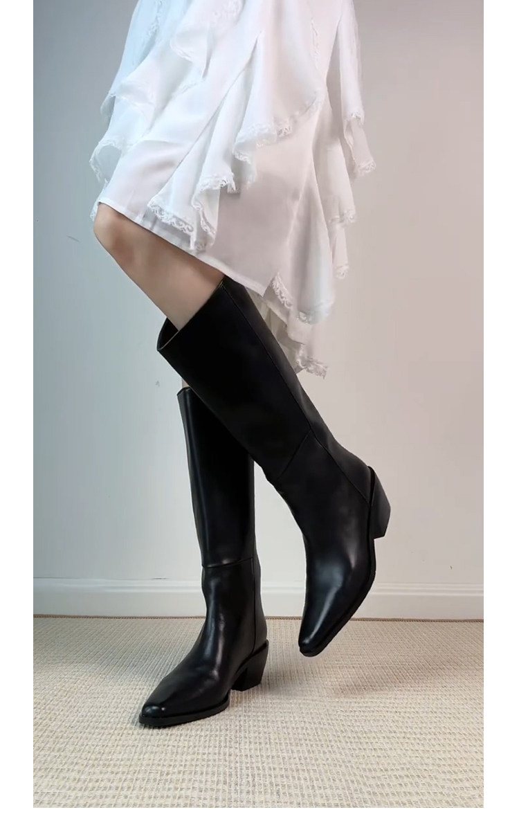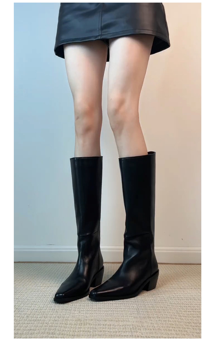 牛皮版~秋冬尖頭高筒騎士靴粗跟長筒靴女不過膝靴子寬筒高跟長靴