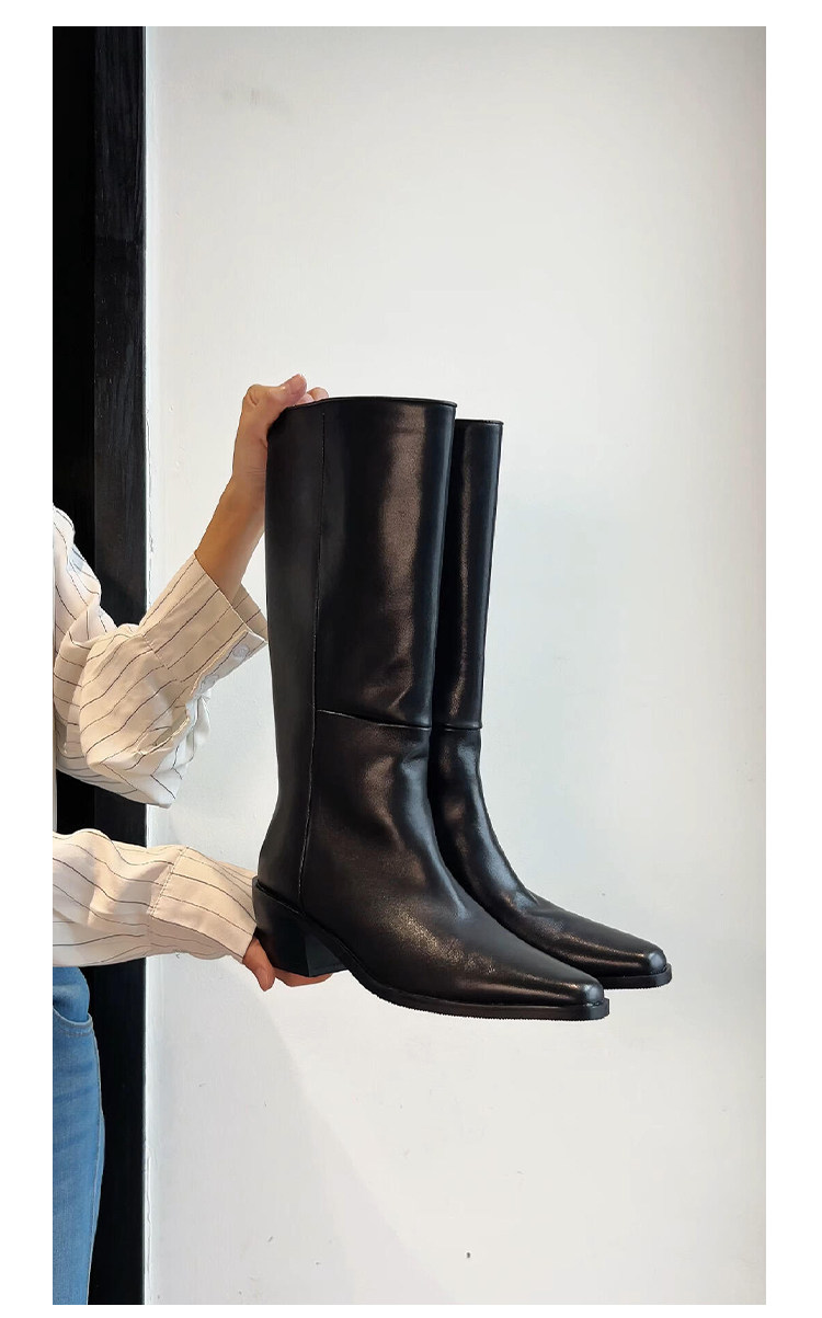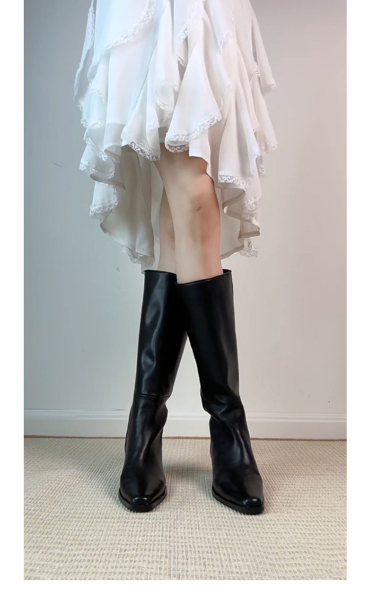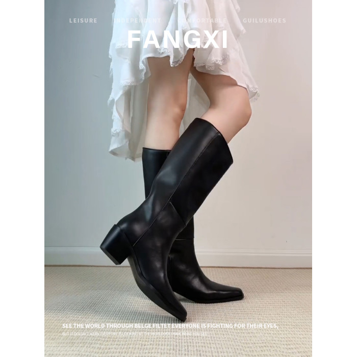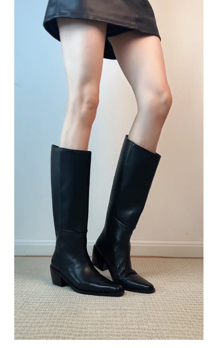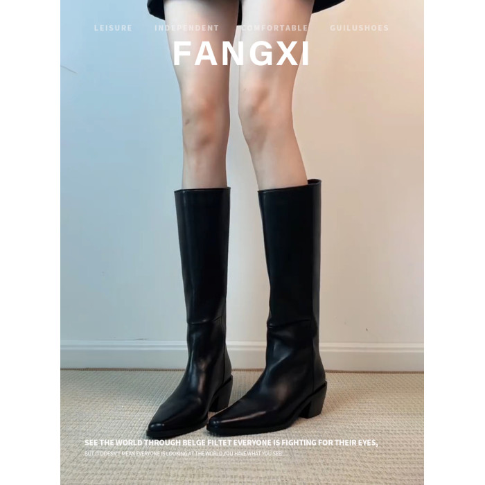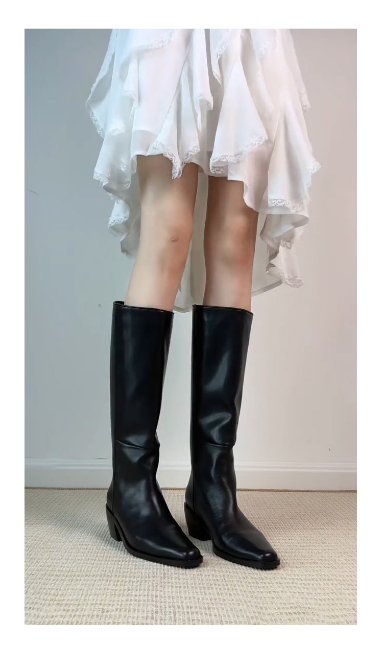 牛皮版~秋冬尖頭高筒騎士靴粗跟長筒靴女不過膝靴子寬筒高跟長靴