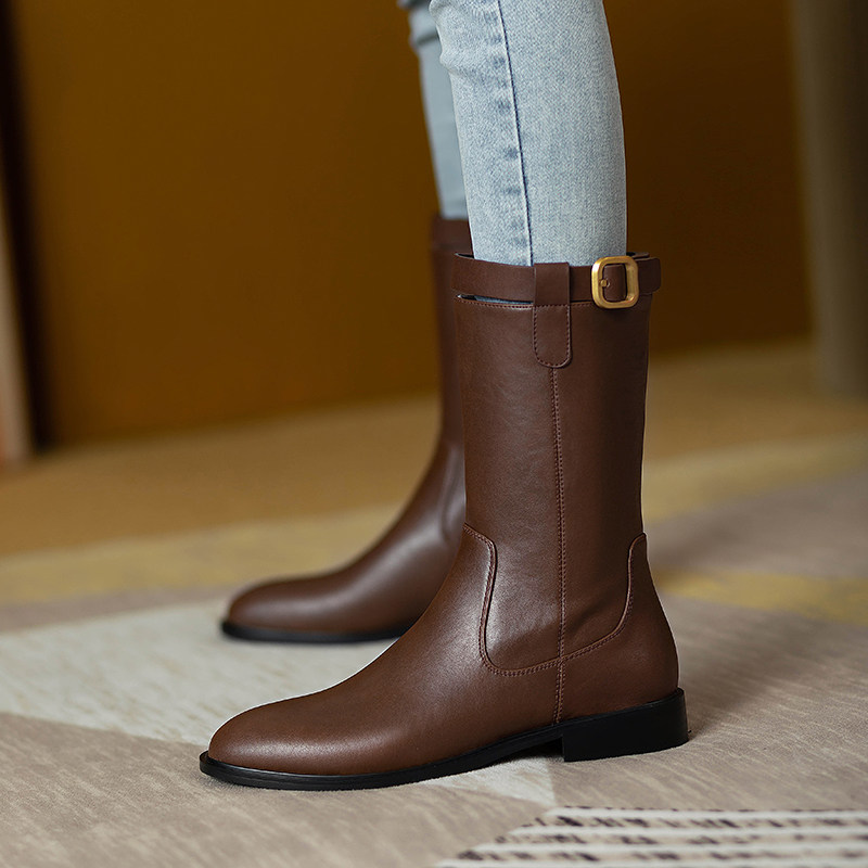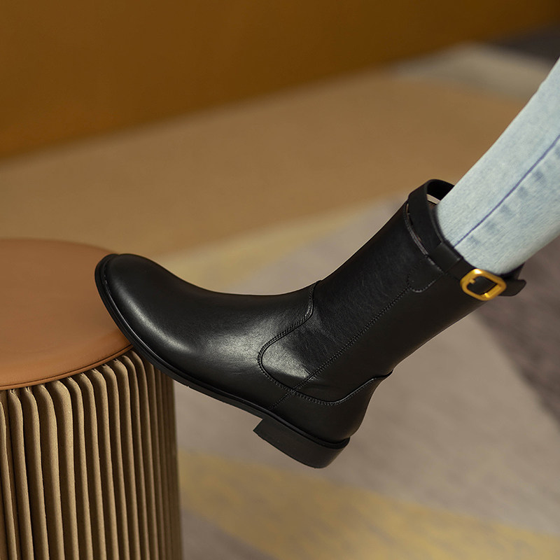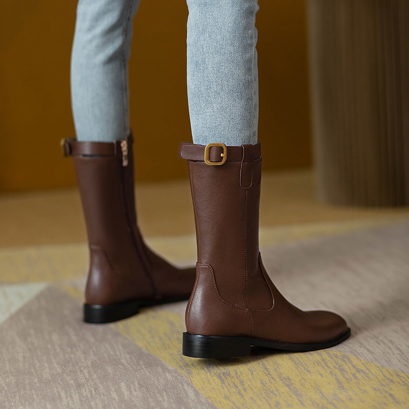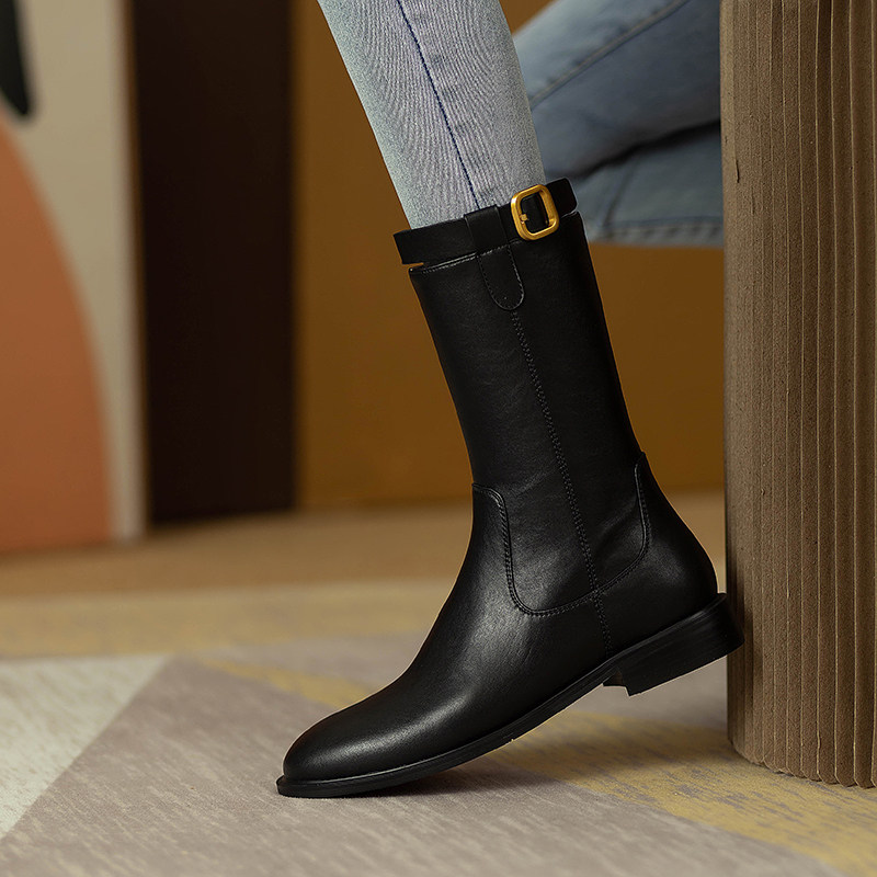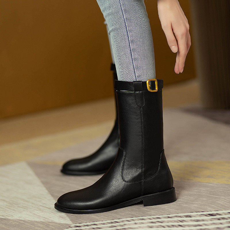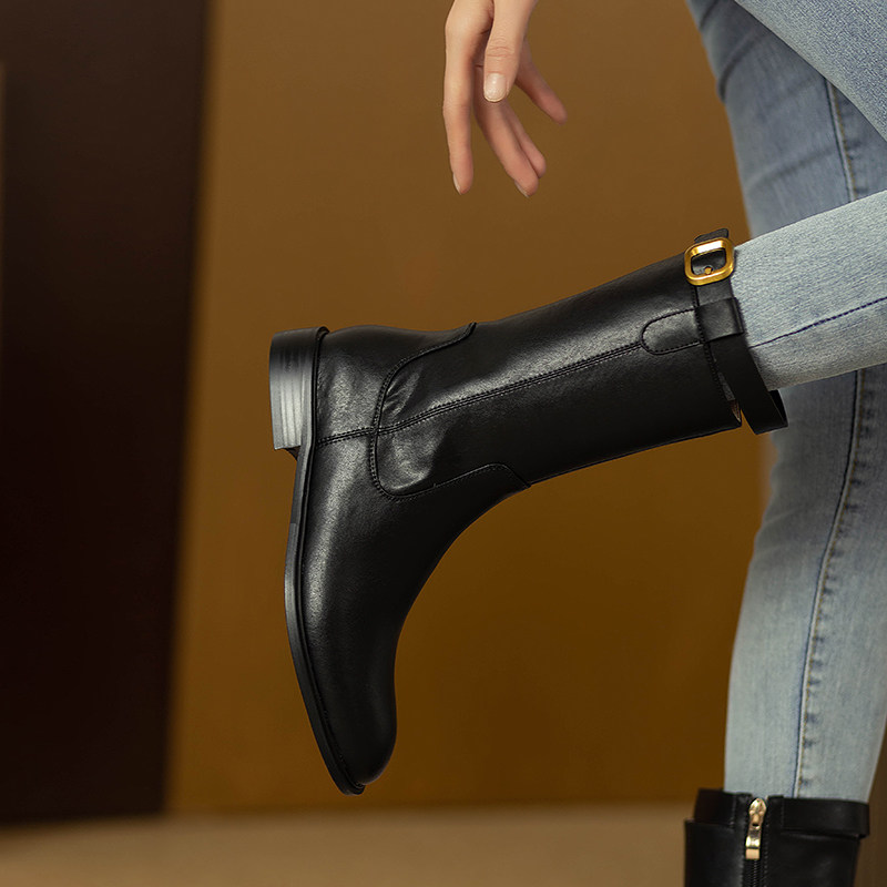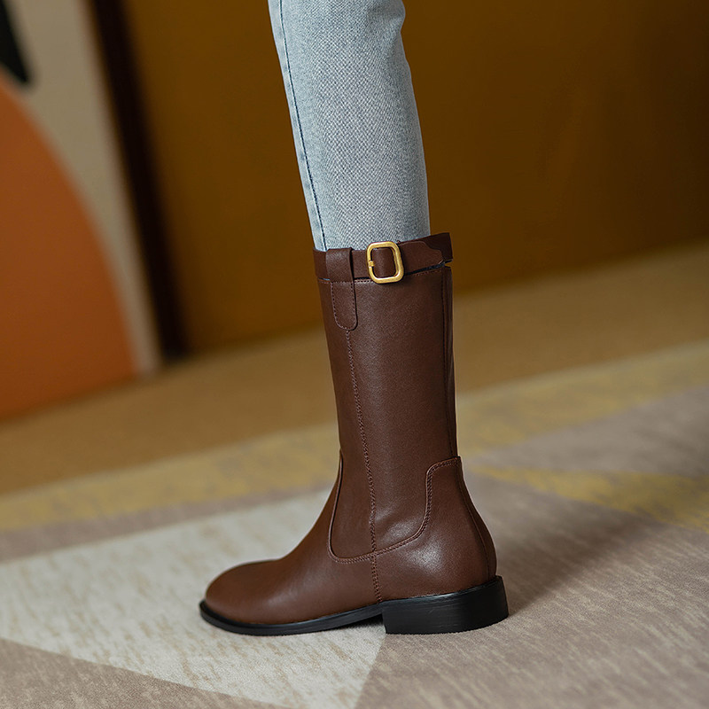 2024爆款頭層牛皮圓頭低跟真皮中筒靴女復古百搭粗跟皮帶釦騎士靴
