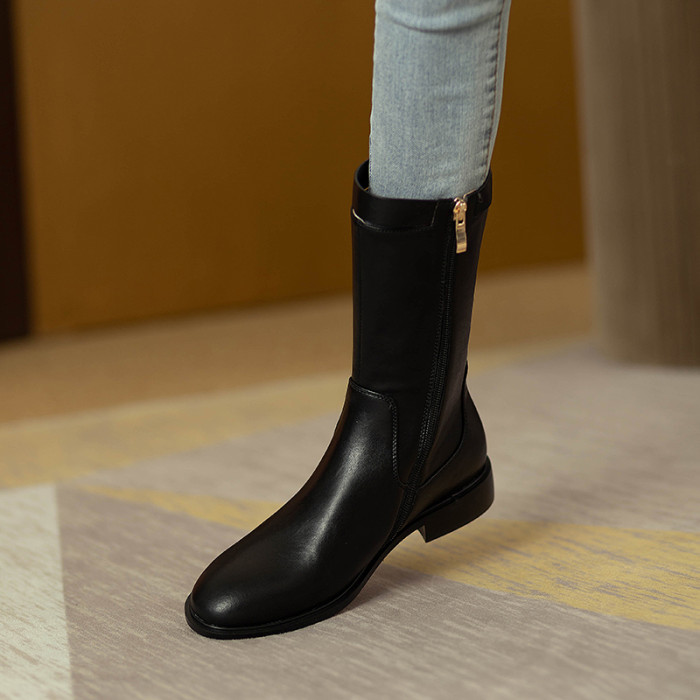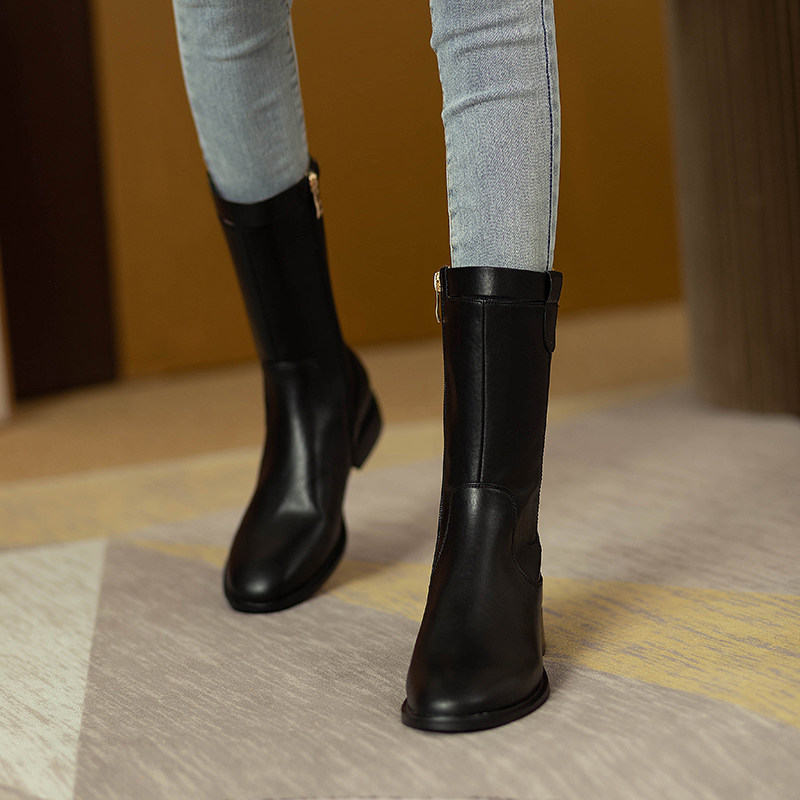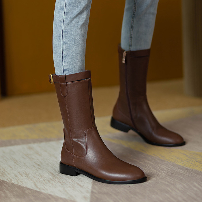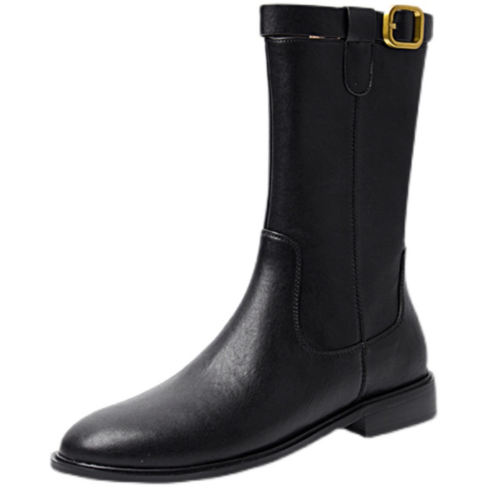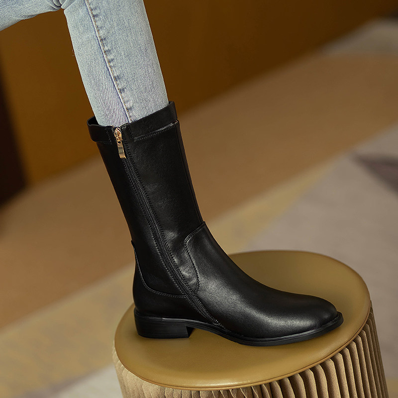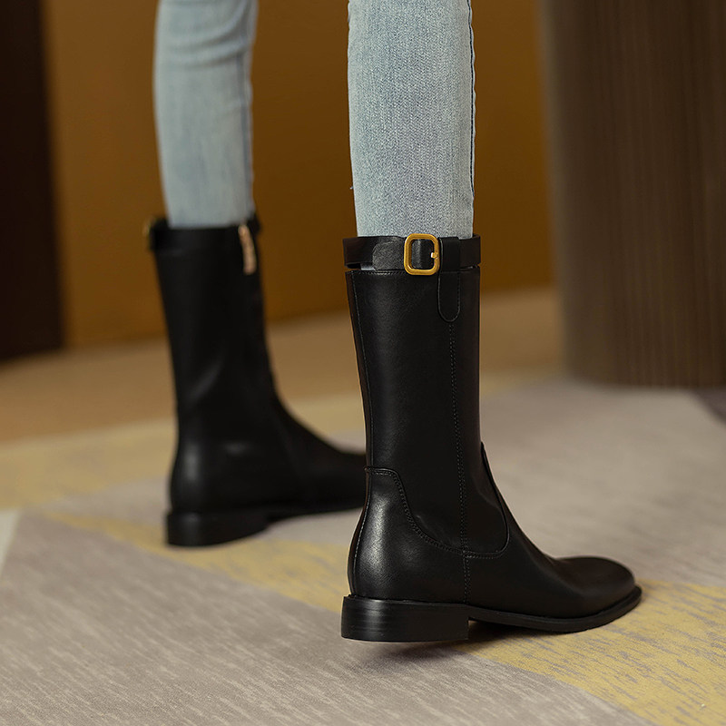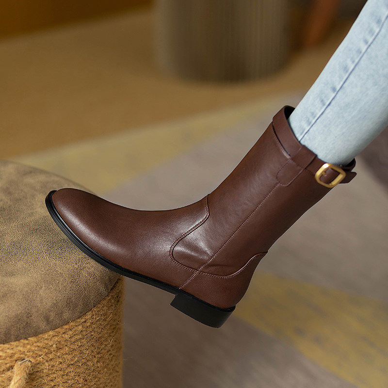 2024爆款頭層牛皮圓頭低跟真皮中筒靴女復古百搭粗跟皮帶釦騎士靴