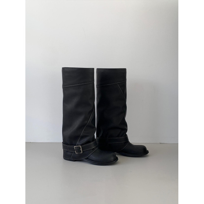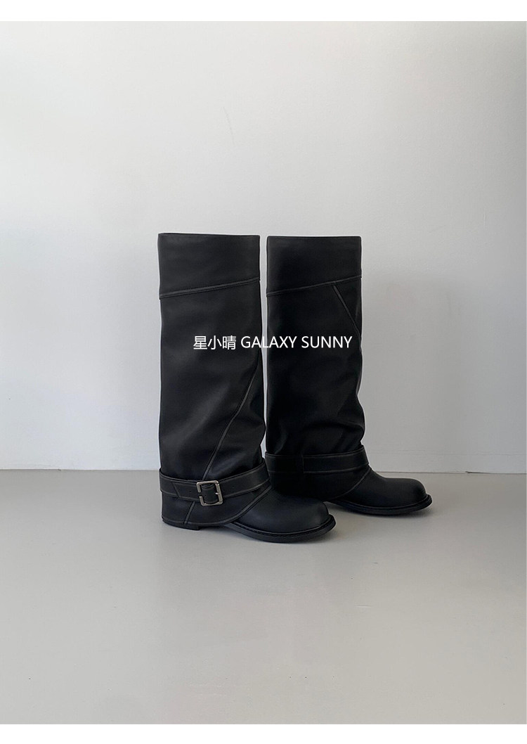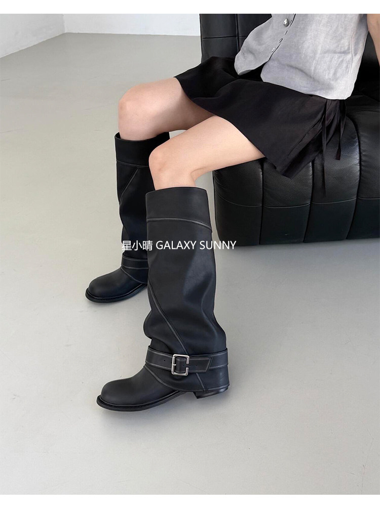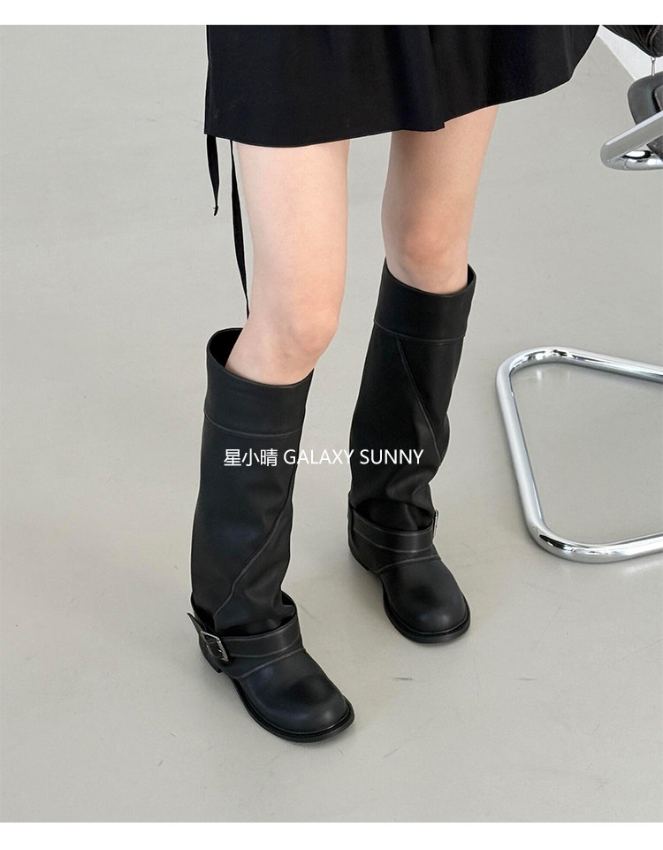 羊皮版~韓版設計感圓頭皮帶釦粗跟騎士靴甜酷風黑色顯瘦百搭長靴