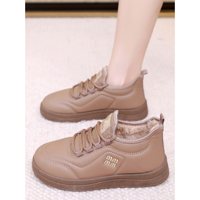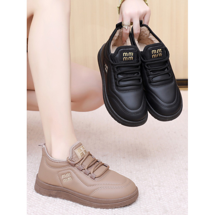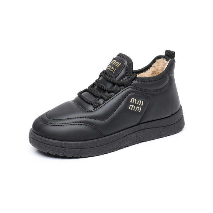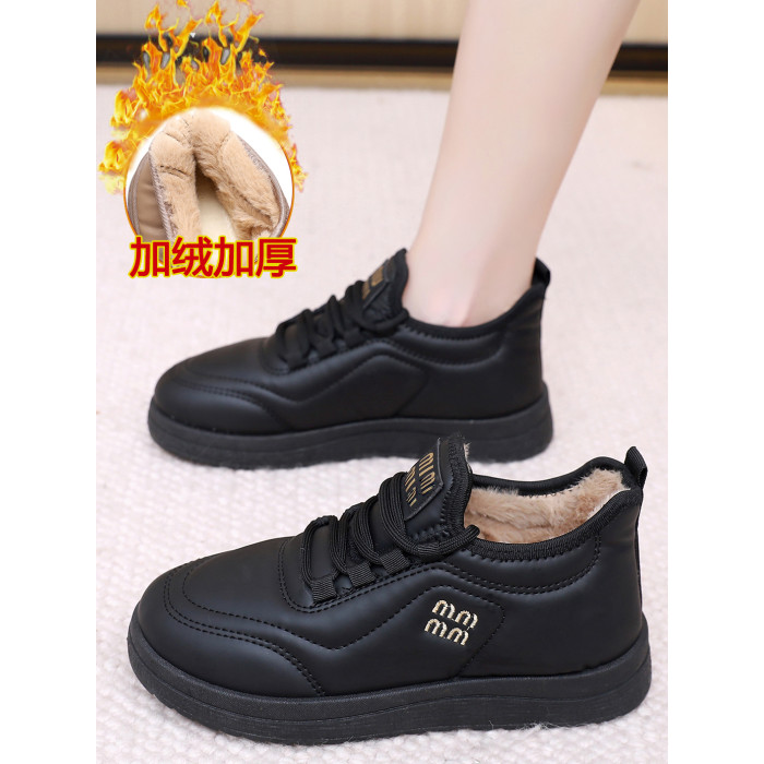 老北京布鞋女冬季加絨皮面防水媽媽休閒運動鞋厚底一腳蹬防滑棉靴