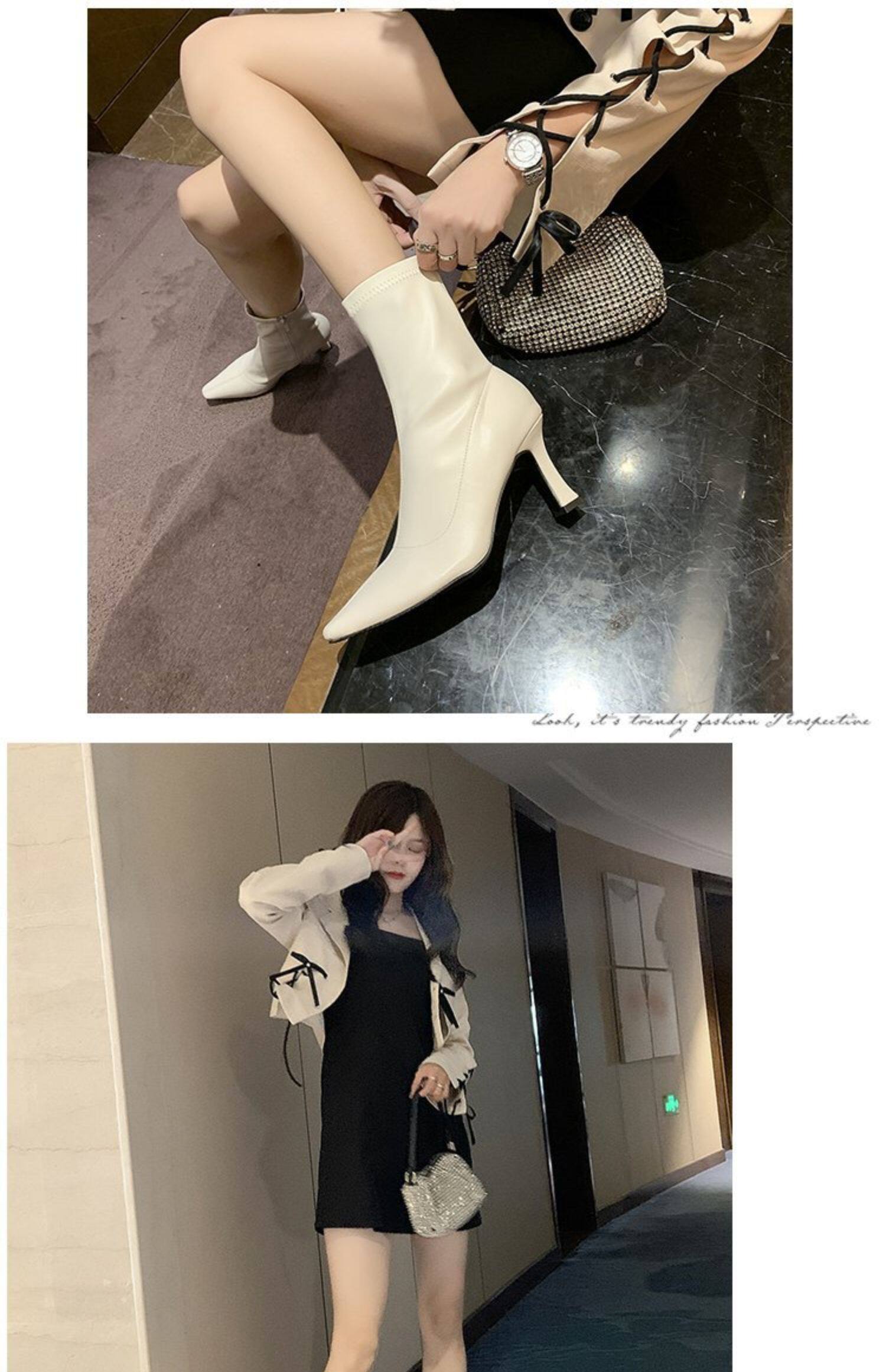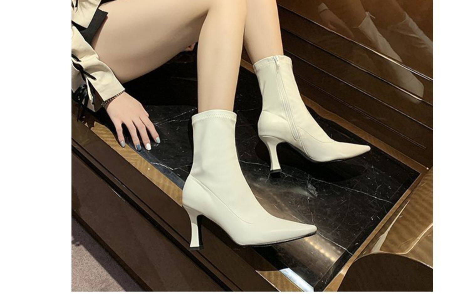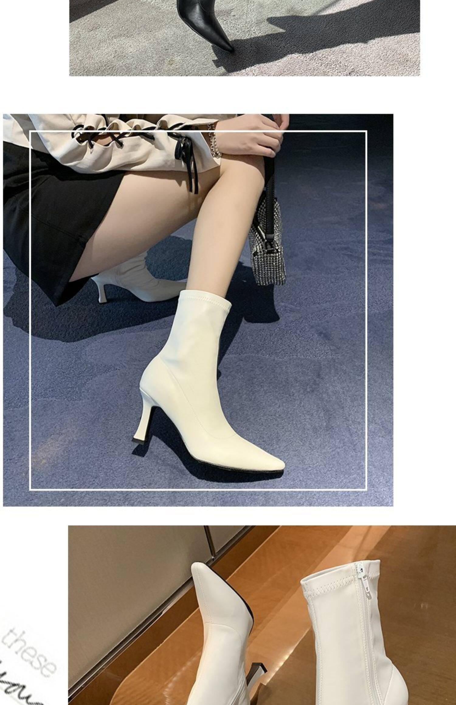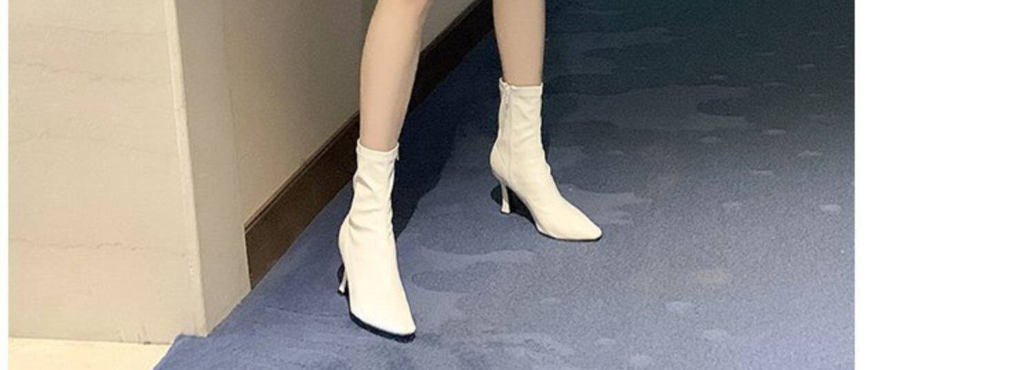 白色加絨短靴女2026春秋季新款時裝靴子尖頭細跟高跟鞋中筒馬丁靴