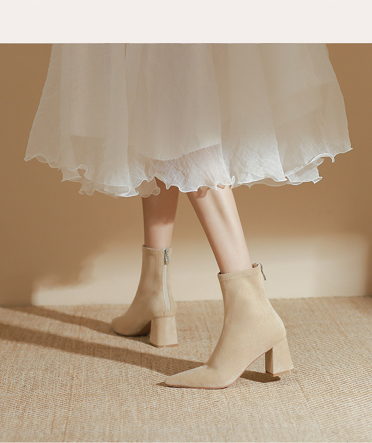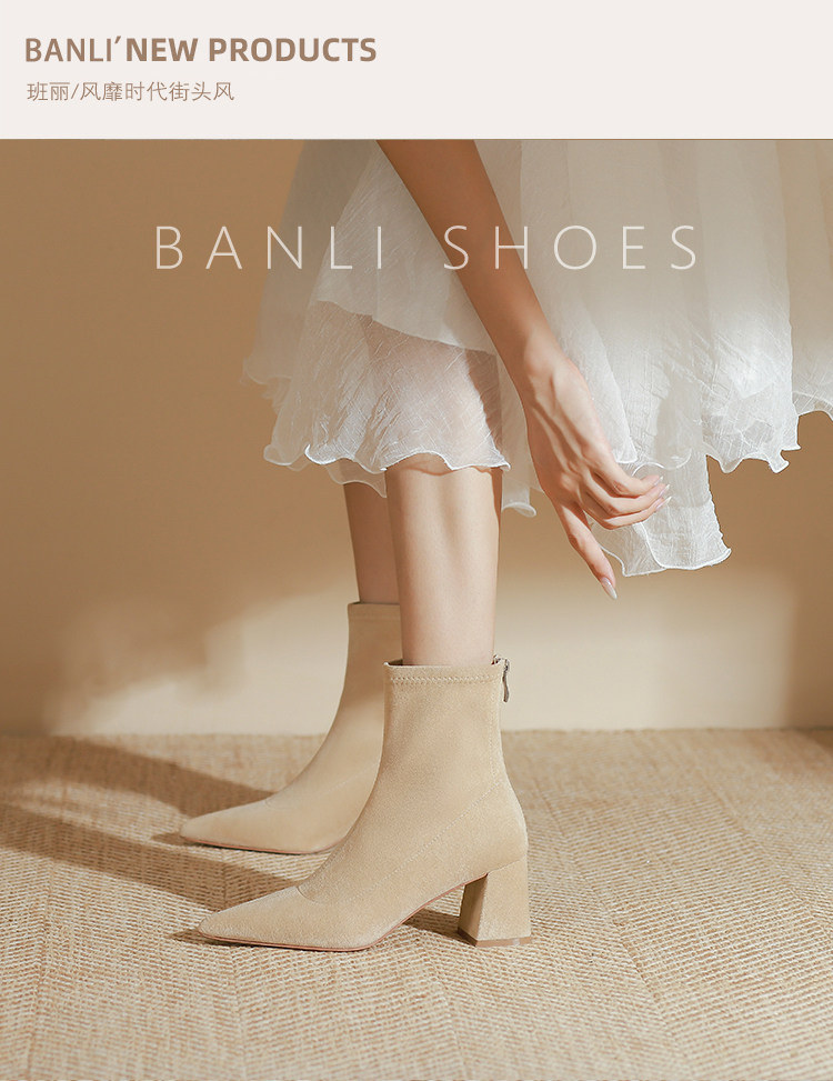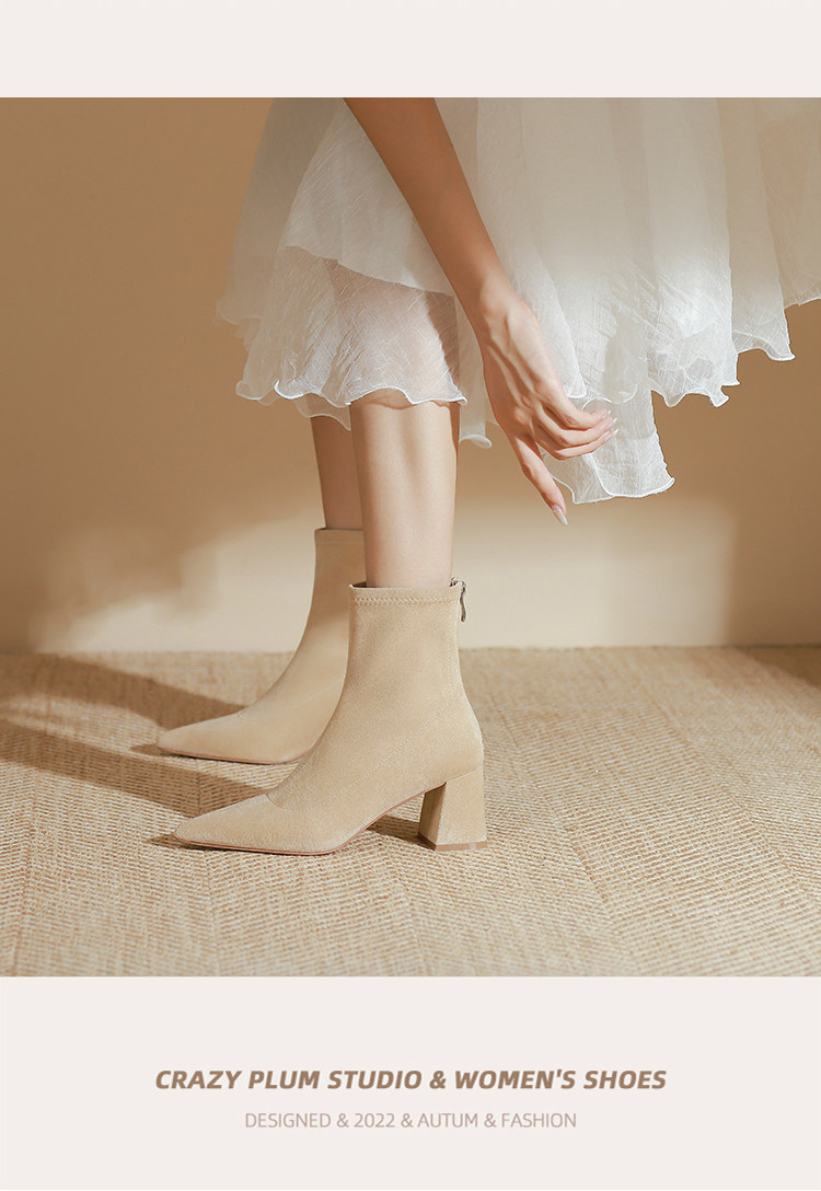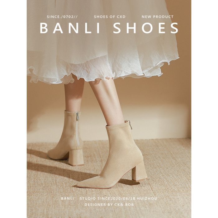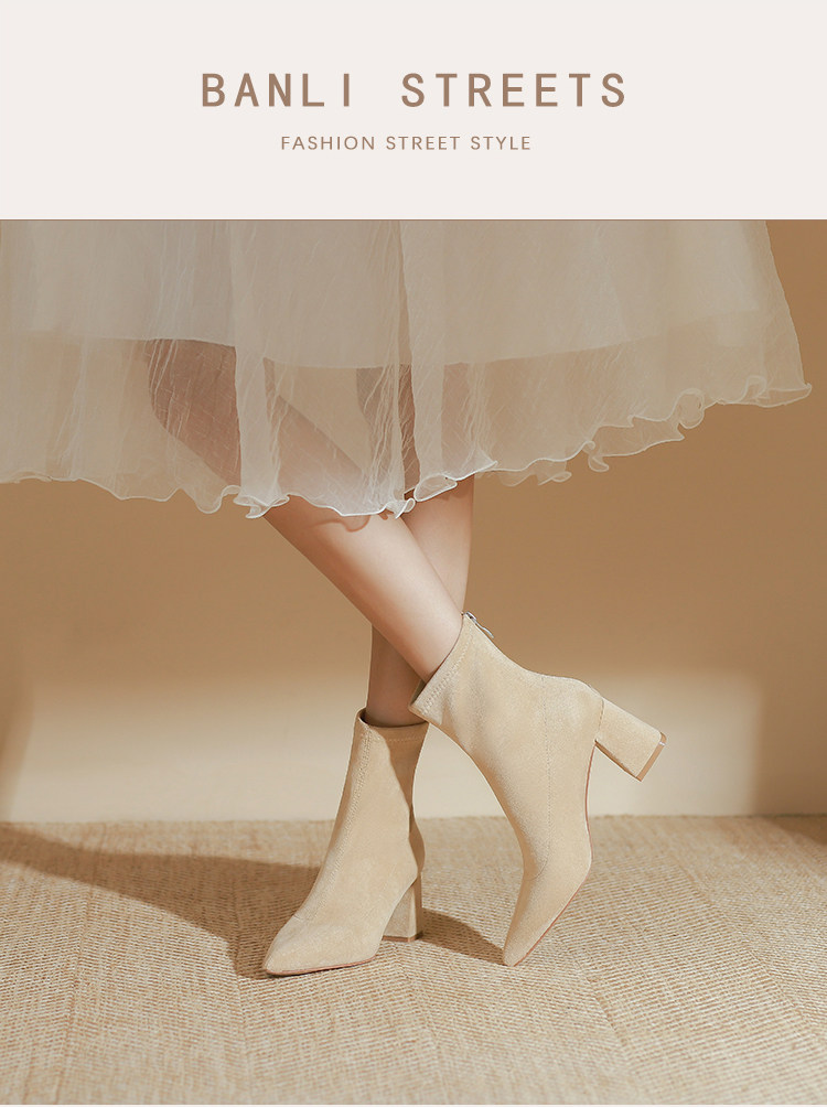 班麗韓系小踝靴粗跟短靴女2025年秋季新款杏色尖頭高跟短靴瘦瘦靴