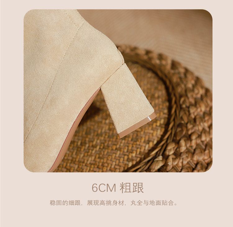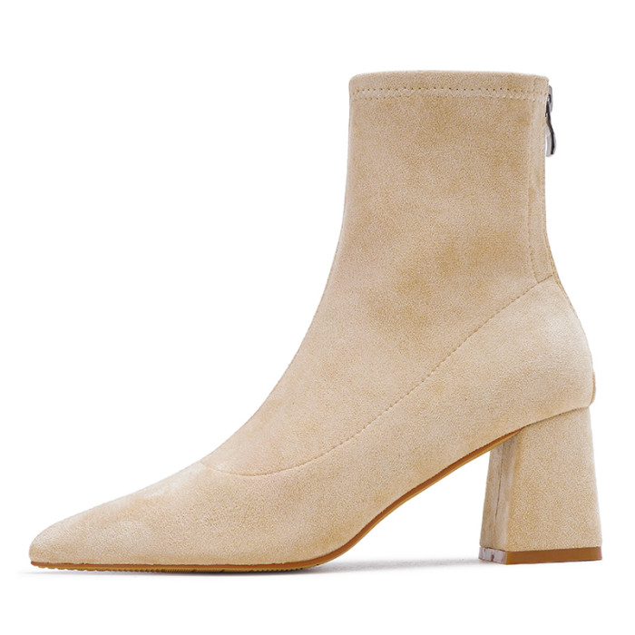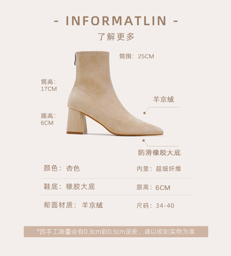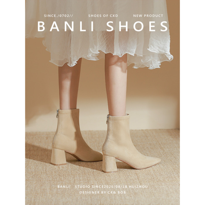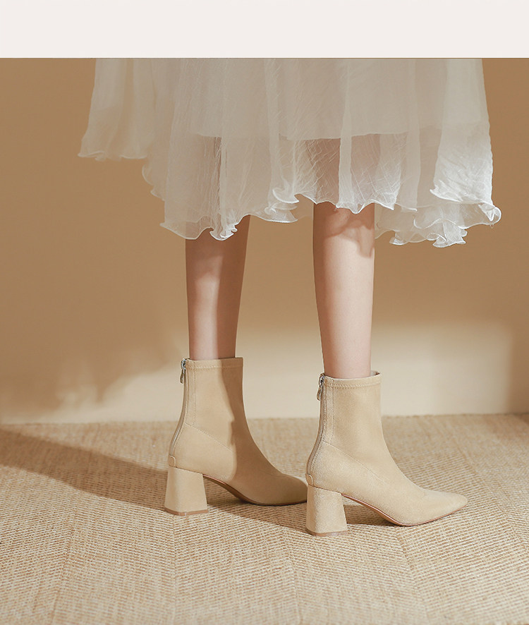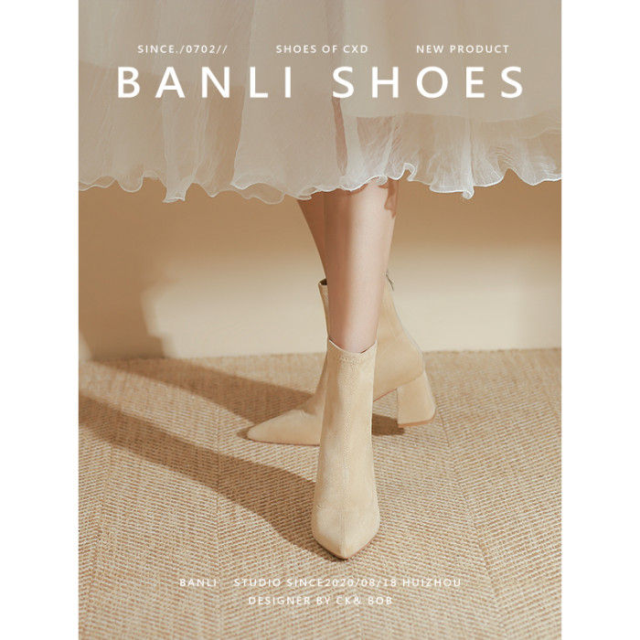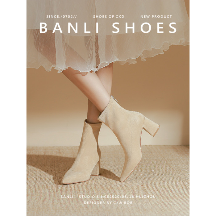 班麗韓系小踝靴粗跟短靴女2025年秋季新款杏色尖頭高跟短靴瘦瘦靴