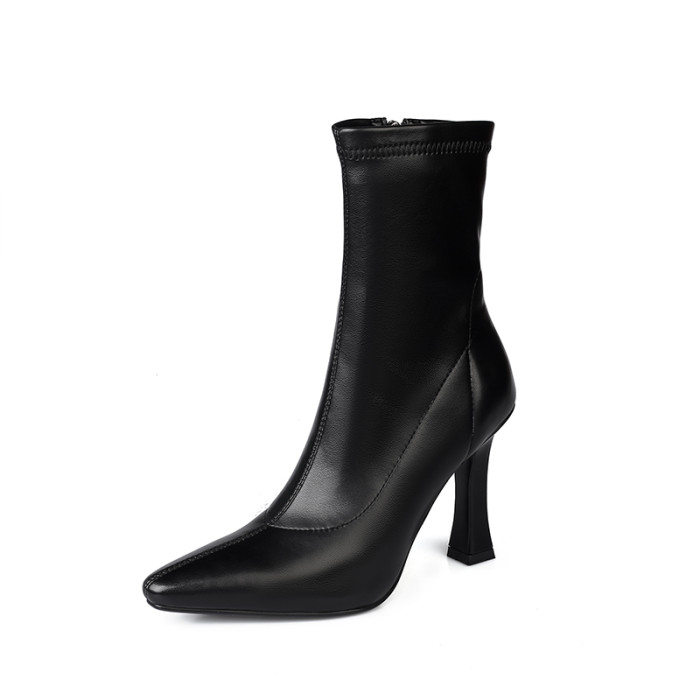 高跟短靴女2025新款冬季加絨小方頭瘦瘦靴真皮韓版顯瘦細跟高跟鞋