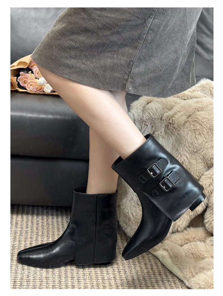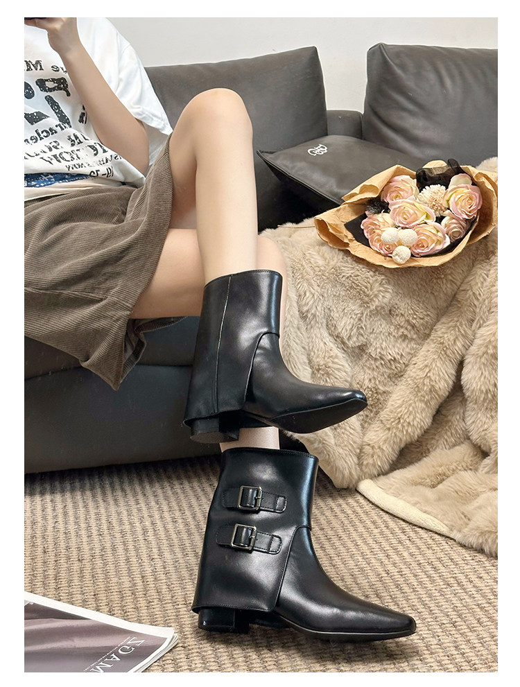 巨好看的復古真皮褲琯短靴女款2025新款冬季粗跟黑色加絨馬丁靴子