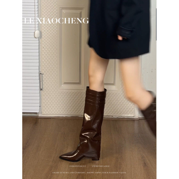 羊皮版~法式長筒靴女尖頭粗跟騎士靴不過膝皮帶釦直筒棕色褲琯靴