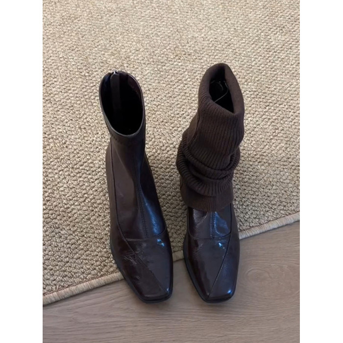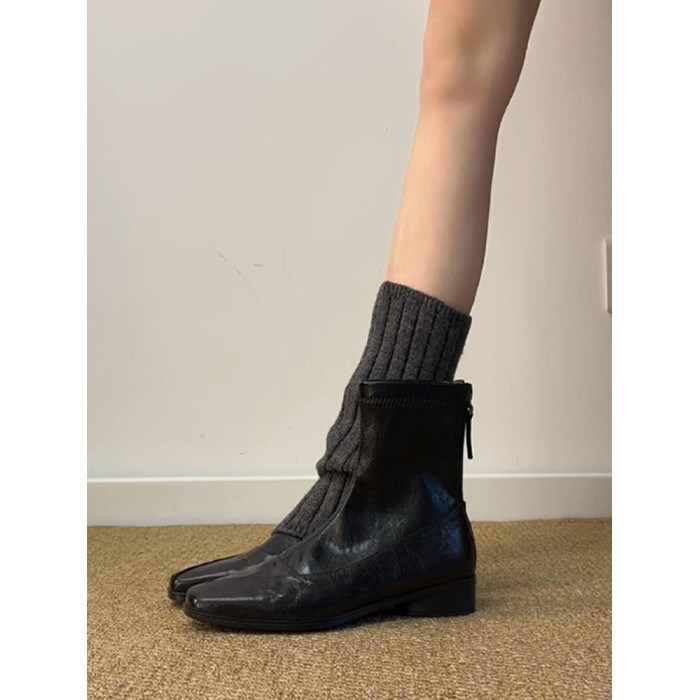羊皮版~真皮氣質方頭低跟瘦瘦靴女復古通勤百搭後拉鍊短靴馬丁靴