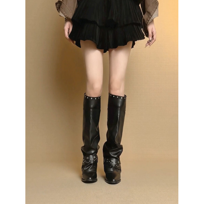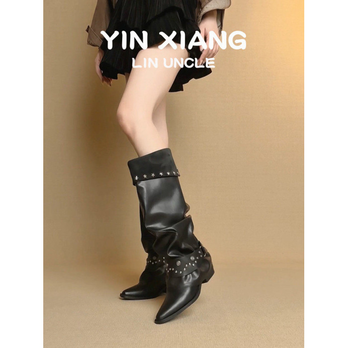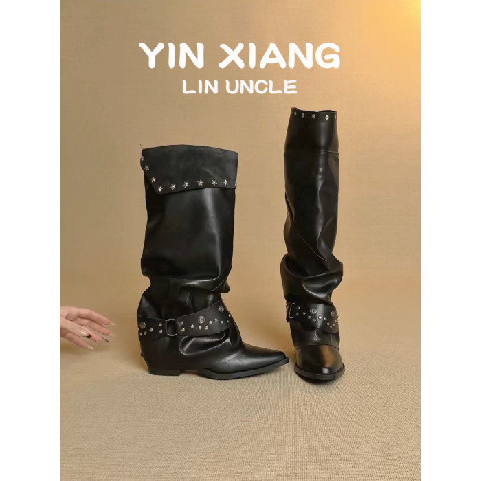 牛皮版~尖頭粗跟鉚釘褲琯靴女顯瘦皮帶釦堆堆騎士靴百搭高筒長靴