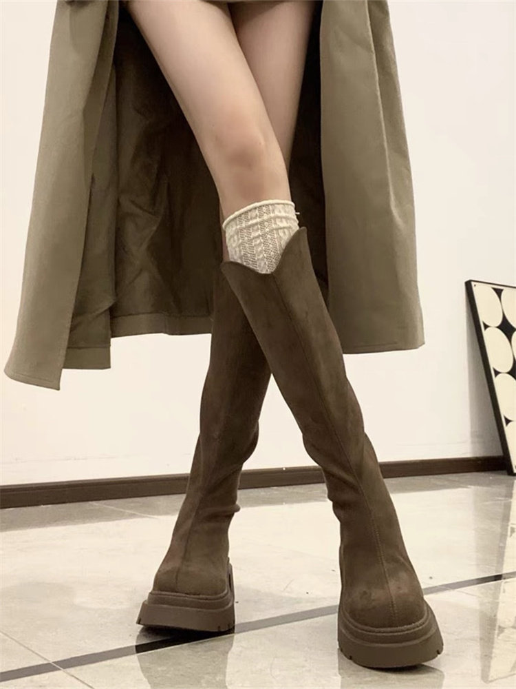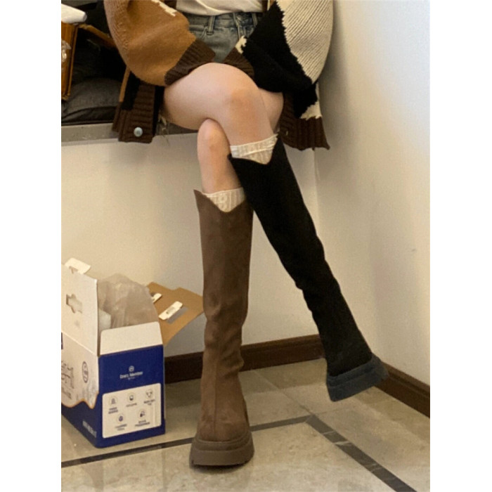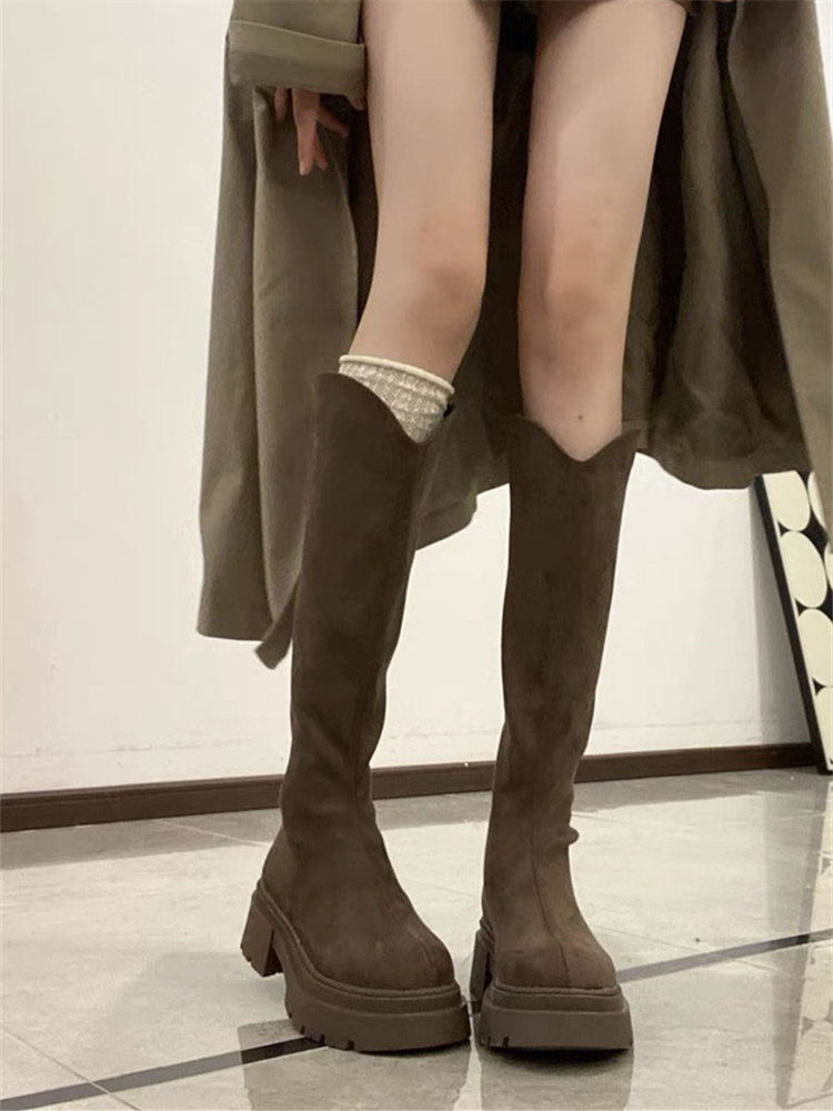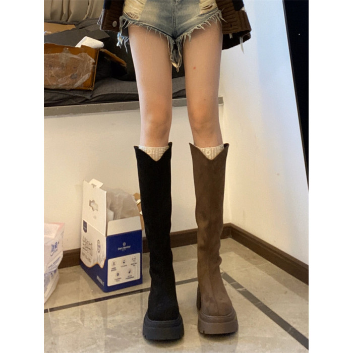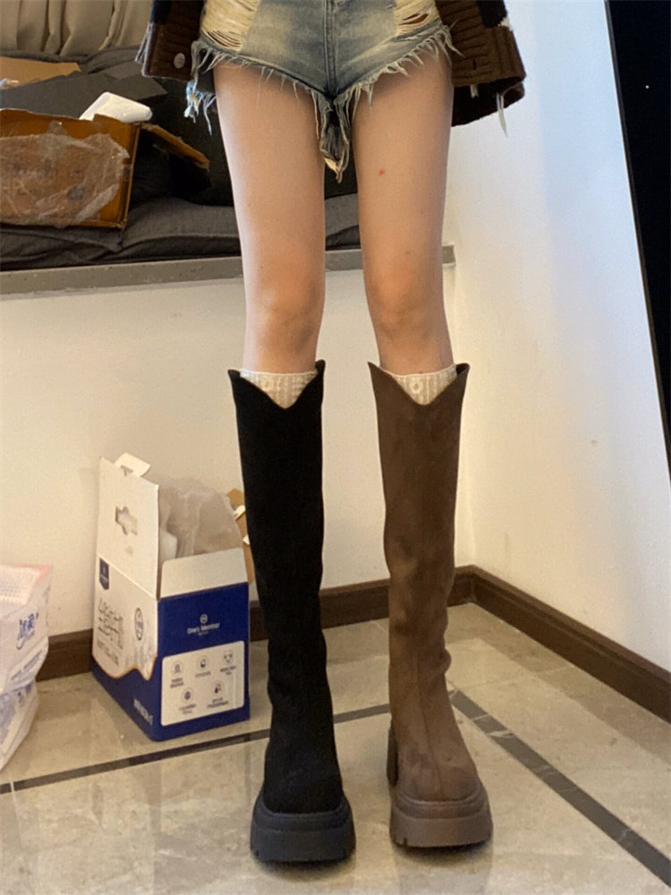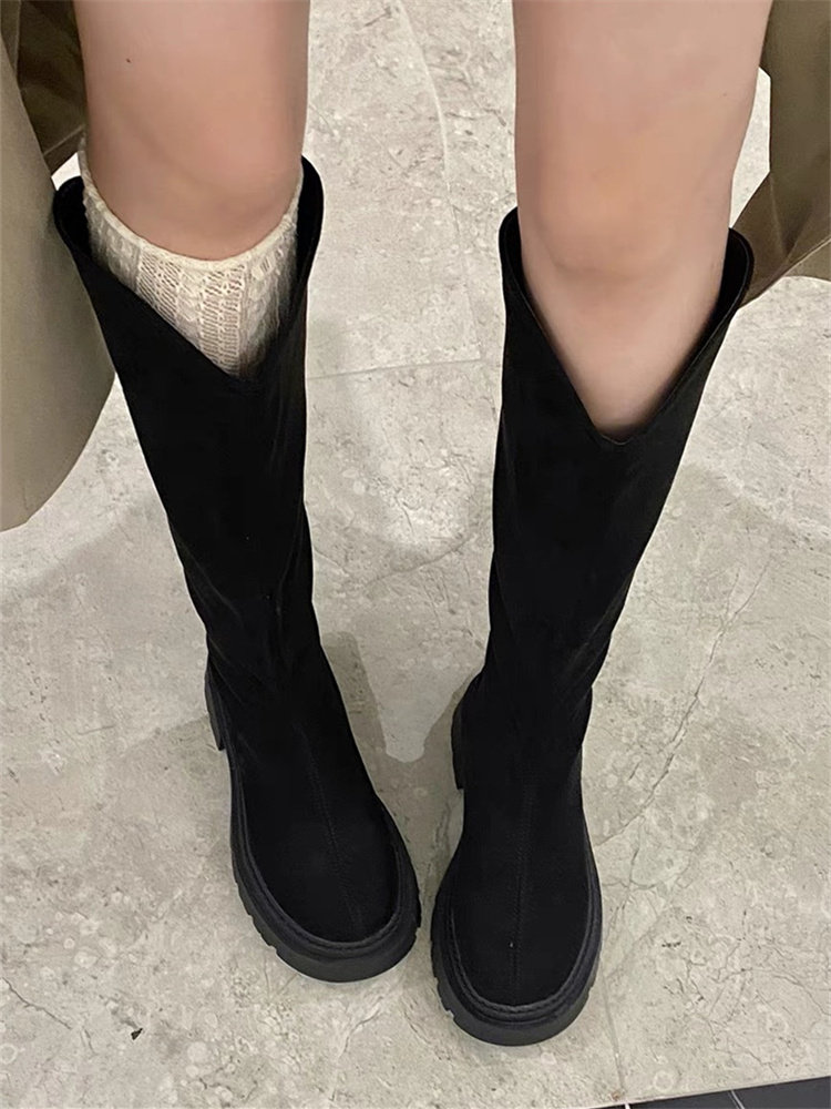 桃小姐絨面V口長筒靴女2025新款大筒圍粗腿大碼顯瘦厚底騎士靴子