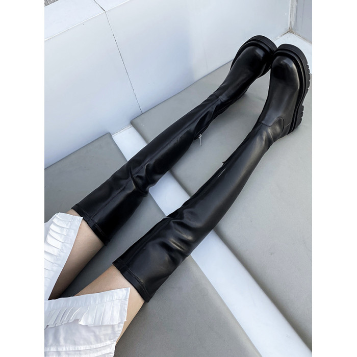 騎士靴女經典款春秋過膝彈力靴顯瘦圓頭平底中跟側拉鍊厚底長筒靴