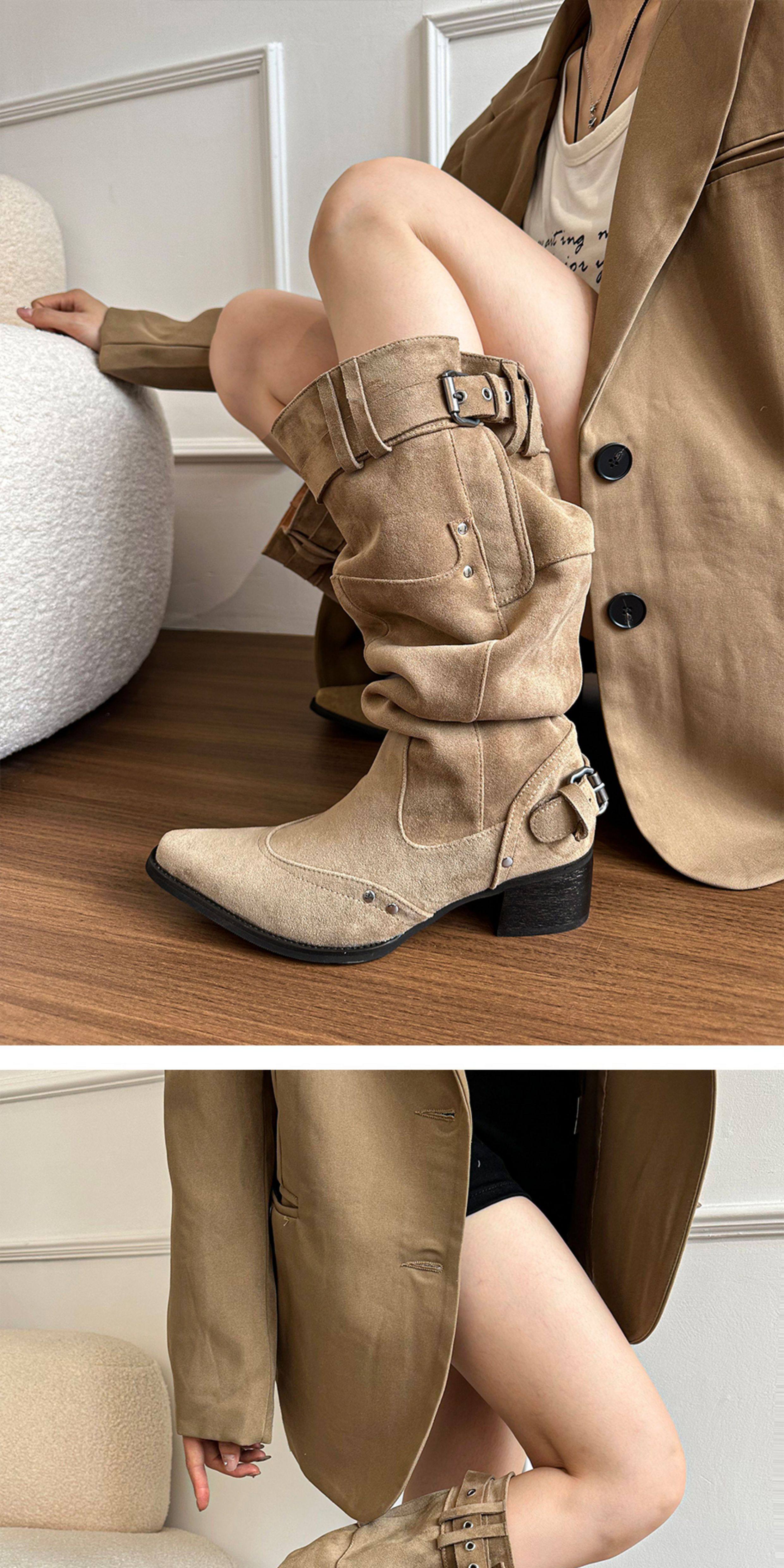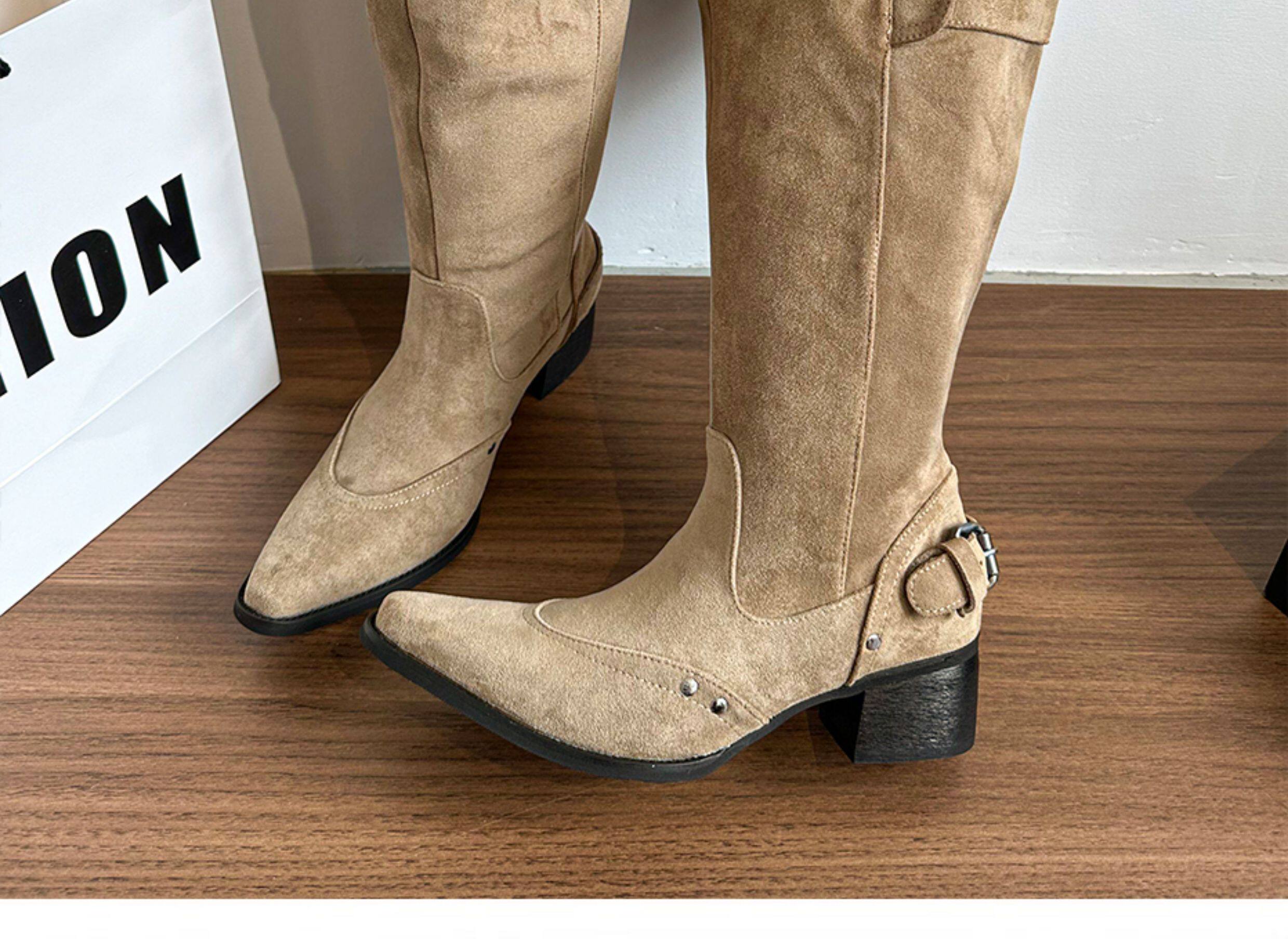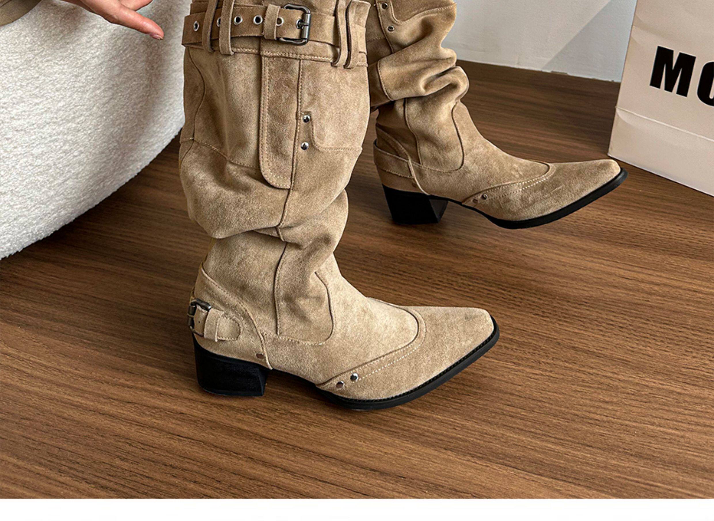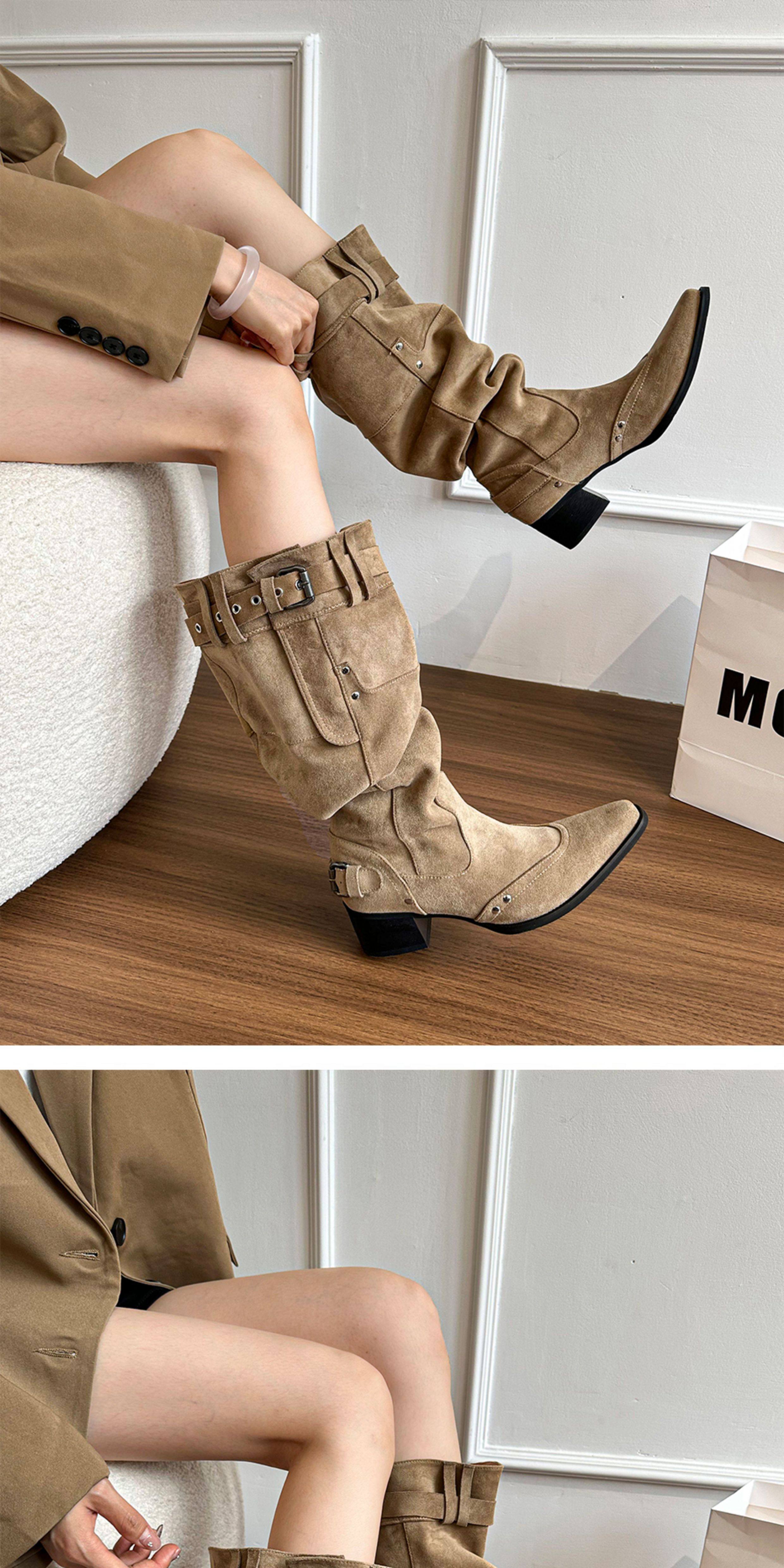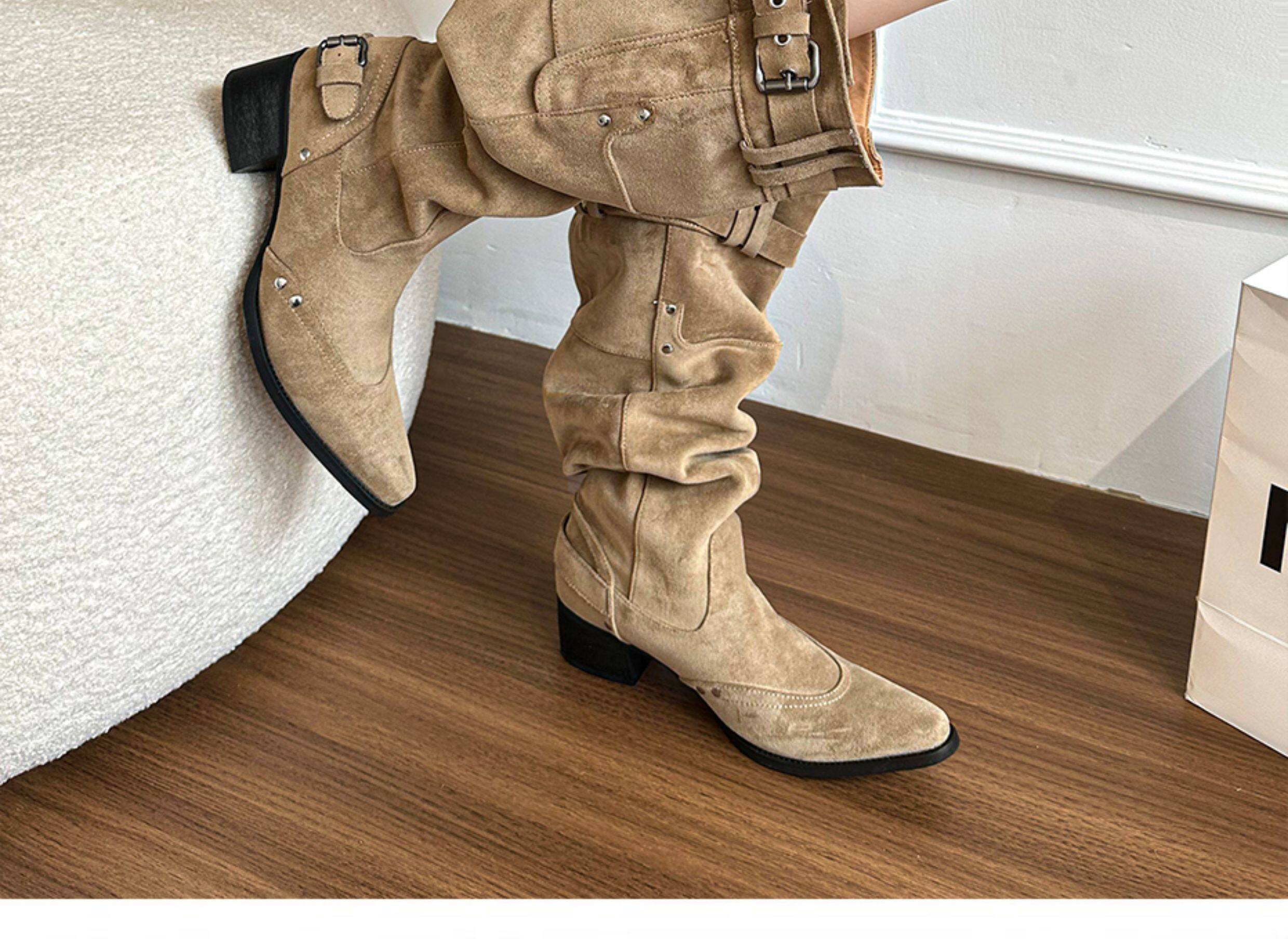 美拉德長靴女2026冬新款卡其色尖頭長筒靴子女粗跟棕色褶皺堆堆靴