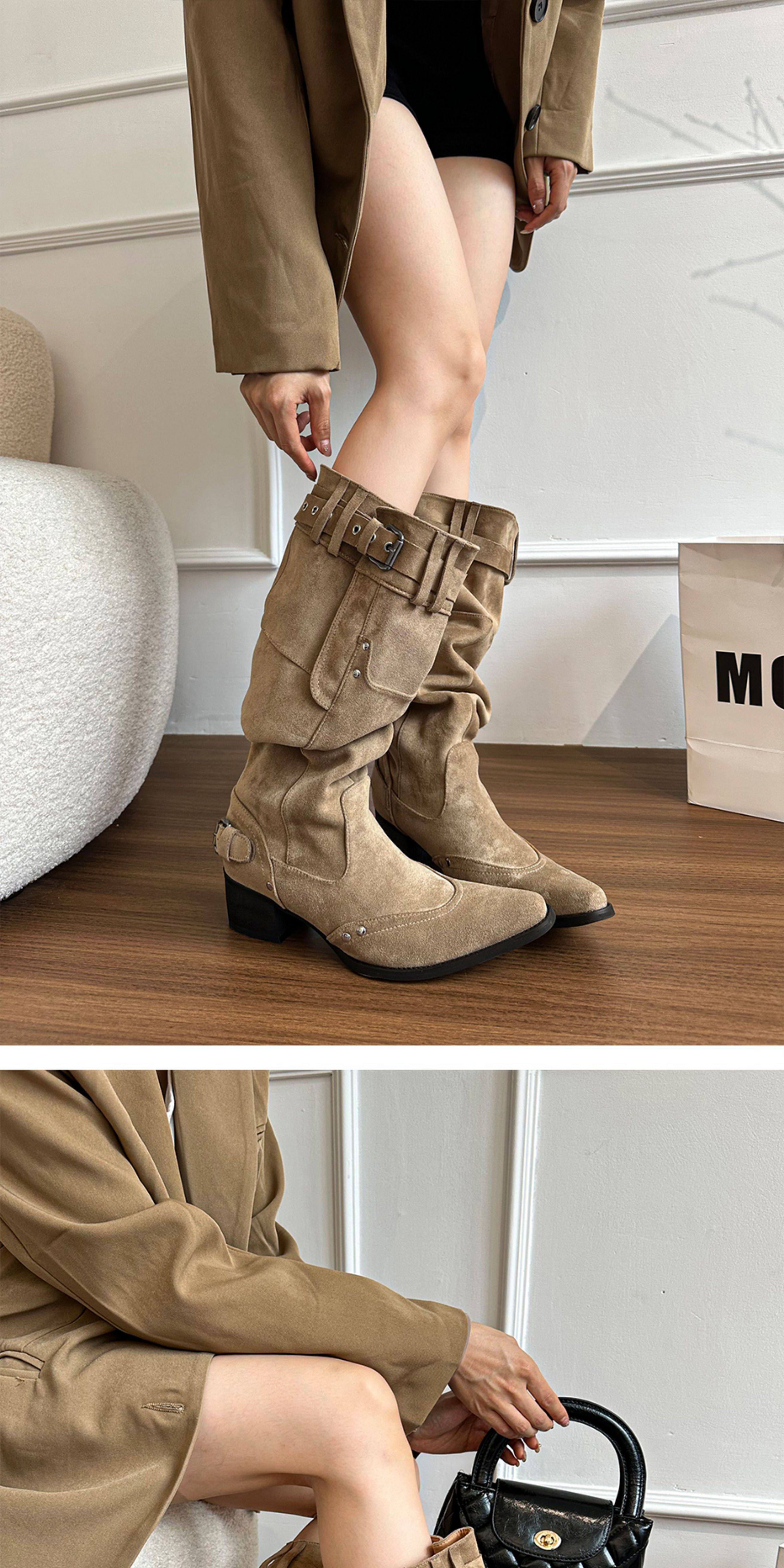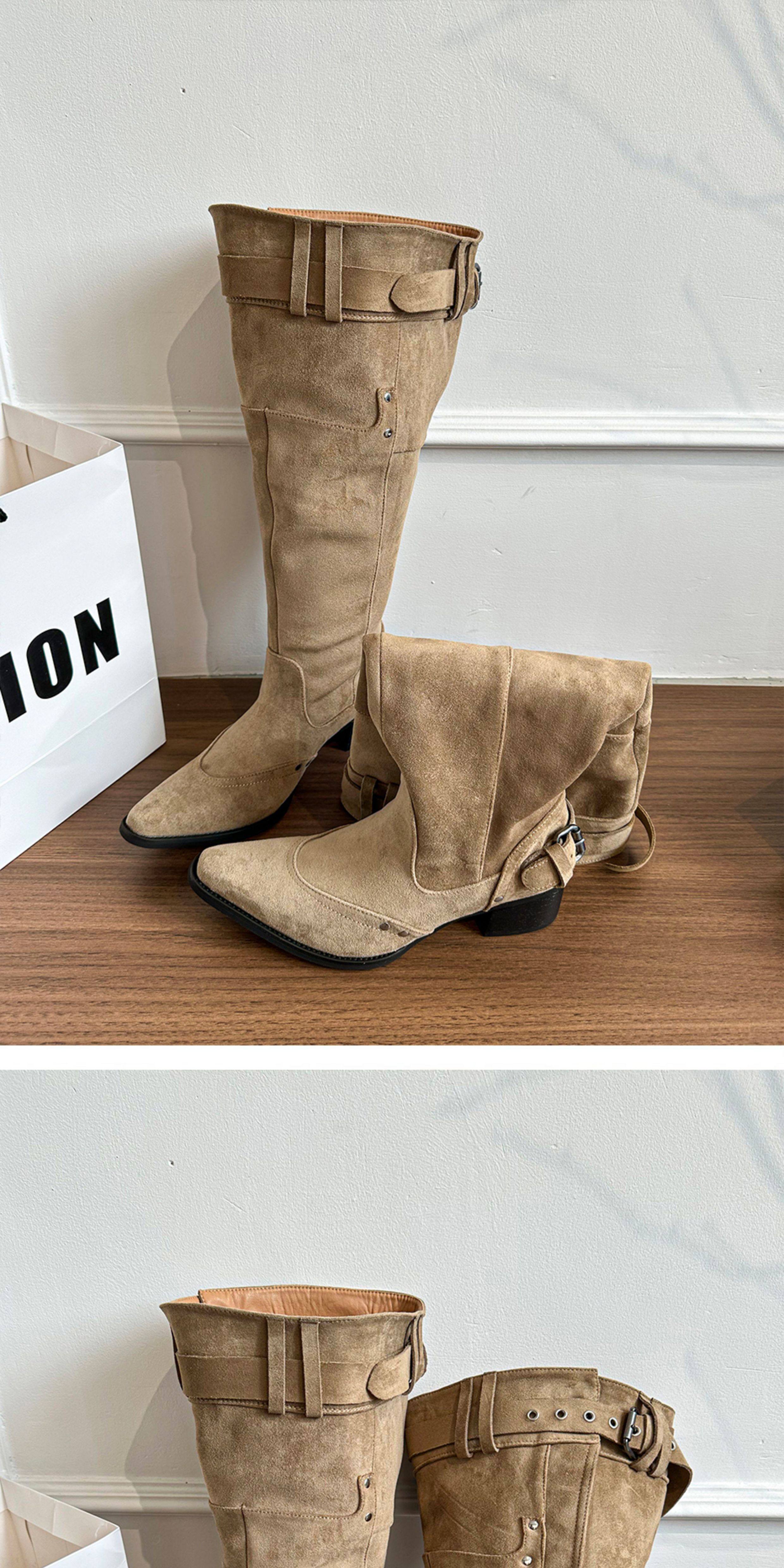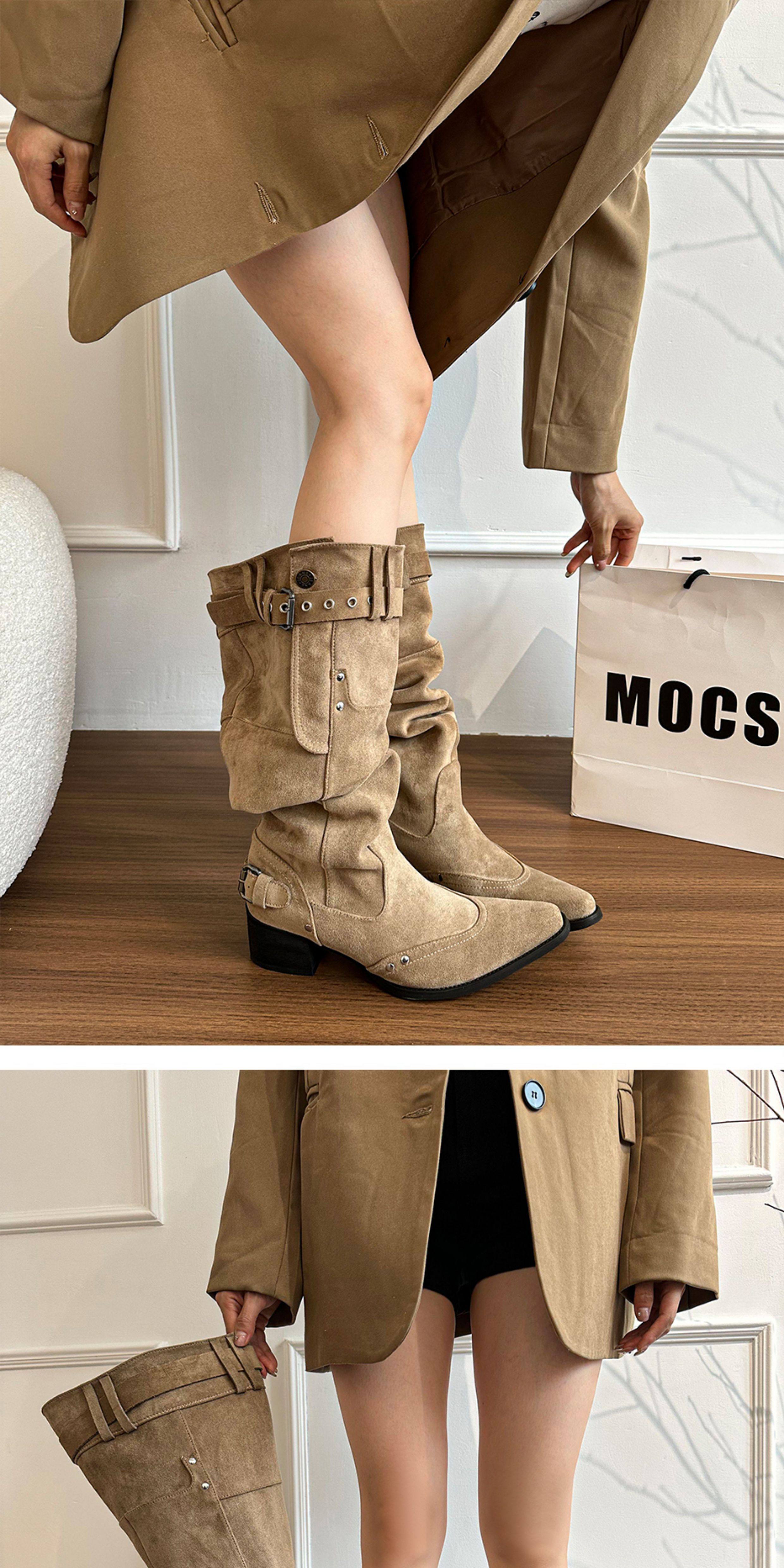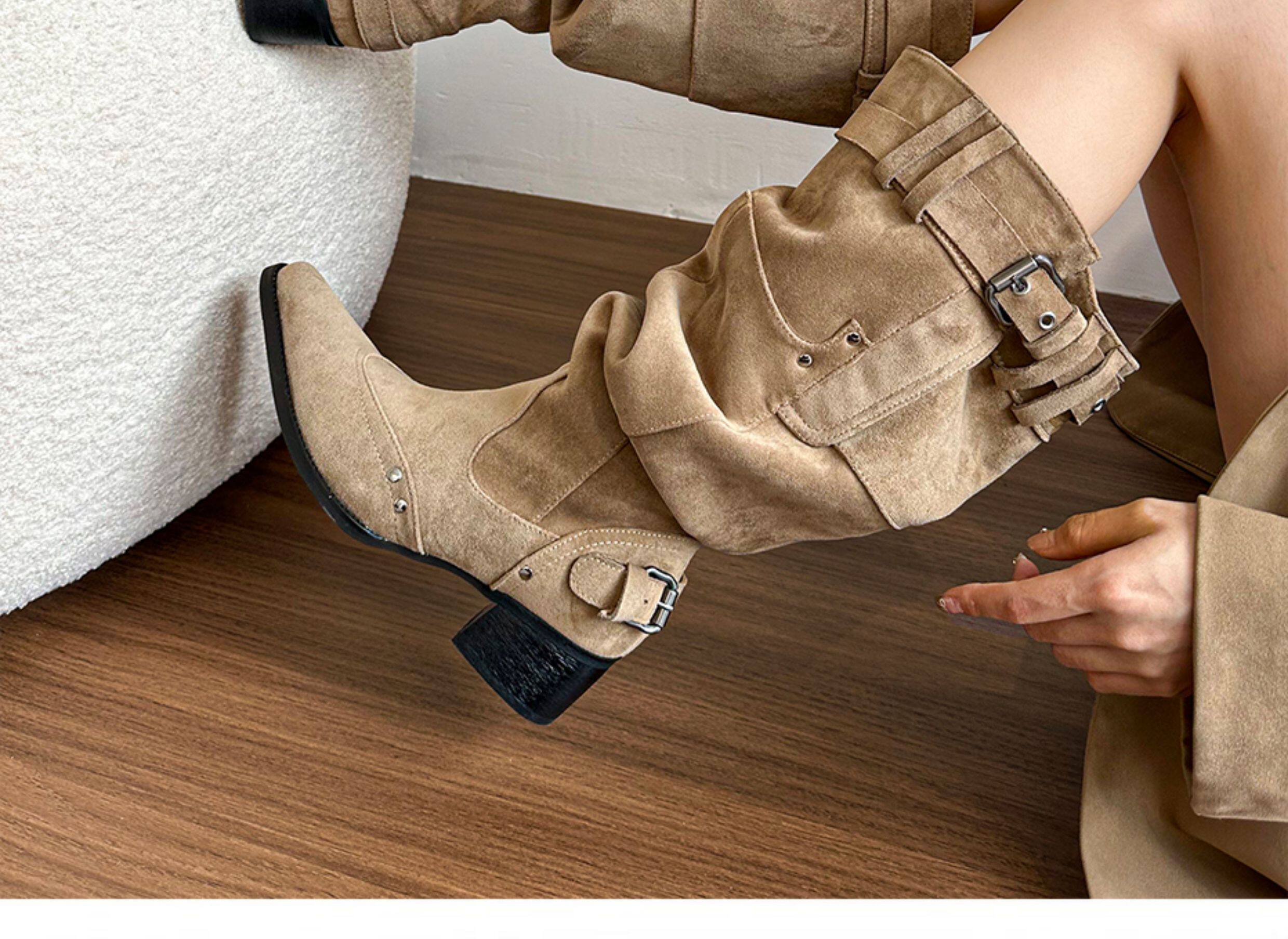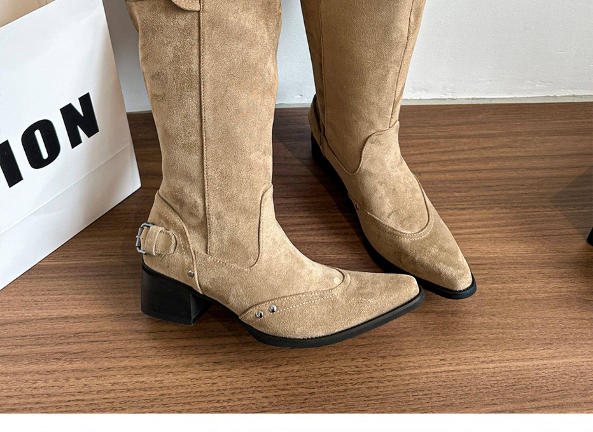 美拉德長靴女2026冬新款卡其色尖頭長筒靴子女粗跟棕色褶皺堆堆靴