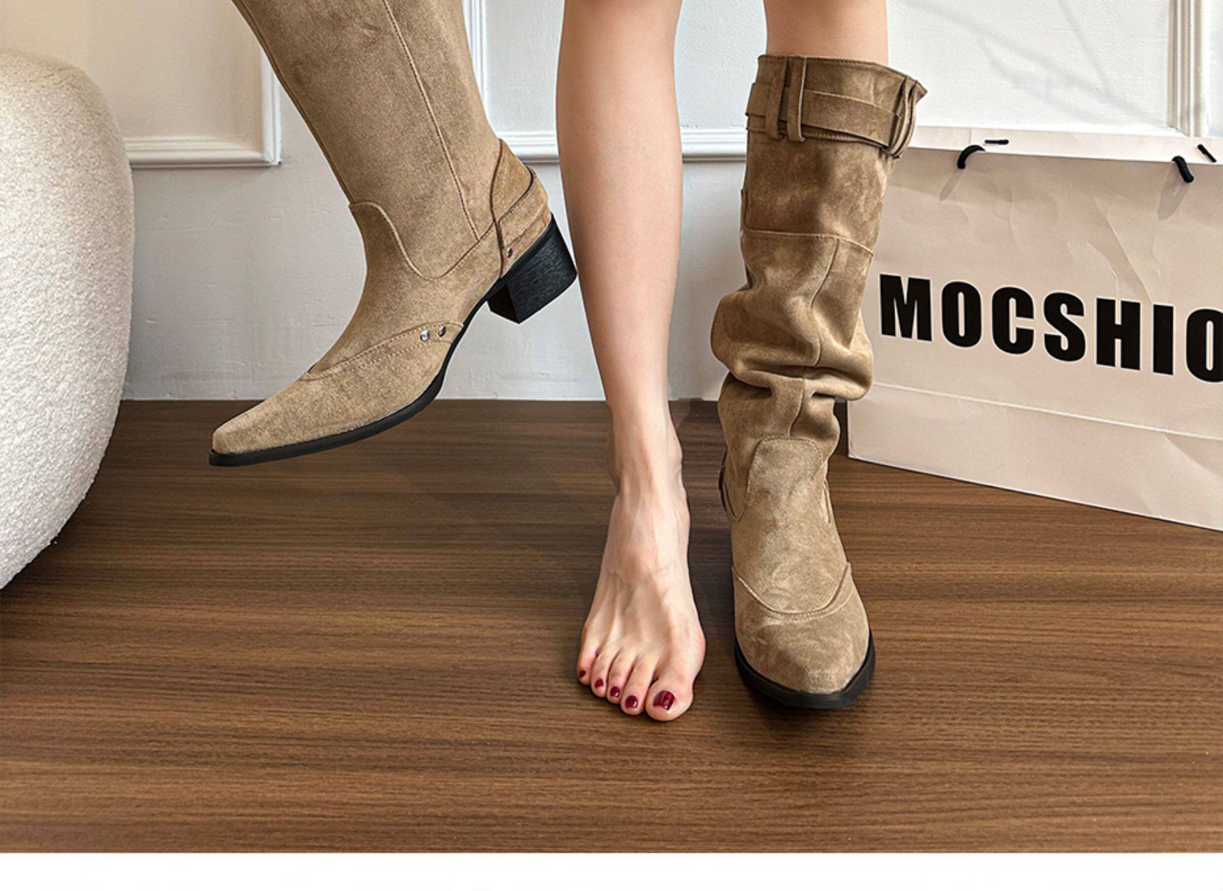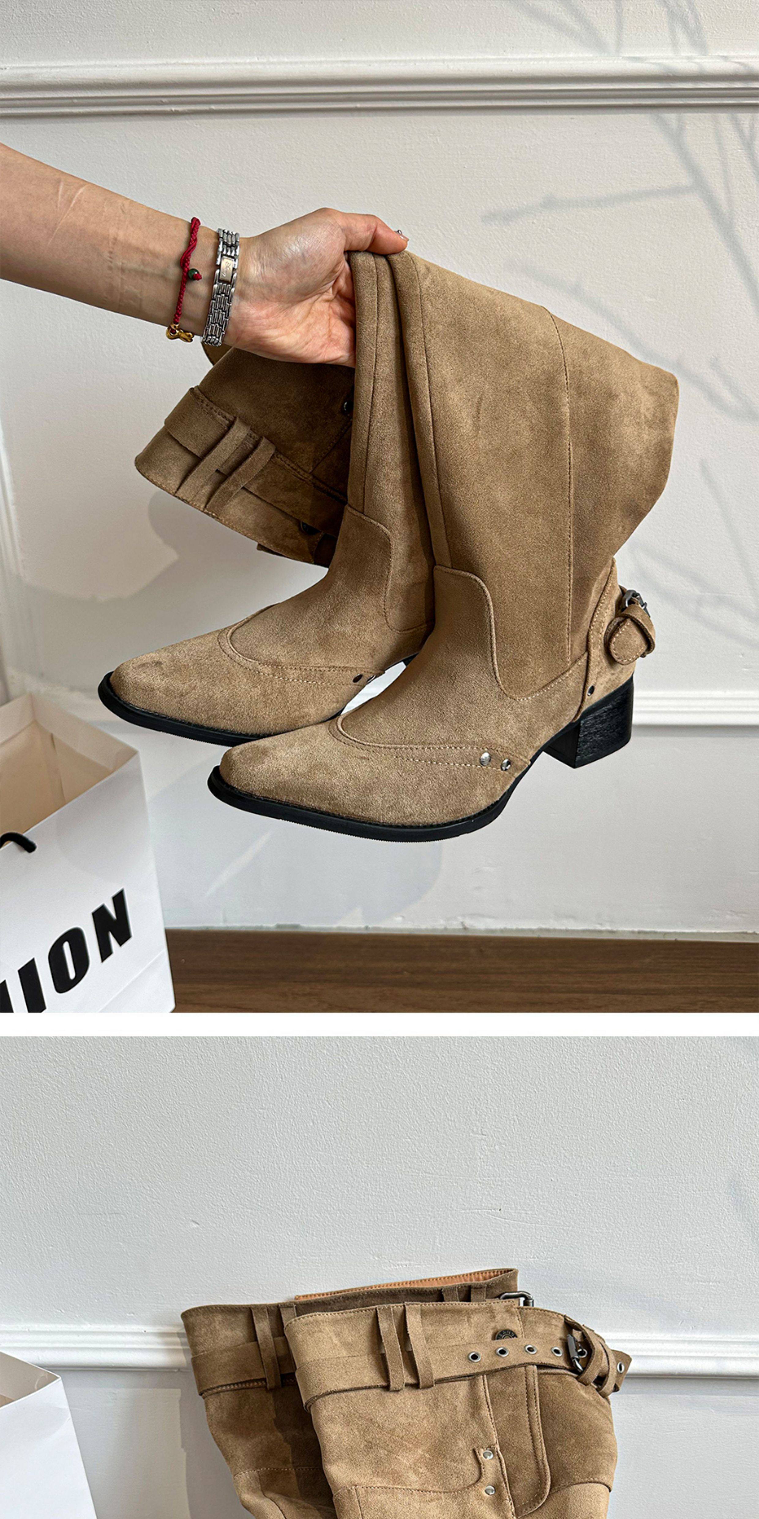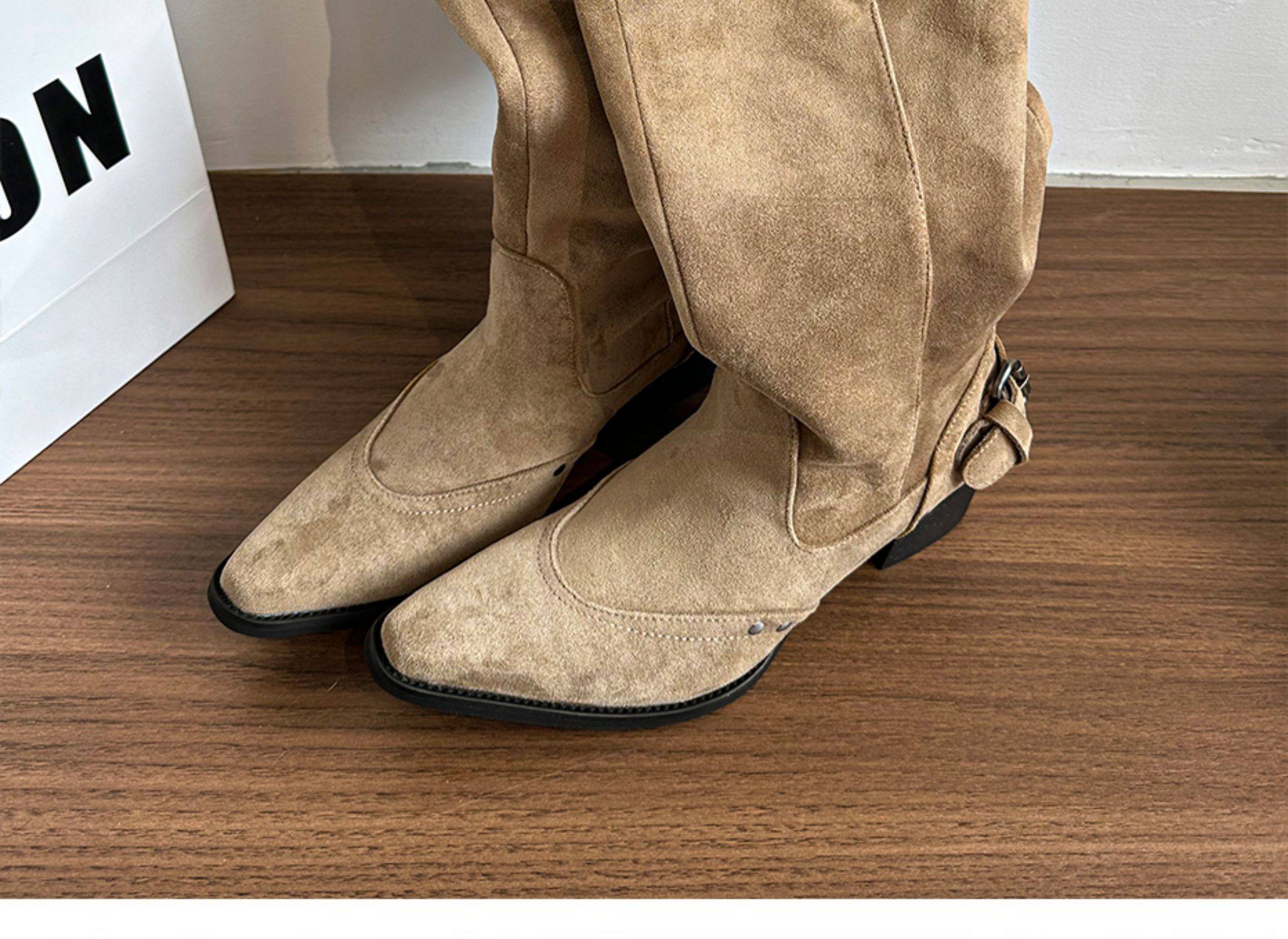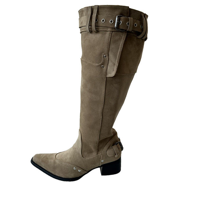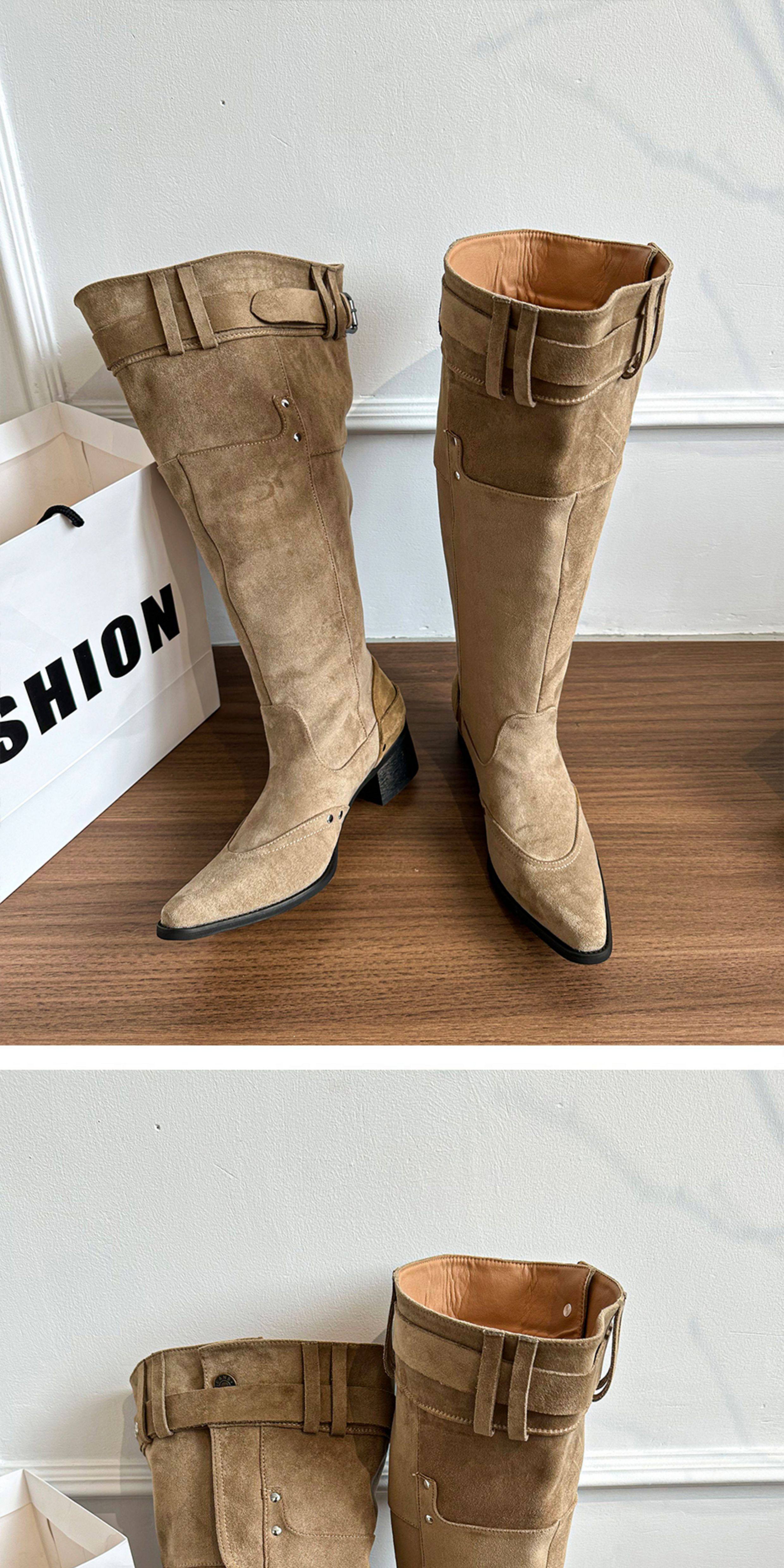 美拉德長靴女2026冬新款卡其色尖頭長筒靴子女粗跟棕色褶皺堆堆靴