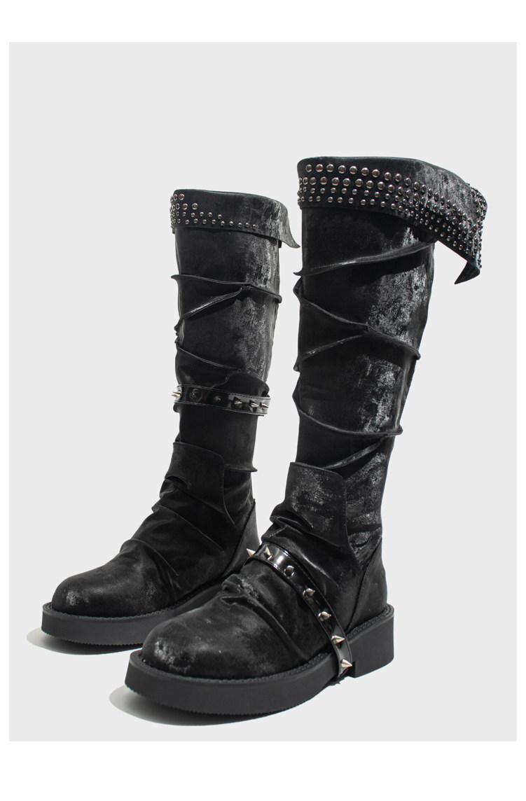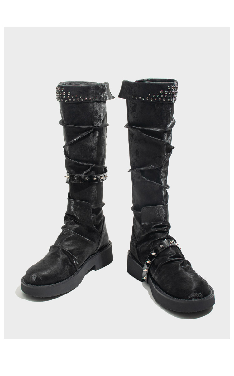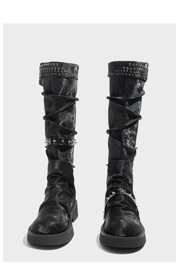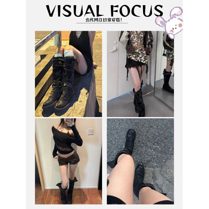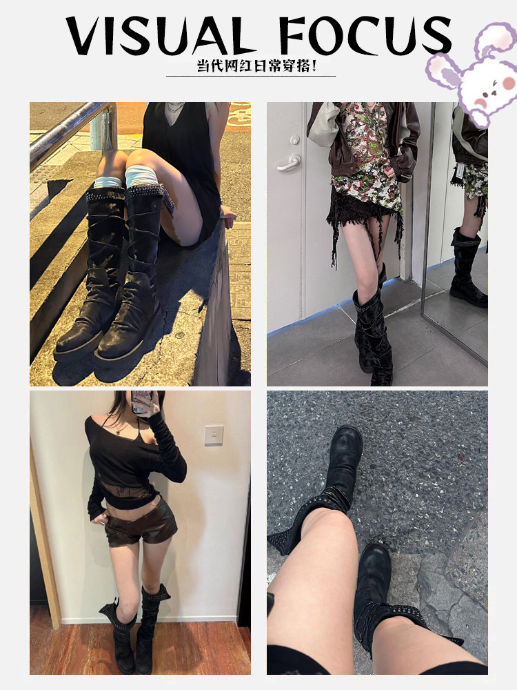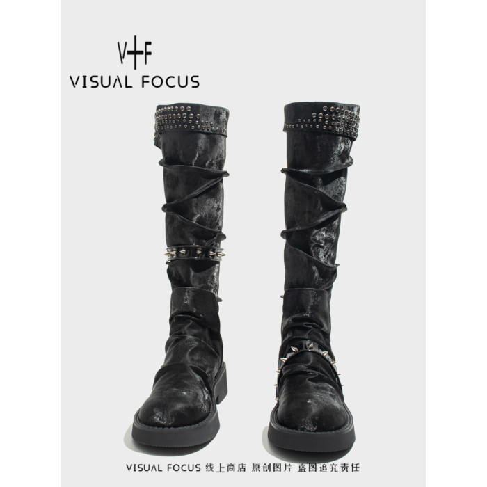 Visual focus 厚底長筒靴女重金屬鉚釘騎士靴辣妹y2k高筒機車靴子