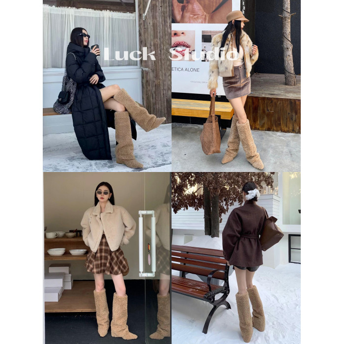 幸運說~高級感加絨褲琯靴女款坡跟尖頭顯瘦白色羊羔毛保暖長筒靴
