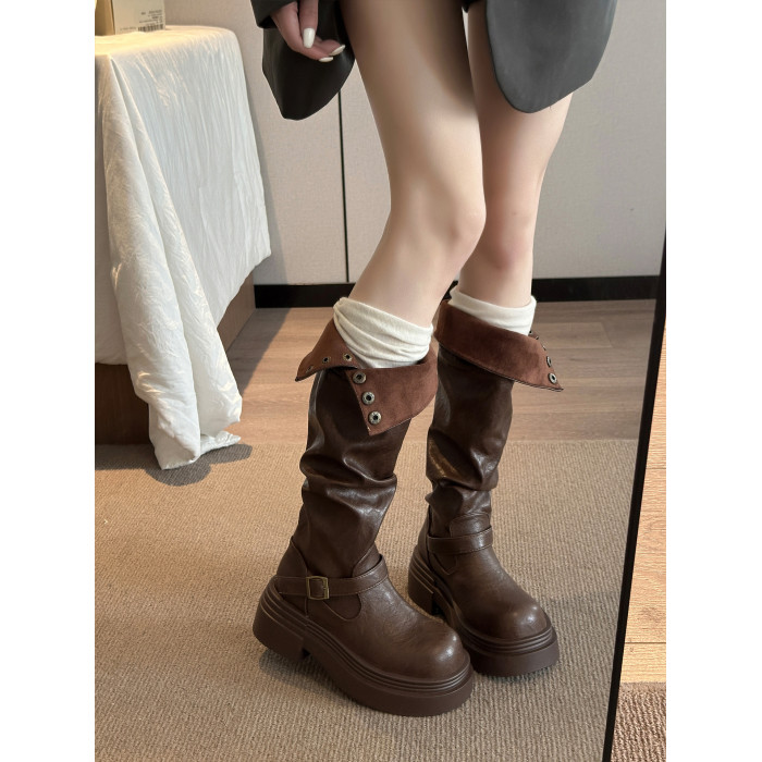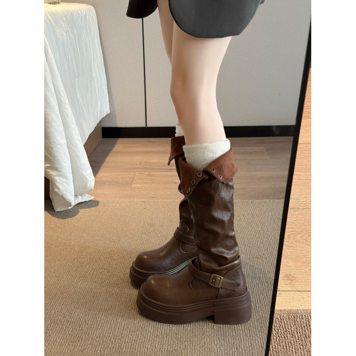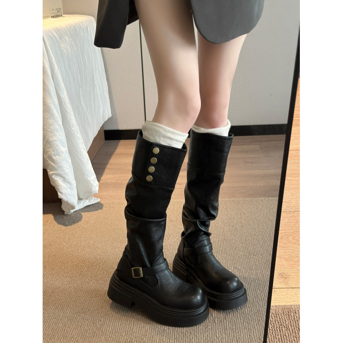 西部牛仔長筒靴女2026秋冬新款厚底皮帶釦堆堆靴騎士靴顯瘦高筒靴