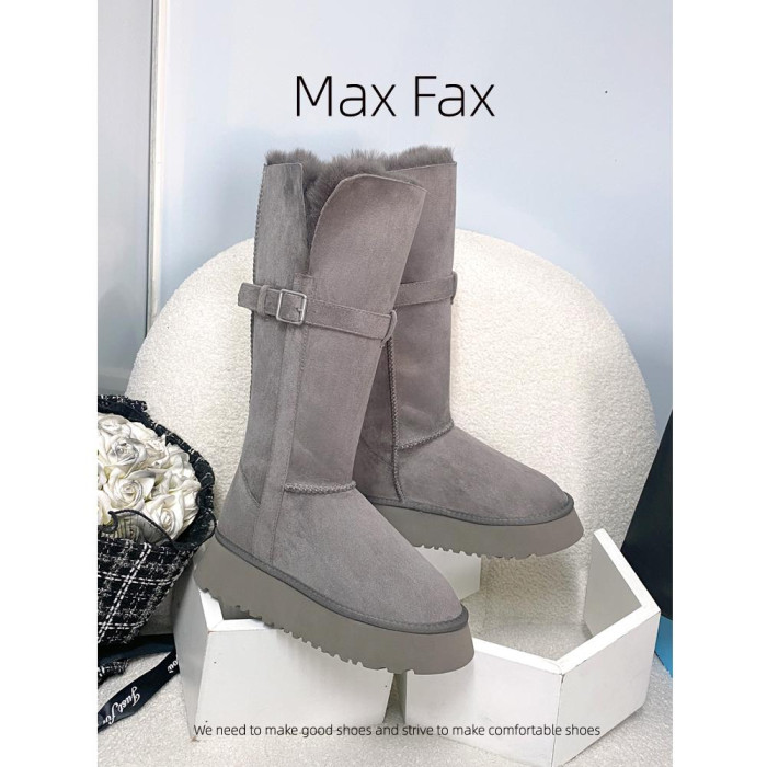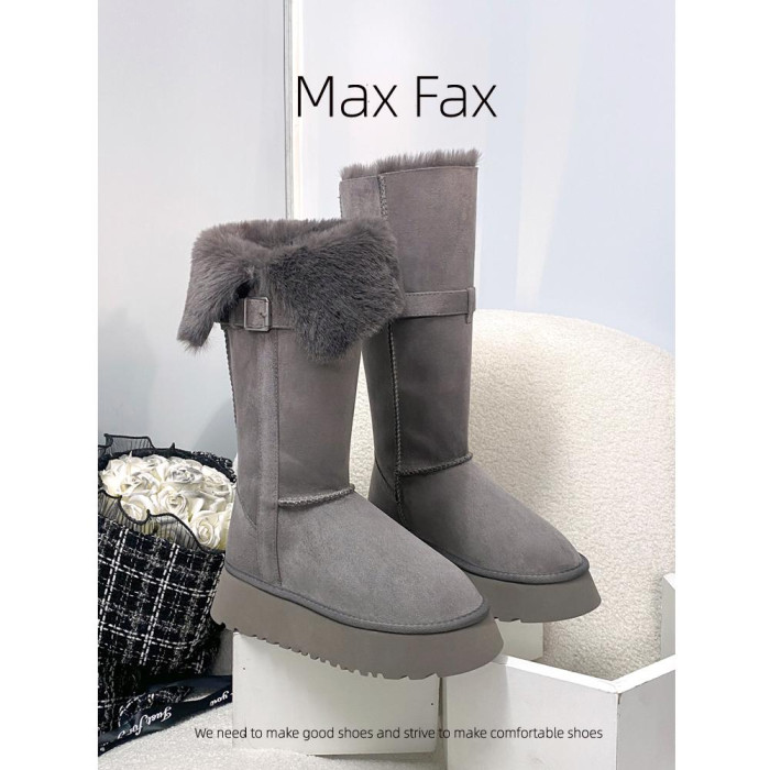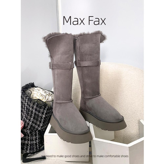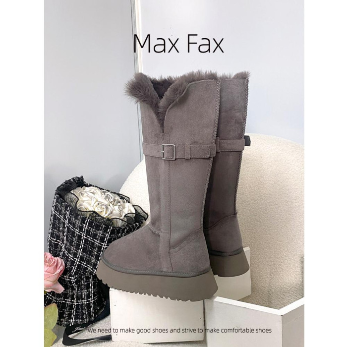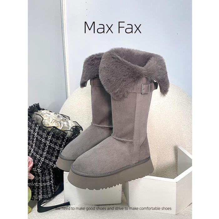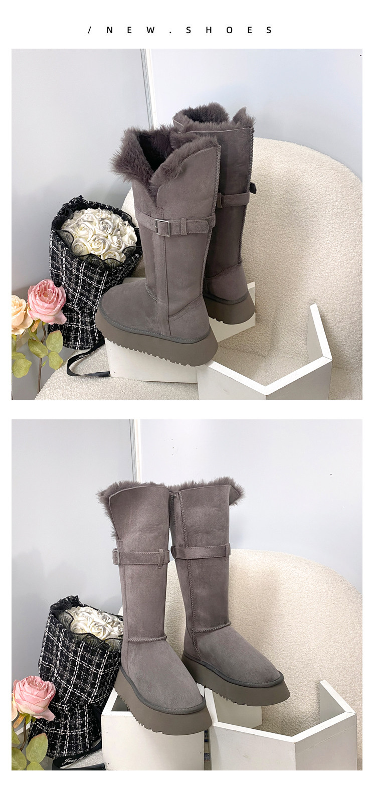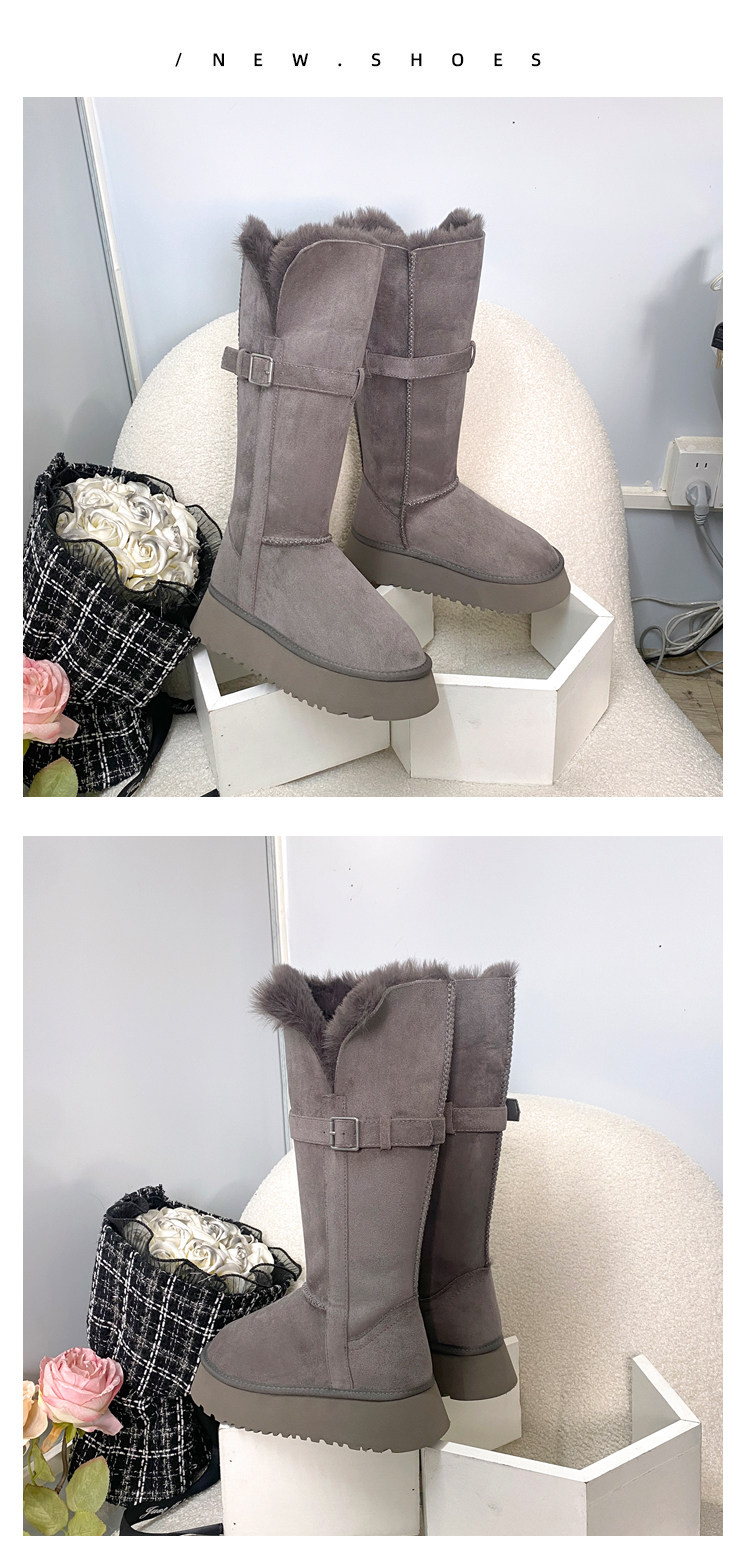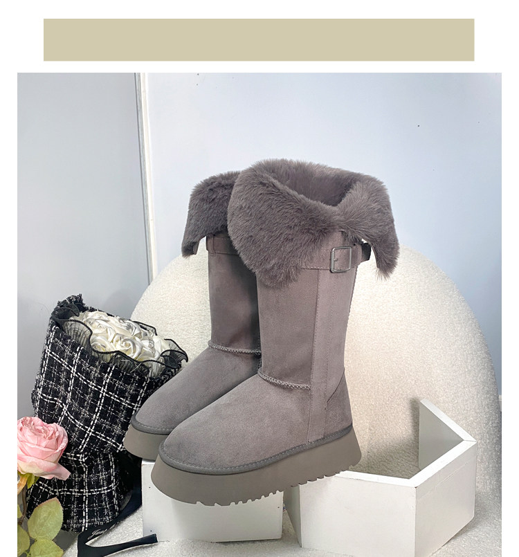兩穿灰色時髦雪地靴女冬加絨保暖大棉鞋女中高筒皮帶釦厚底長靴子
